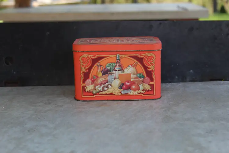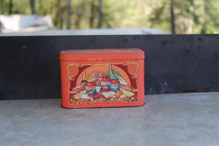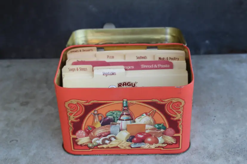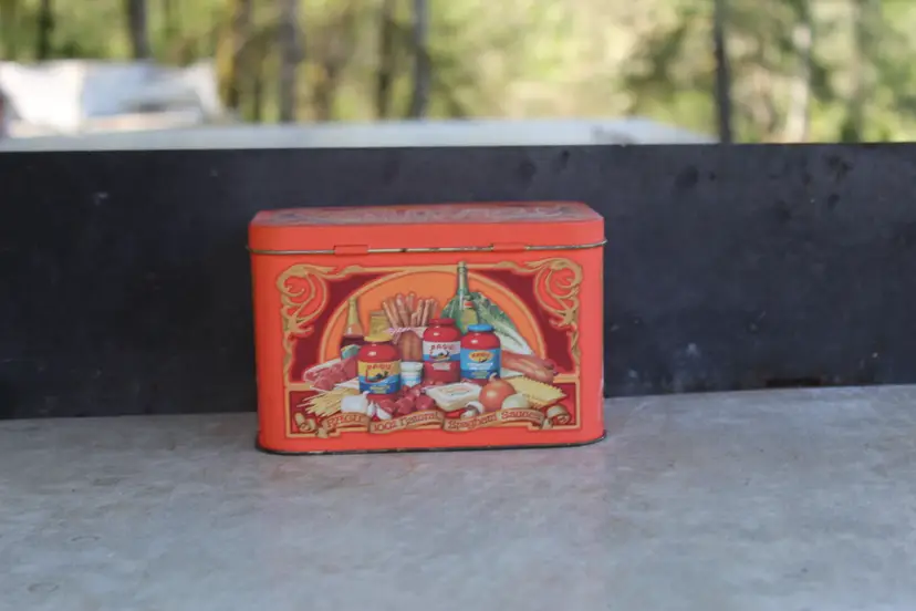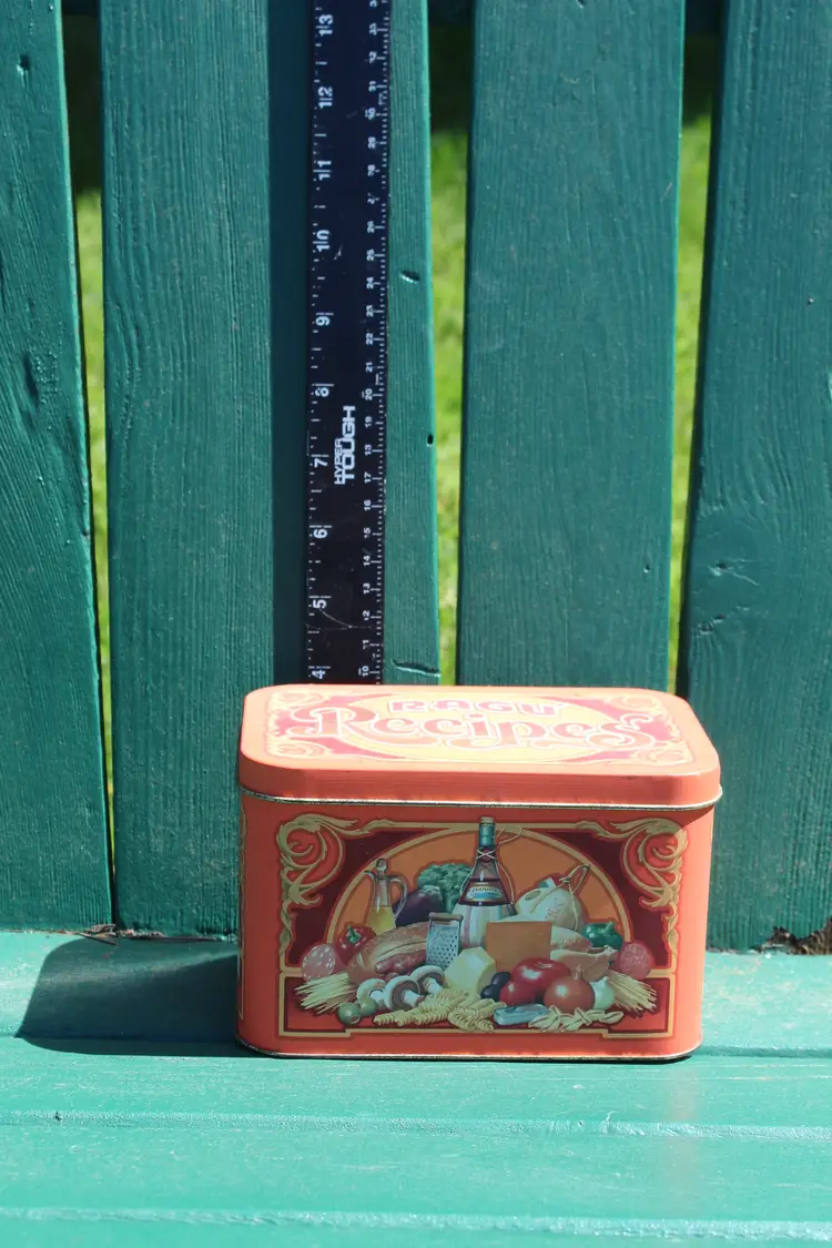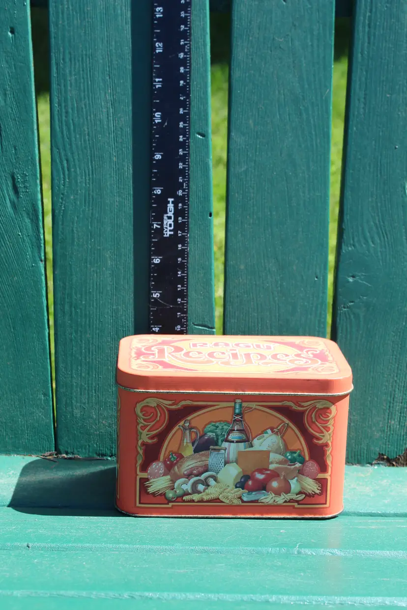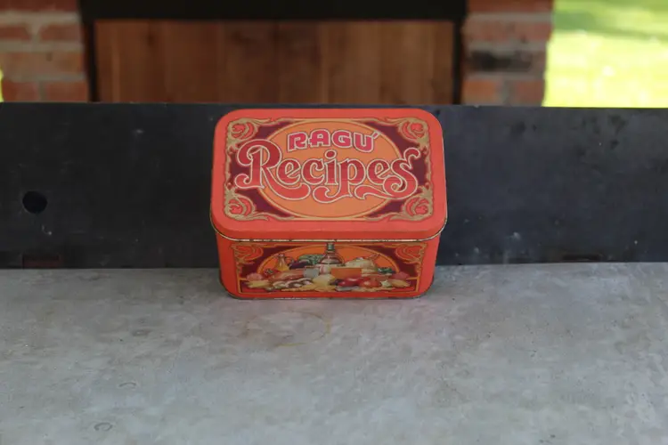 This vintage RAGU Recipes tin is a must-have for collectors of advertising memorabilia. It has the original recipes and a few handwritten ones. Made in England in the 1980s, this 6" x 4" tin features colorful branding and is perfect for storing small items or displaying on a shelf. The type of advertising is a classic tin, making it a great addition to any collection. The colorful multi-color design adds to its appeal, and the fact that it was made in the United Kingdom adds to its unique history. This tin is a great find for anyone interested in collectibles or RAGU brand history. This was an estate sale find. Please see all photos for condition. This is the actual product you wil be purchasing.