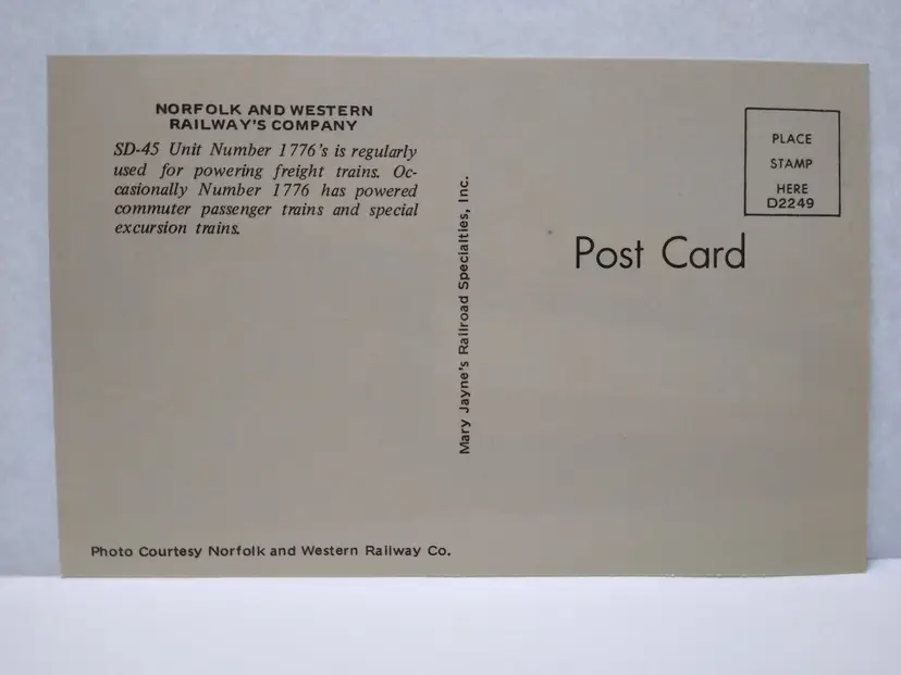 Size: Standard (5.5 x 3.5 in) Custom Bundle: No Personalize: No Type: Printed (Lithograph) Year Manufactured: 1970 Number of Items in Set: 1 Original/Licensed Reprint: Original Occasion: Historical Time Period Manufactured: 1970-1979 Unit of Sale: Single Unit Era: Post-War (1945-Now) Artist: Unknown Country/Region of Manufacture: United States Material: Paper Theme: Train, Railroad, Locomotive, 1776, Patriotic, Transportation Subject: Train Postage Condition: Unposted Brand/Publisher: Mary Jayne's Railroad Specialties Inc. Franchise: Mary Jayne