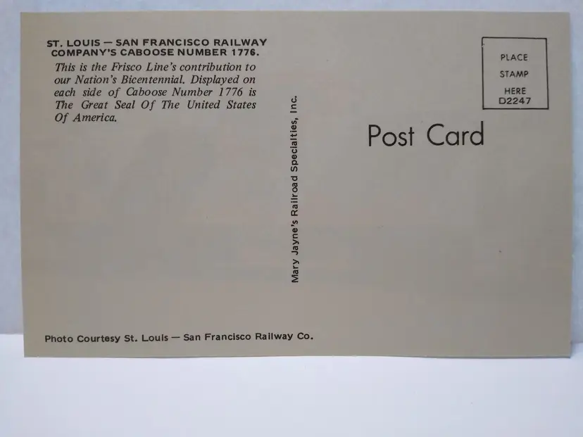 Size: Standard (5.5 x 3.5 in) Custom Bundle: No Personalize: No Type: Printed (Lithograph) Year Manufactured: 1970 Number of Items in Set: 1 Original/Licensed Reprint: Original Occasion: Historical Time Period Manufactured: 1970-1979 Unit of Sale: Single Unit Era: Post-War (1945-Now) Artist: Unknown Country/Region of Manufacture: United States Material: Paper Theme: Train, Railroad, Locomotive, 1776, Patriotic, Transportation Subject: Train Postage Condition: Unposted Brand/Publisher: Mary Jayne's Railroad Specialties Inc. Franchise: Mary Jayne