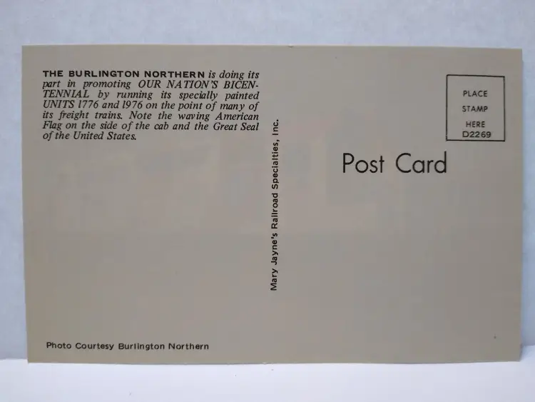 Size: Standard (5.5 x 3.5 in) Custom Bundle: No Personalize: No Type: Printed (Lithograph) Year Manufactured: 1970 Number of Items in Set: 1 Original/Licensed Reprint: Original Occasion: Historical Time Period Manufactured: 1970-1979 Unit of Sale: Single Unit Era: Post-War (1945-Now) Artist: Unknown Country/Region of Manufacture: United States Material: Paper Theme: Train, Railroad, Locomotive, Railway, 1976, 1776, Bicentennial, Spirit Of 1776, Patriotic, Transportation Subject: Railway Postage Condition: Unposted Brand/Publisher: Mary Jayne's Railroad Specialties Inc. Franchise: Mary Jayne