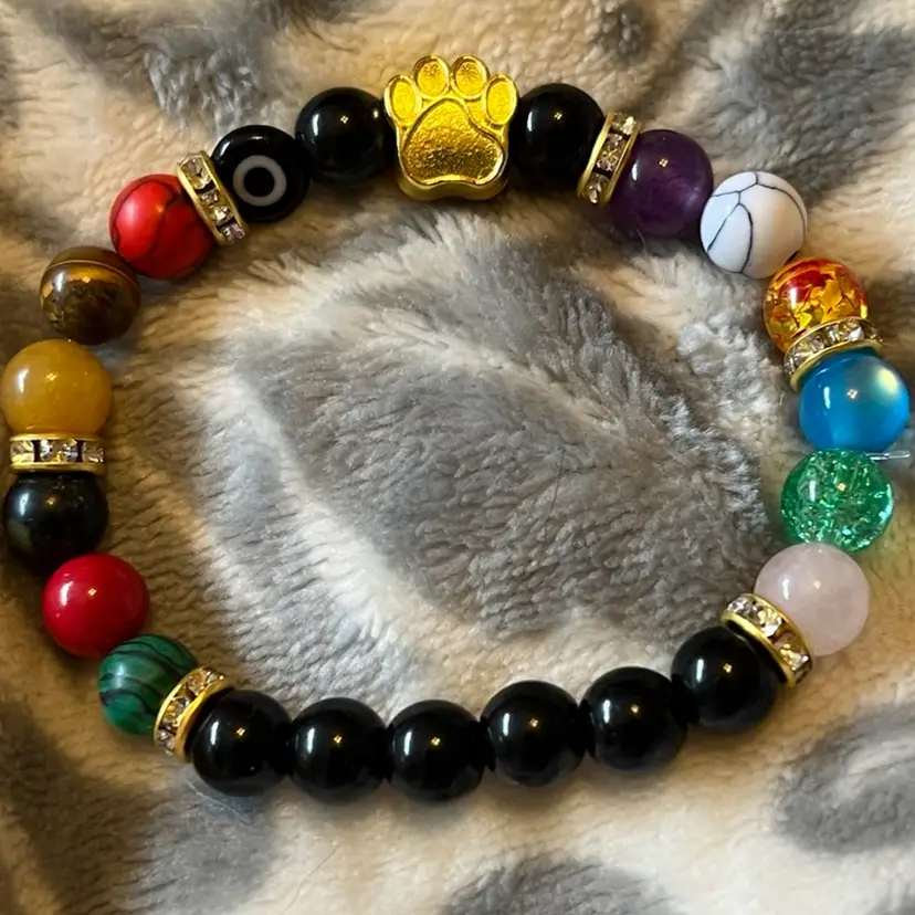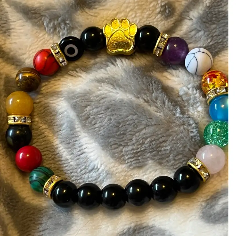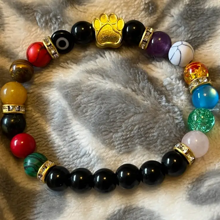 Rainbow Bridge memorial bracelet with chakra beads and evil eye bead surrounded by crystal rondelles. Very nice bracelet to remember your furry friends 7”
