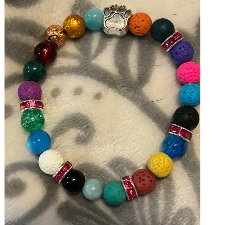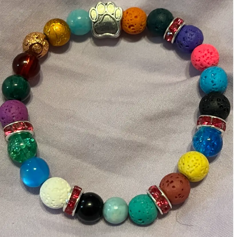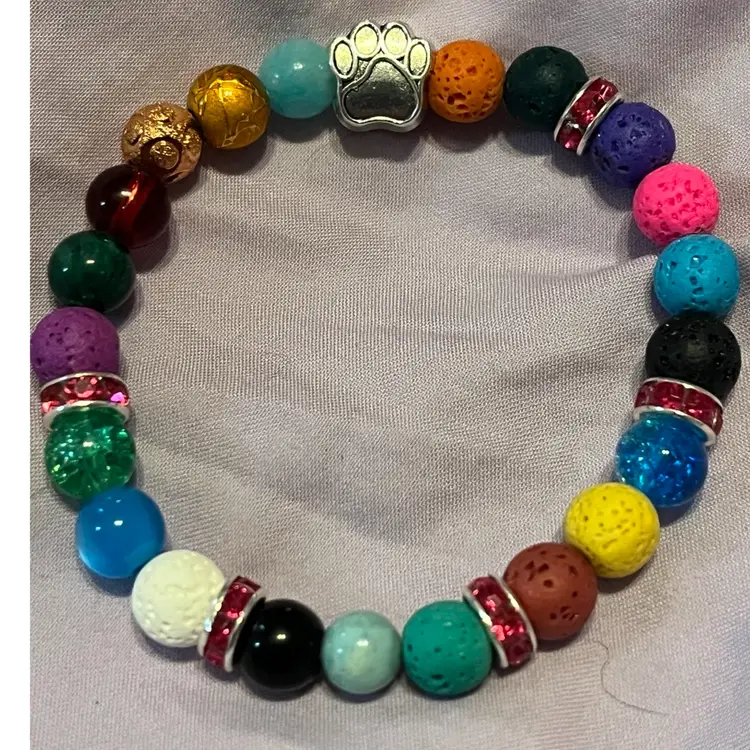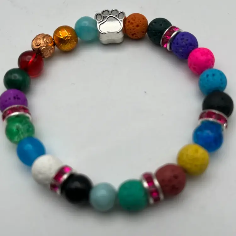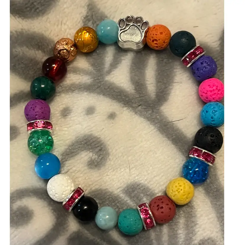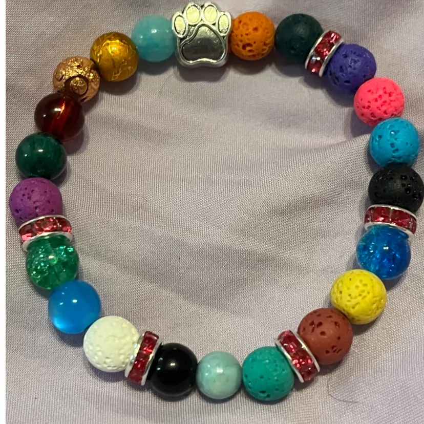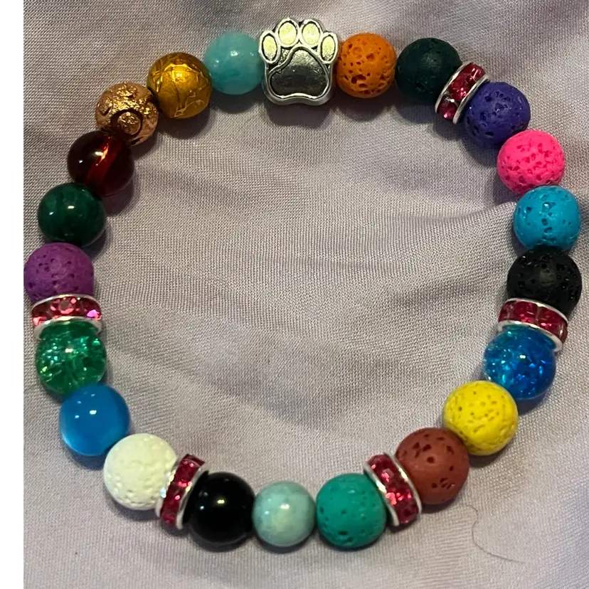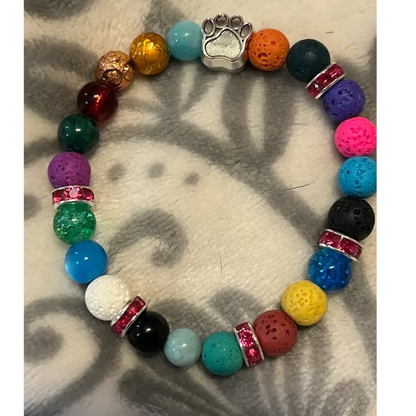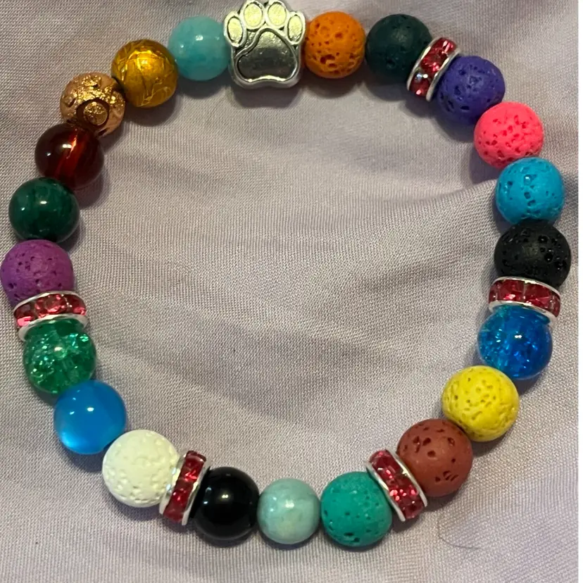 Handmade Rainbow Bridge Pet bracelet to honor your furry friend. Includes crystal rondelles and lava and glass beads with paw print charm. 7”