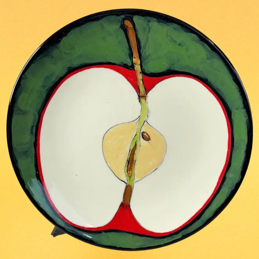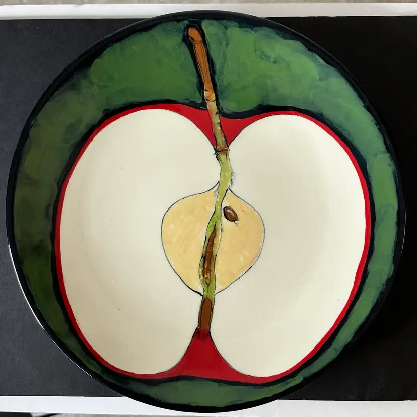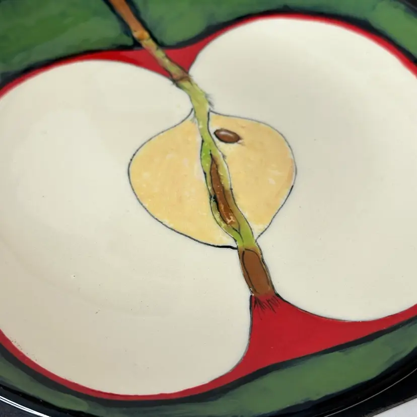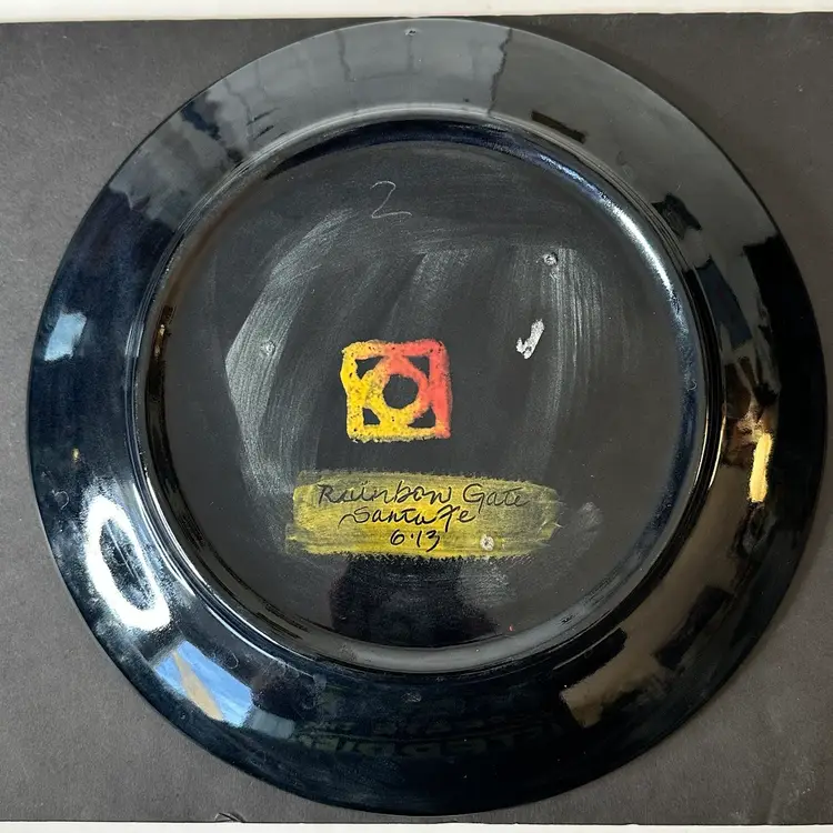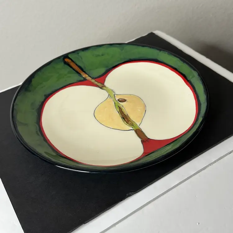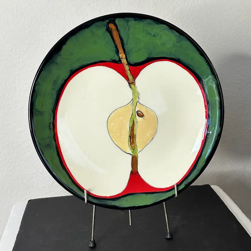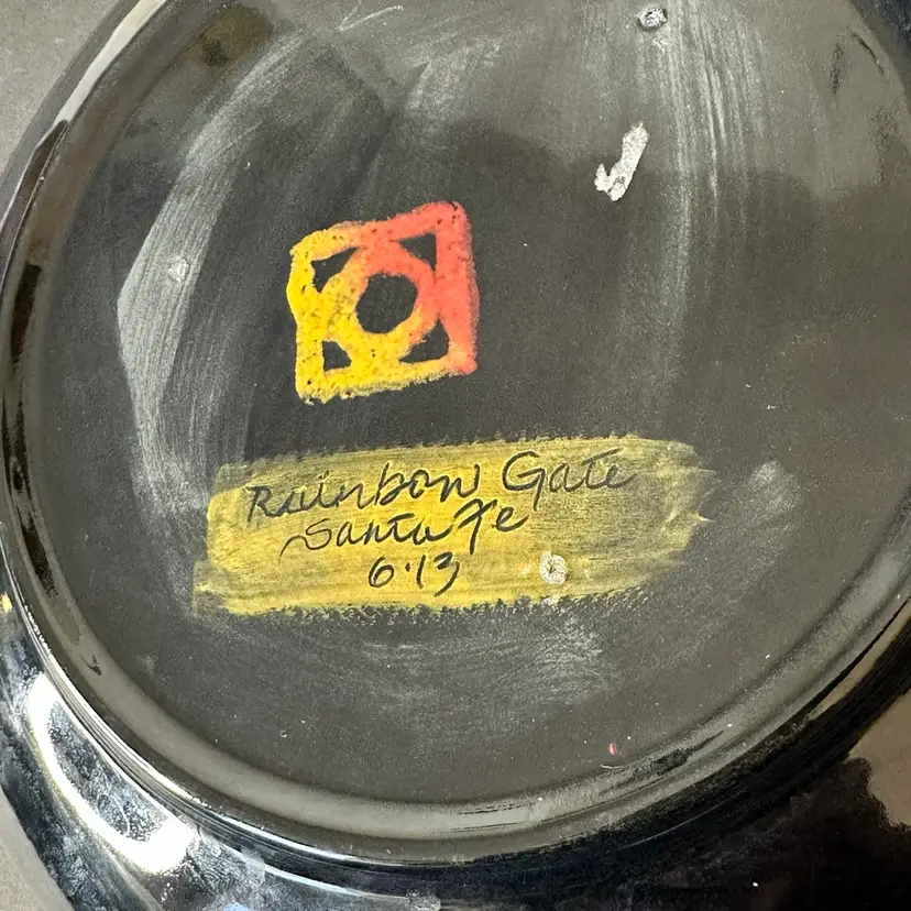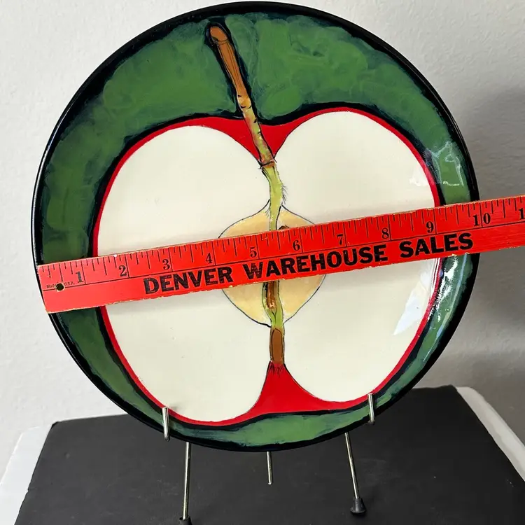Every piece from this studio is one of a kind! This 10” apple plate from Rainbow Gate Pottery in Santa Fe, NM is a hand-made studio art pottery piece crafted in 2013. The glossy red ceramic plate features a decorative apple pattern, making it a perfect addition for all occasions. With a contemporary style and fruit theme, this unique piece showcases the artistry and craftsmanship of American pottery production techniques. The plate is lightweight at 2 lbs and painted with a backstamp, making it a standout decorative item in any kitchen or dining space. Hand wash only to preserve its beauty for years to come
