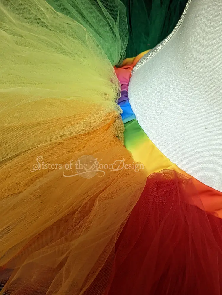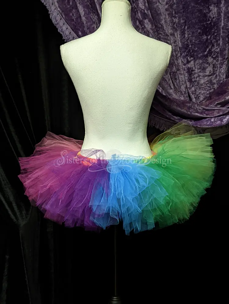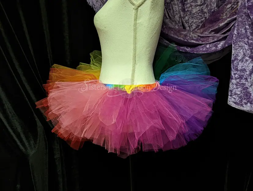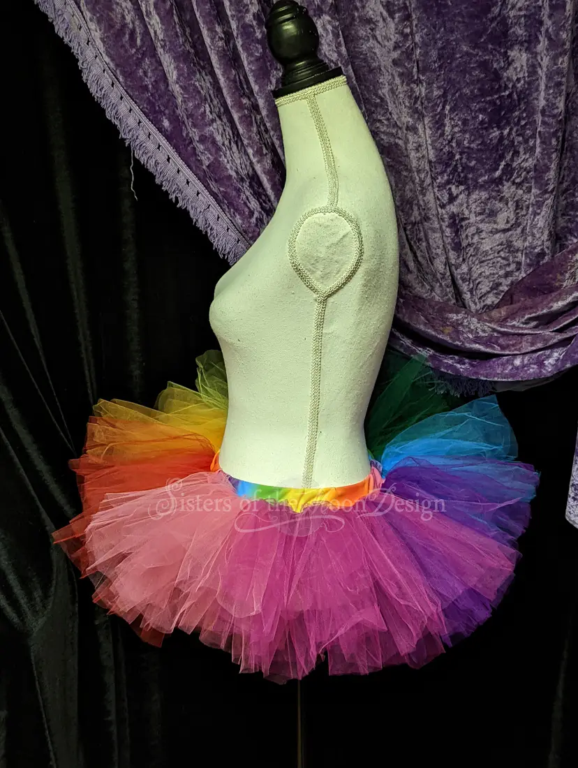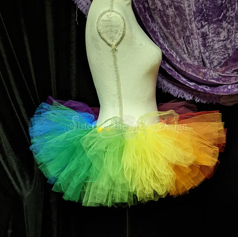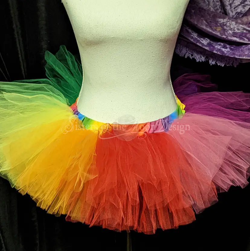 Handmade By Me - Rainbow Three layer mini adult tutu skirt. Perfect for pride events, runs, costumes, raves, club nights and so much more! This tutu is handmade from two layers around 35yards of hand cut panels of red, orange, yellow, lime, green, turquoise, purple, fuchsia and hot pink. All Bridal tulle is tightly machine gathered, serged and sewn to the rainbow colored fabric covered elastic waistband, tutus are fully sewn, not tied! This tutu is made at 8" long