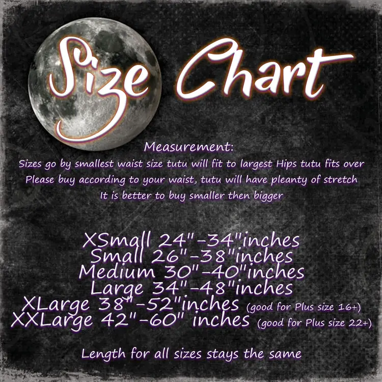 This skirt is not made yet, It is made when ordered! Measurement: Sizes go by smallest waist size tutu will fit to largest Hips tutu fits over These are our measurements, not "standard sizing". Please Measure before buying. XSmall 24"-34"inches Small 26"-38"inches Medium 30"-40"inches Large 34"-48"inches XLarge 38"-52"inches (good for Plus size 16+) XXLarge 42"-60" inches (good for Plus size 22+) 8" long as shown