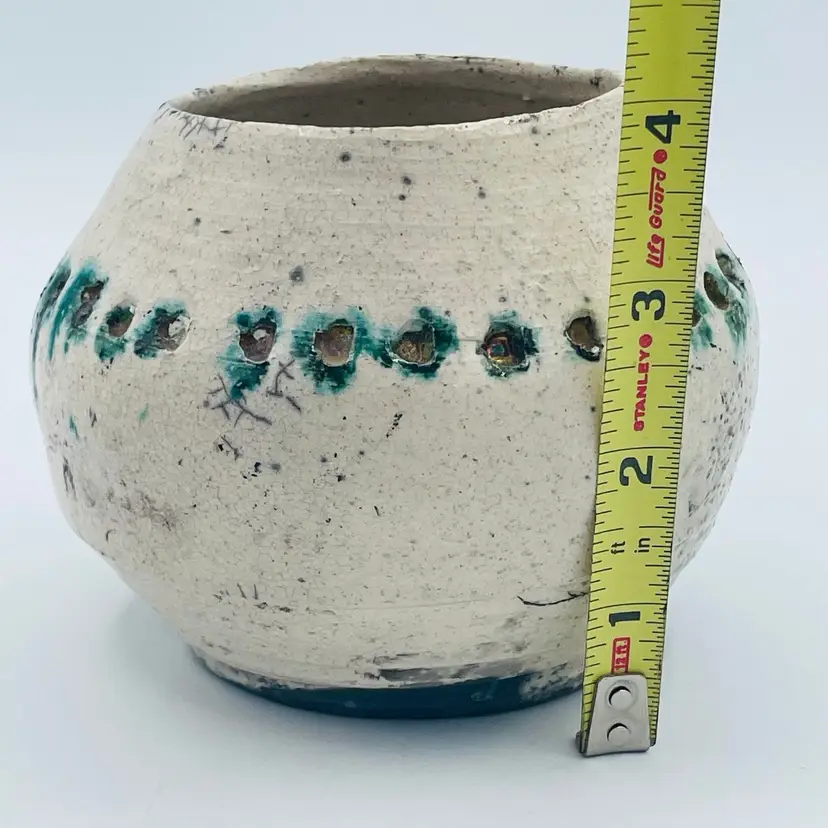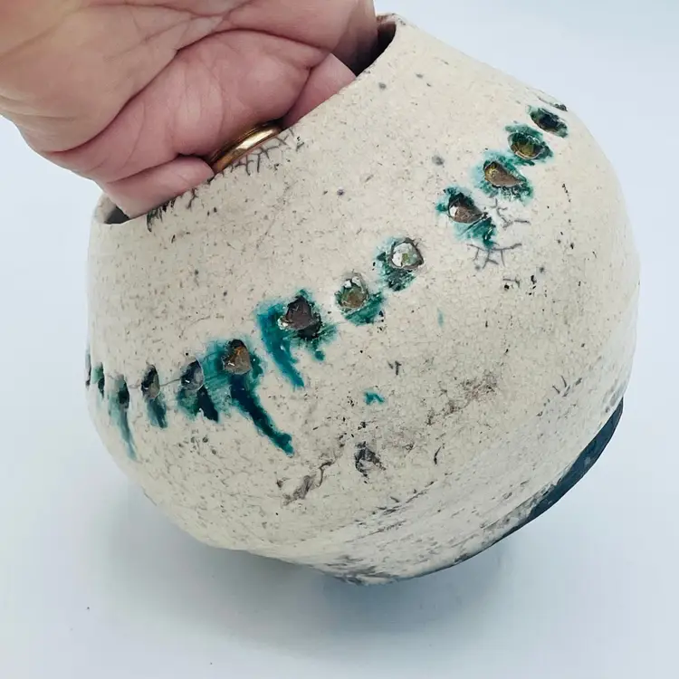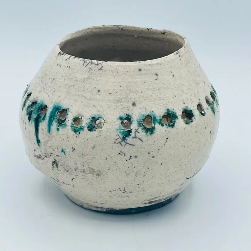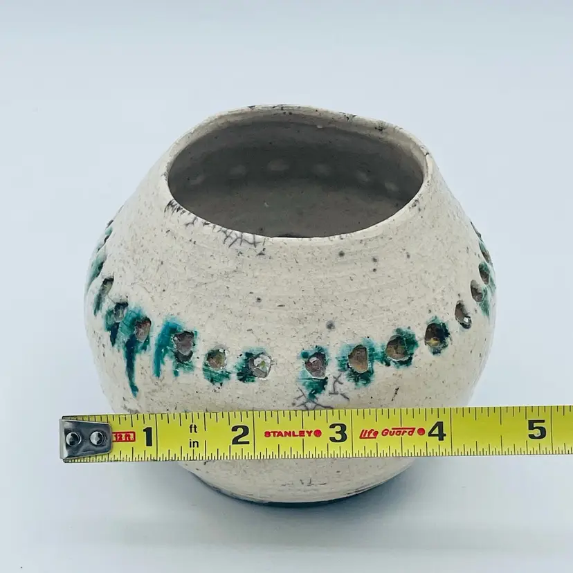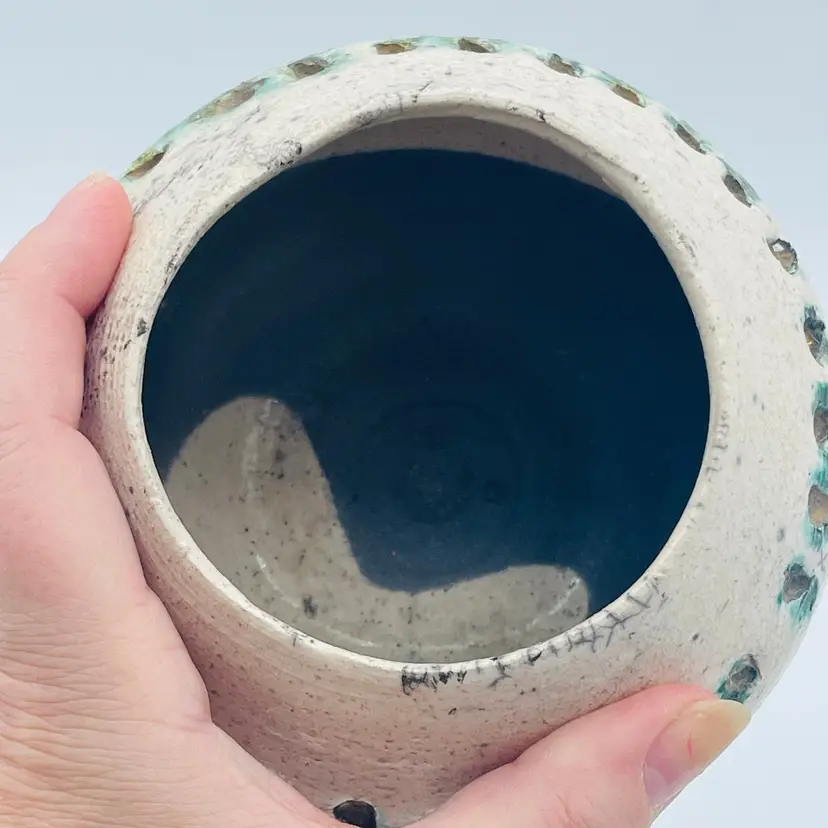 Raku Cream & Green Dotted Crackle Round Vase Signed Abstract Art Pottery Piece…rare and unique! One of a kind glazed piece with the classic black pottery base of Raku- see all images for more info and details