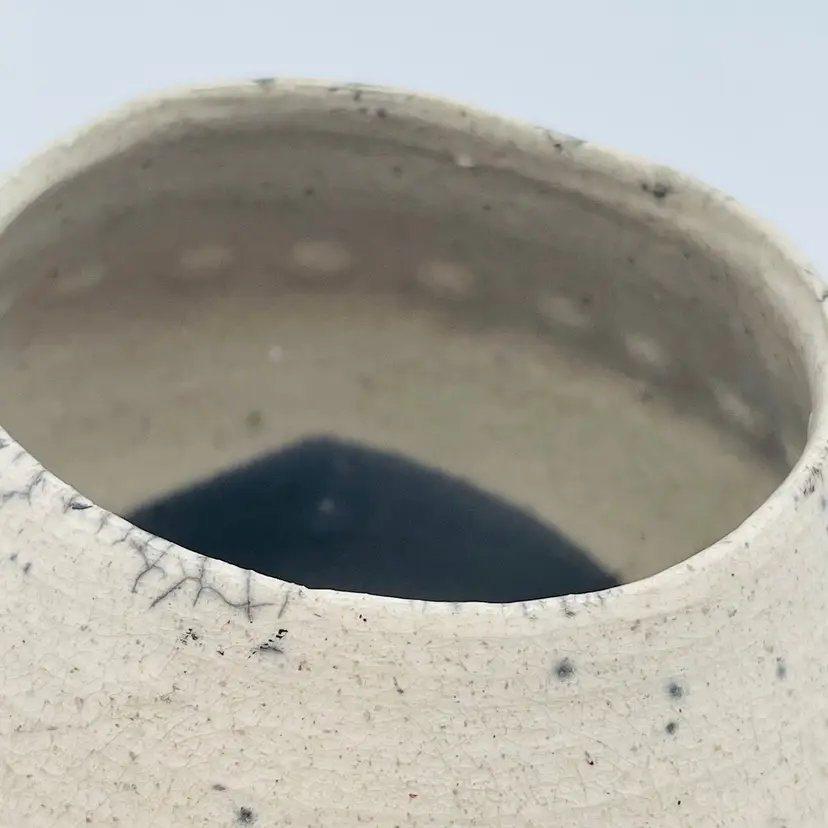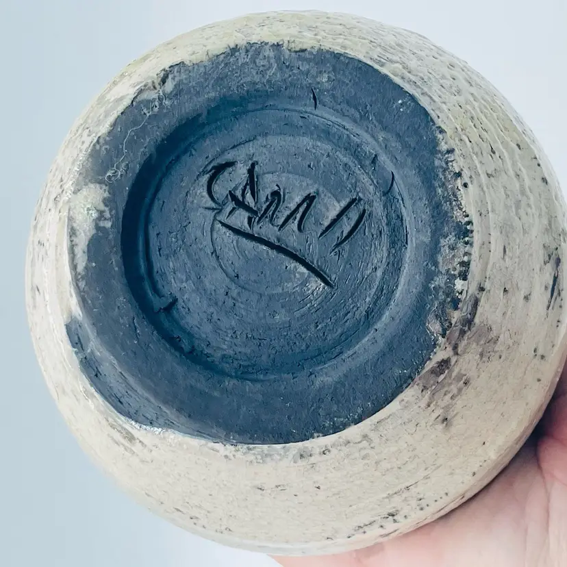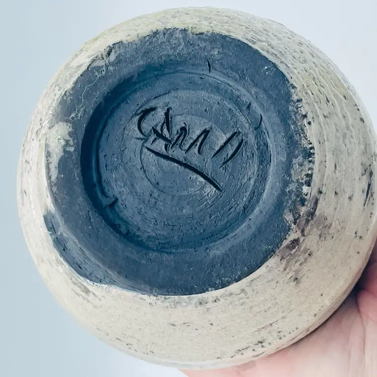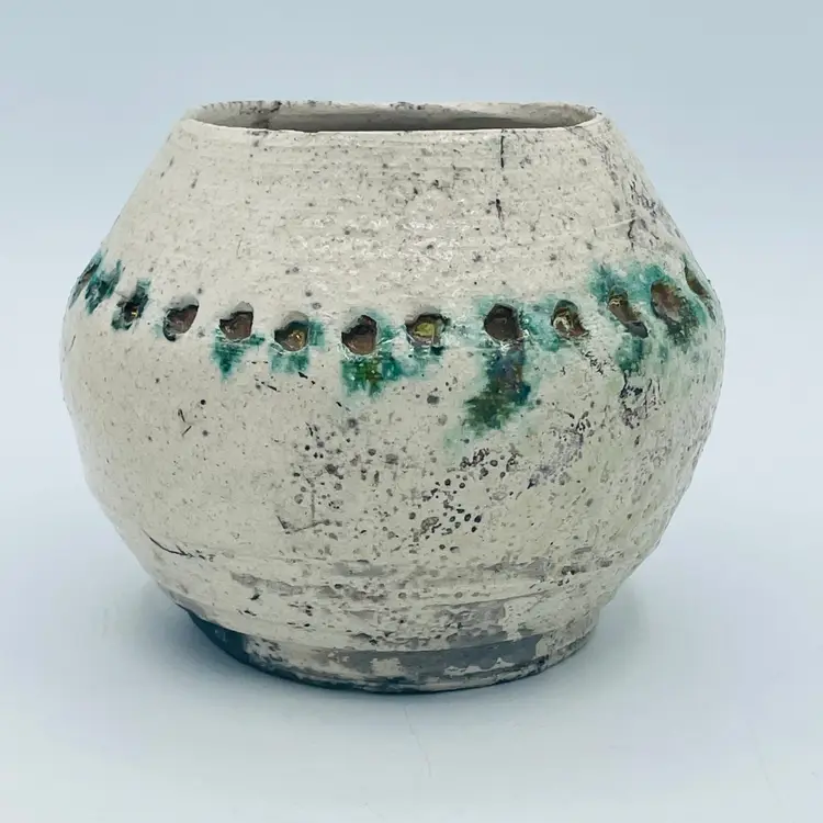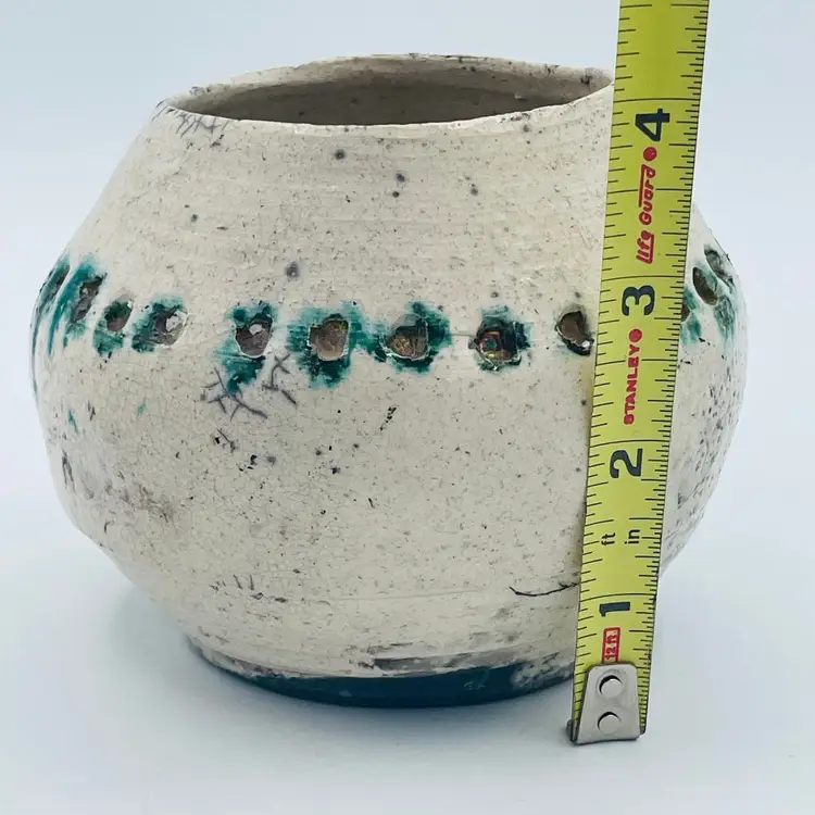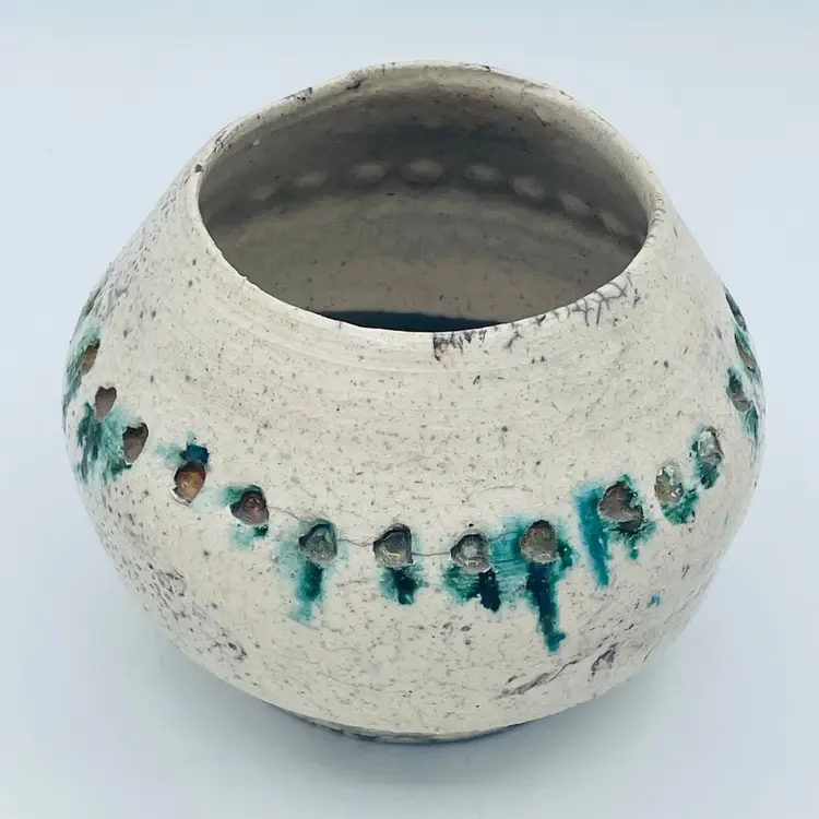 Raku Cream & Green Dotted Crackle Round Vase Signed Abstract Art Pottery Piece…rare and unique! One of a kind glazed piece with the classic black pottery base of Raku- see all images for more info and details