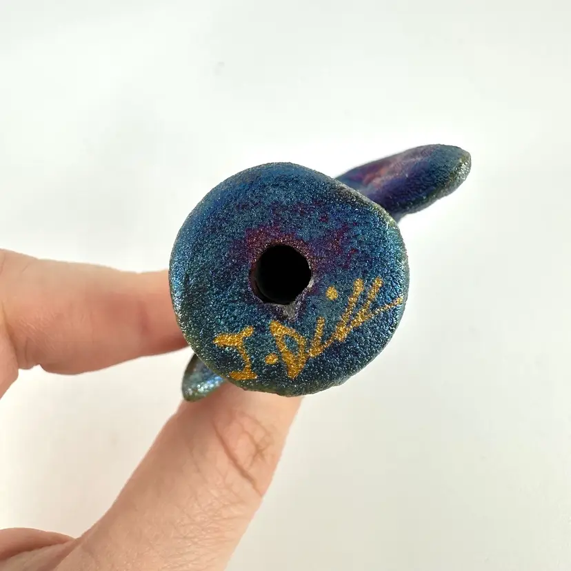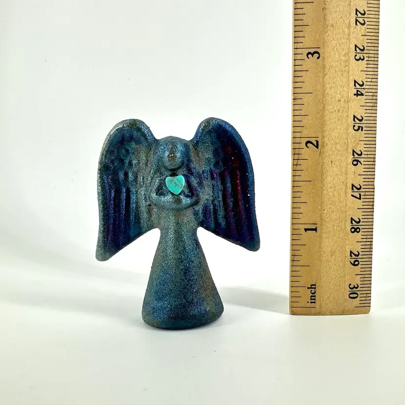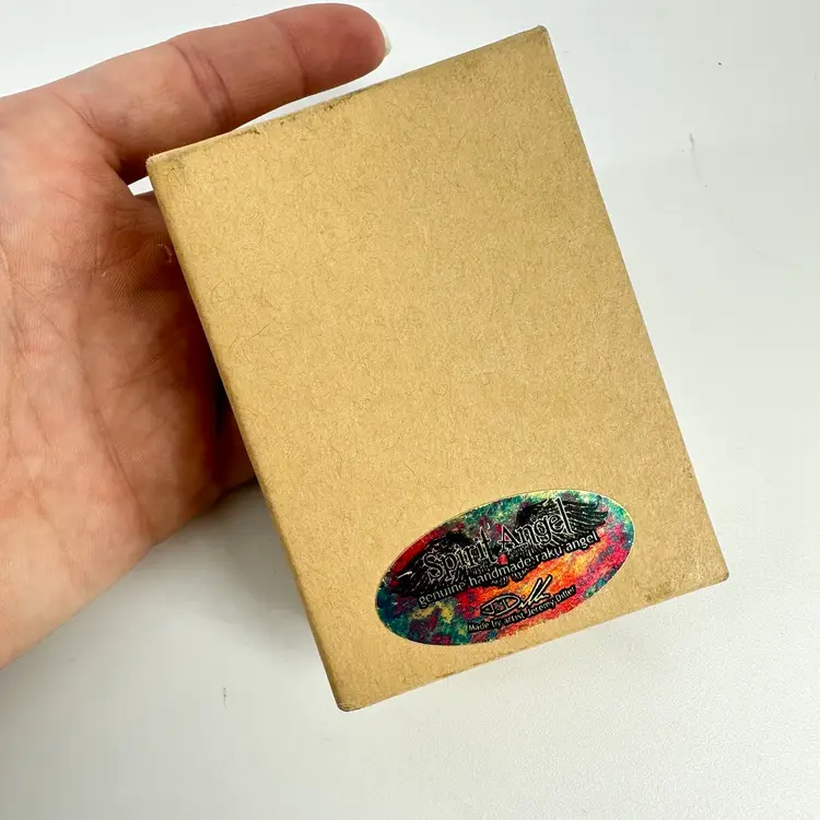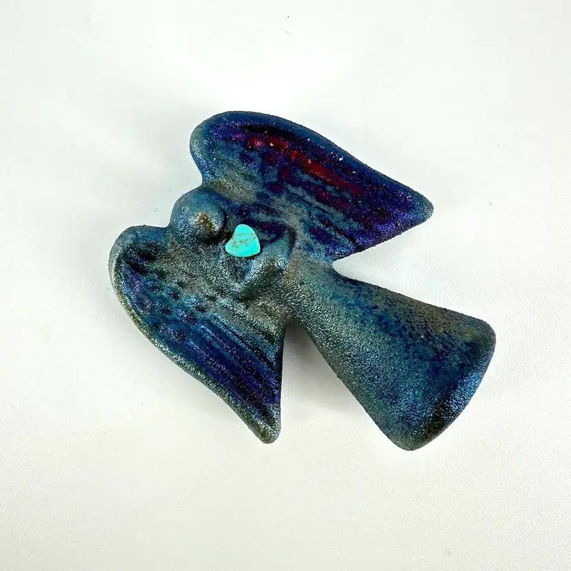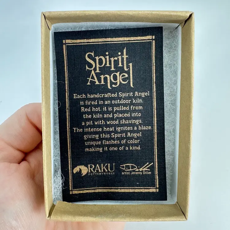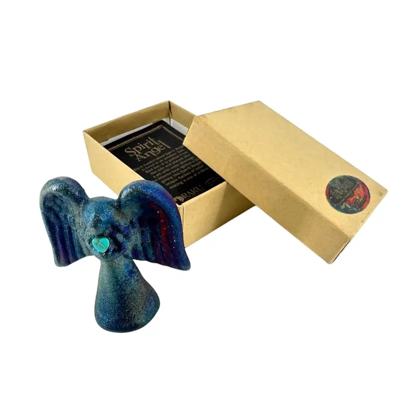 Spirit Angel token made from Raku technique by artist Jermey Diller. This angel features an applied blue stone (unknown) heart. Includes original box. No chips or cracks. Signed “J. Dill” on hollowed bottom. Measures approximately 2.25” tall.