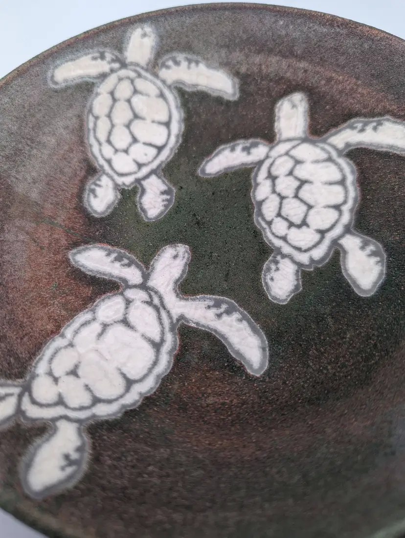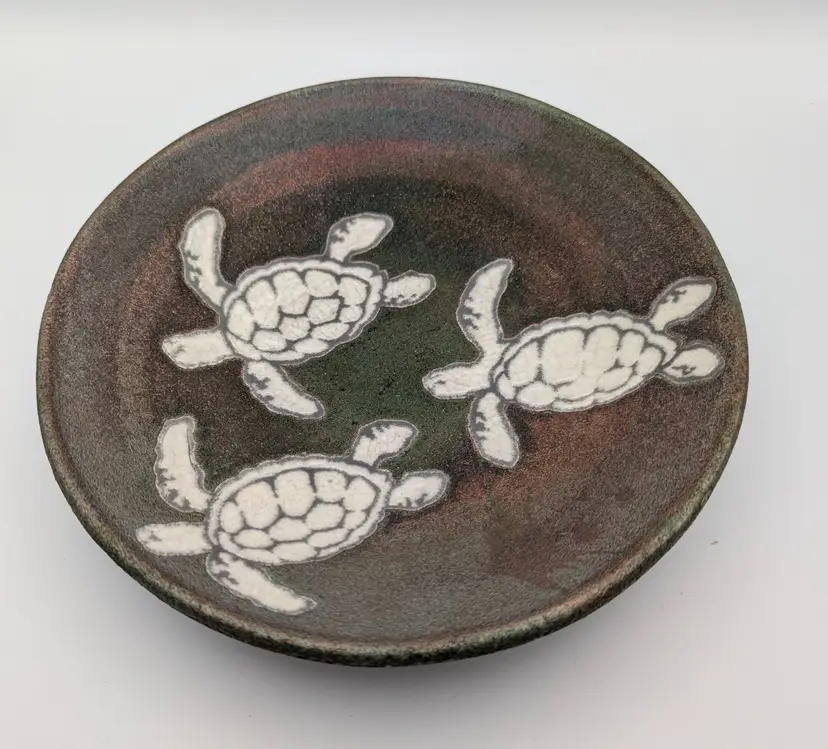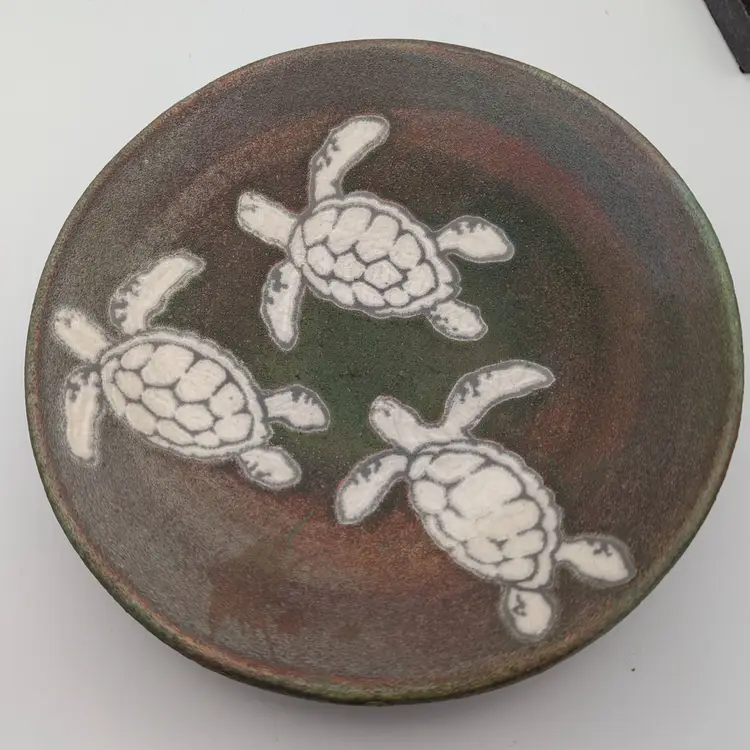 This is a beautiful Raku pottery dish - highlighting Sea Turtles. It is by a Hawaiian Artist B Diller- It is signed on back. It measures 8 inches in diameter. This is used- it was out on my patio table- enjoyed . No chips or cracks. There is a discoloration on inside of dish- I took photos to show. I was told it happened during manufacturing. Never did see it at first but noticed now after taking photos! Non smoking home Non pet home.