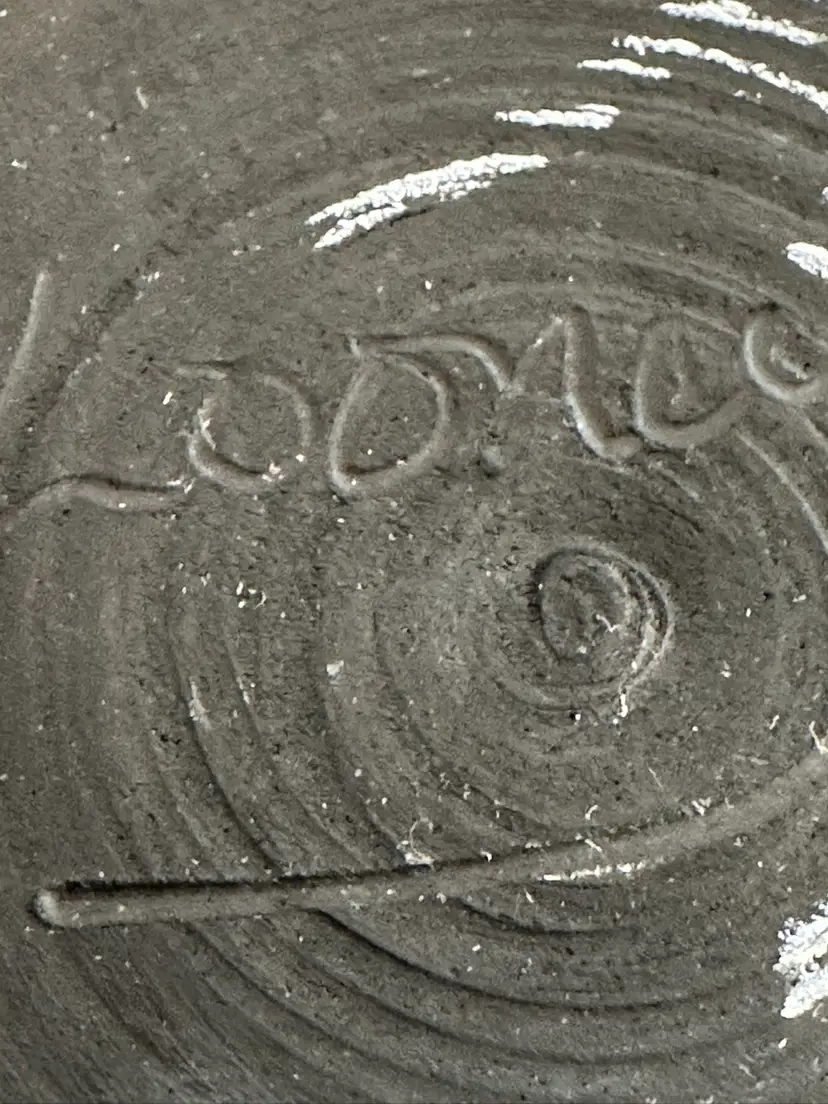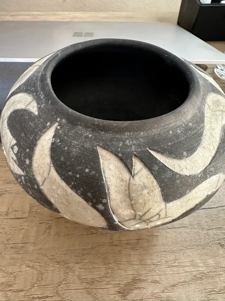 Beautiful piece stands a little over 4 inches tall and 6” wide. In researching, I believe it’s called naked/smoked Raku. In good condition. Piece is signed, Looney.