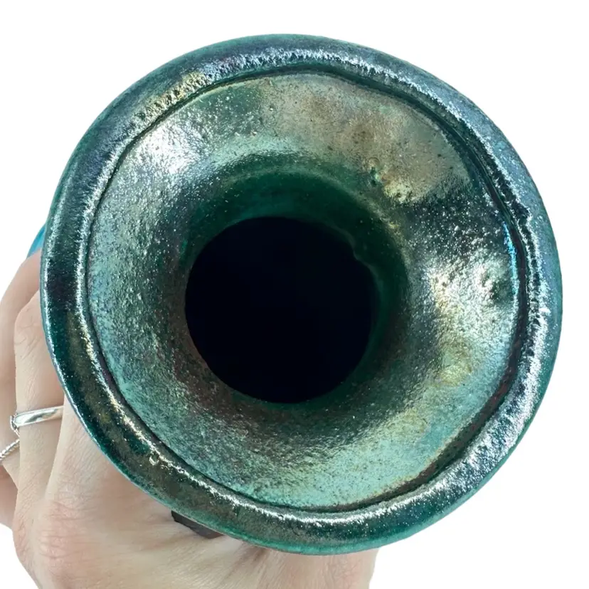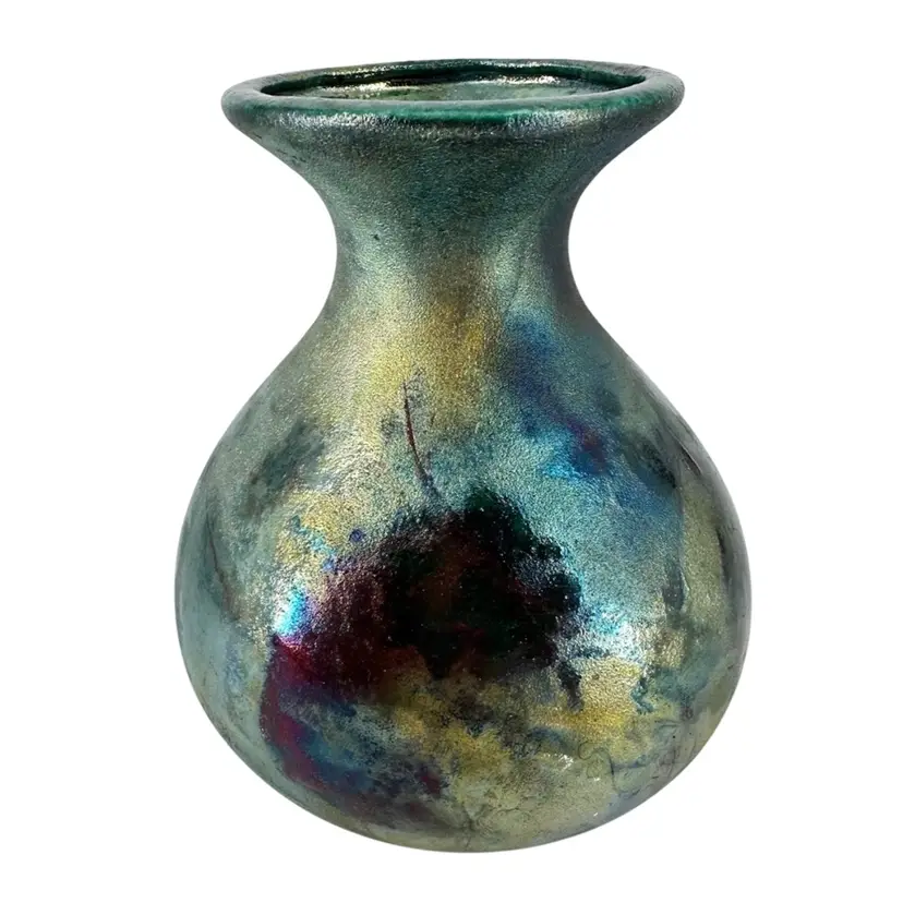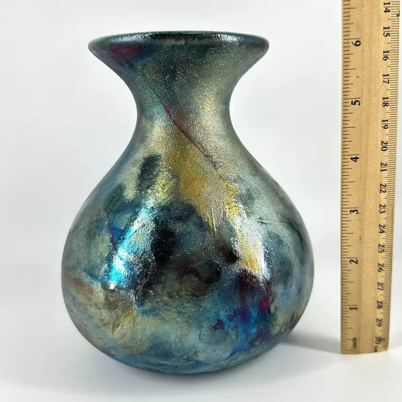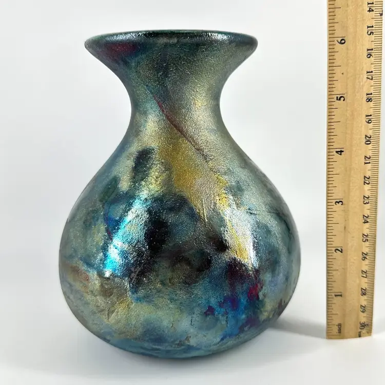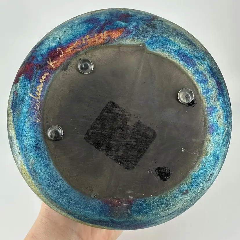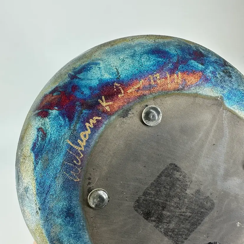 This Raku pottery vase is signed and is approximately 6.5” in height. There are no chips or cracks anywhere on this piece. It is signed on the bottom in gold writing “William K (last name illegible)”. Signature can be seen in photos. One of the rubber stoppers on the bottom is missing,