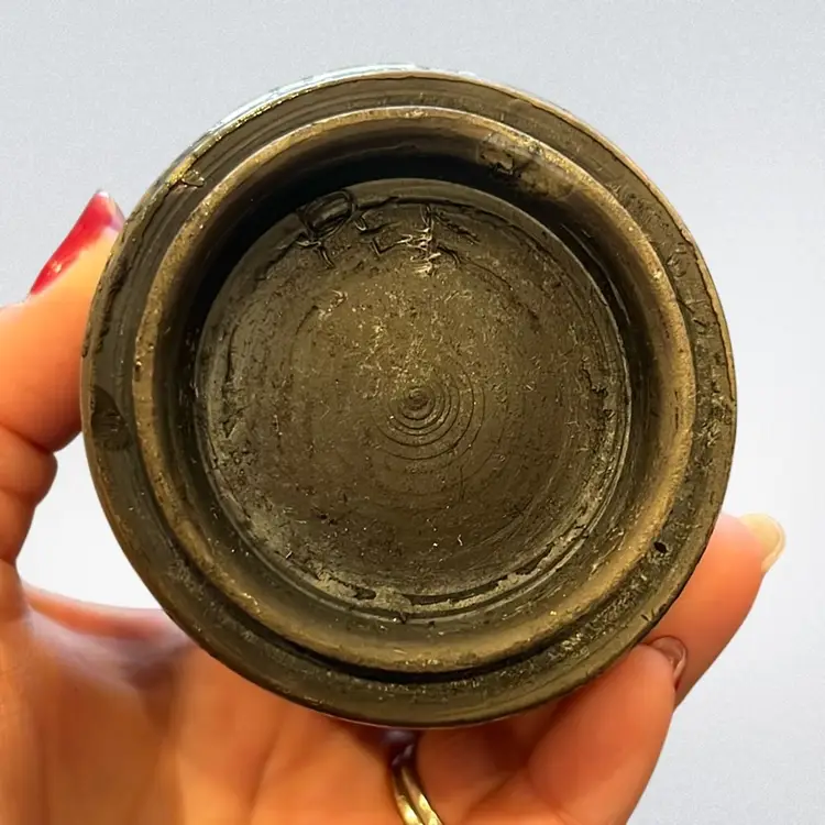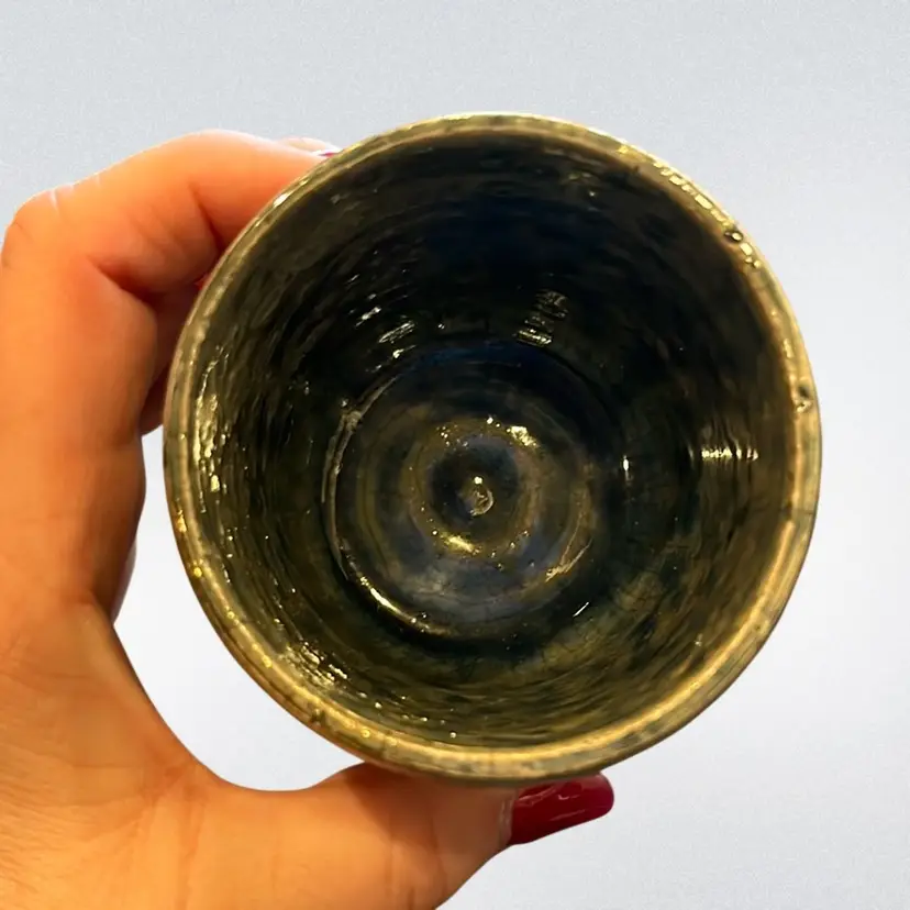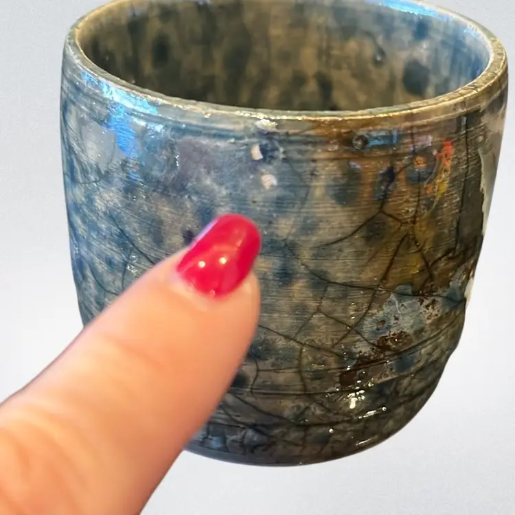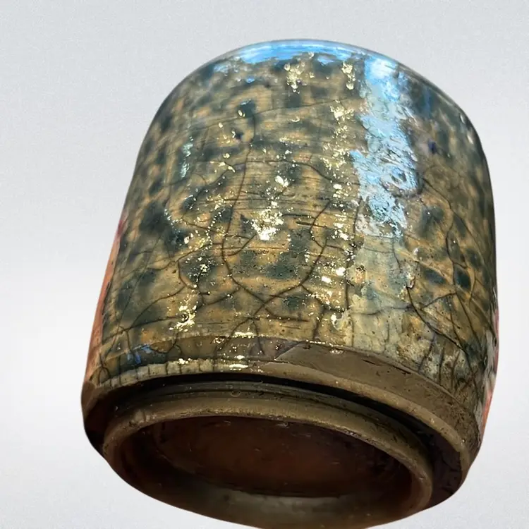 This piece is perfect to start your Raku collection! Blue Green in colors. One small missed glaze area. No chips or cracks. Approx: 2.75” h x 2.5” d