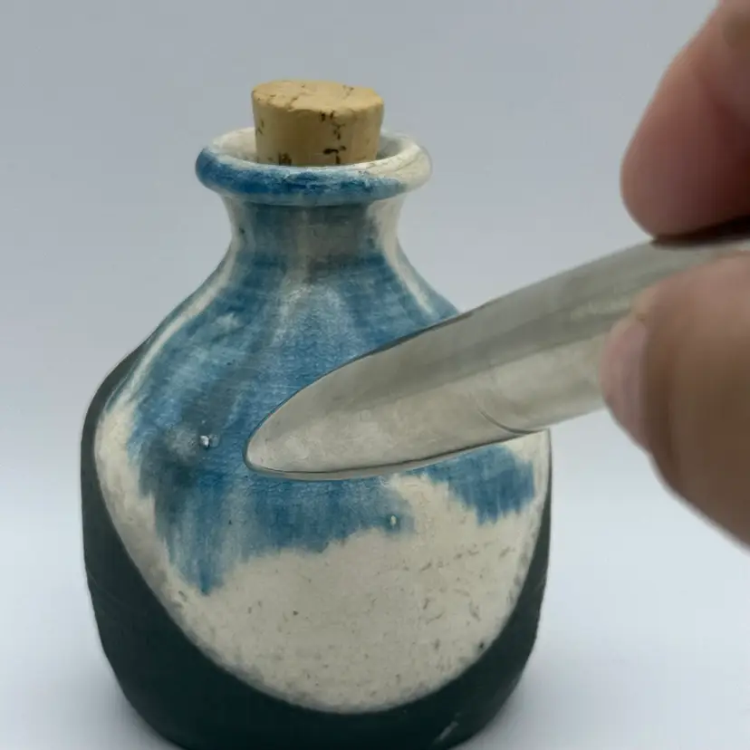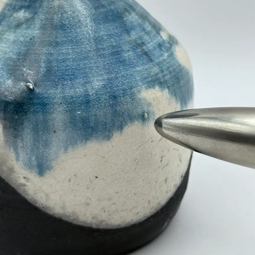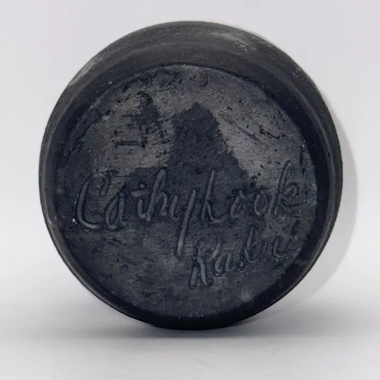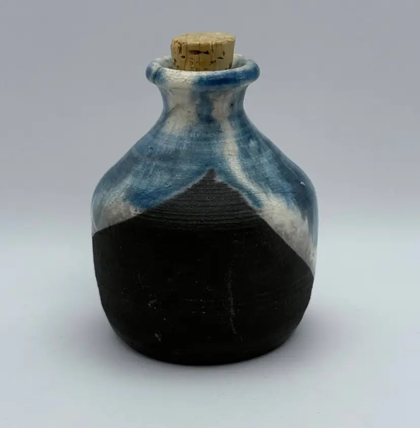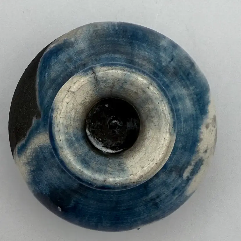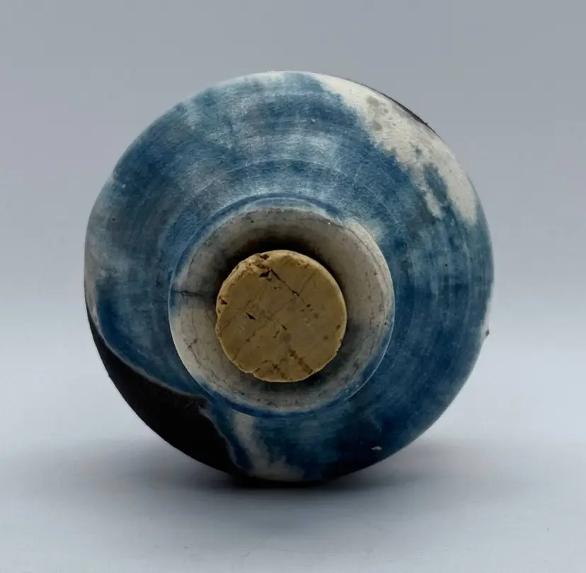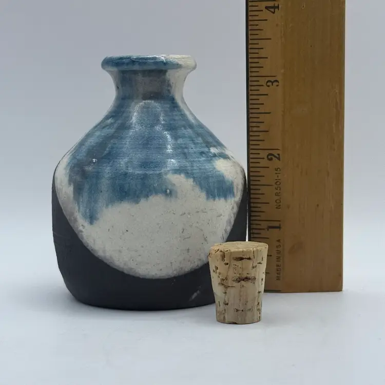 Pre-Owned - Small glaze imperfections visible as indicated in the photos. Height = 3.5 in, Diameter = 3.75 in. This exquisite handcrafted Raku pottery vase embodies the essence of ancient ceramic artistry. The hand-finished surface and subtle imperfections add character, making it a cherished addition to any collection.