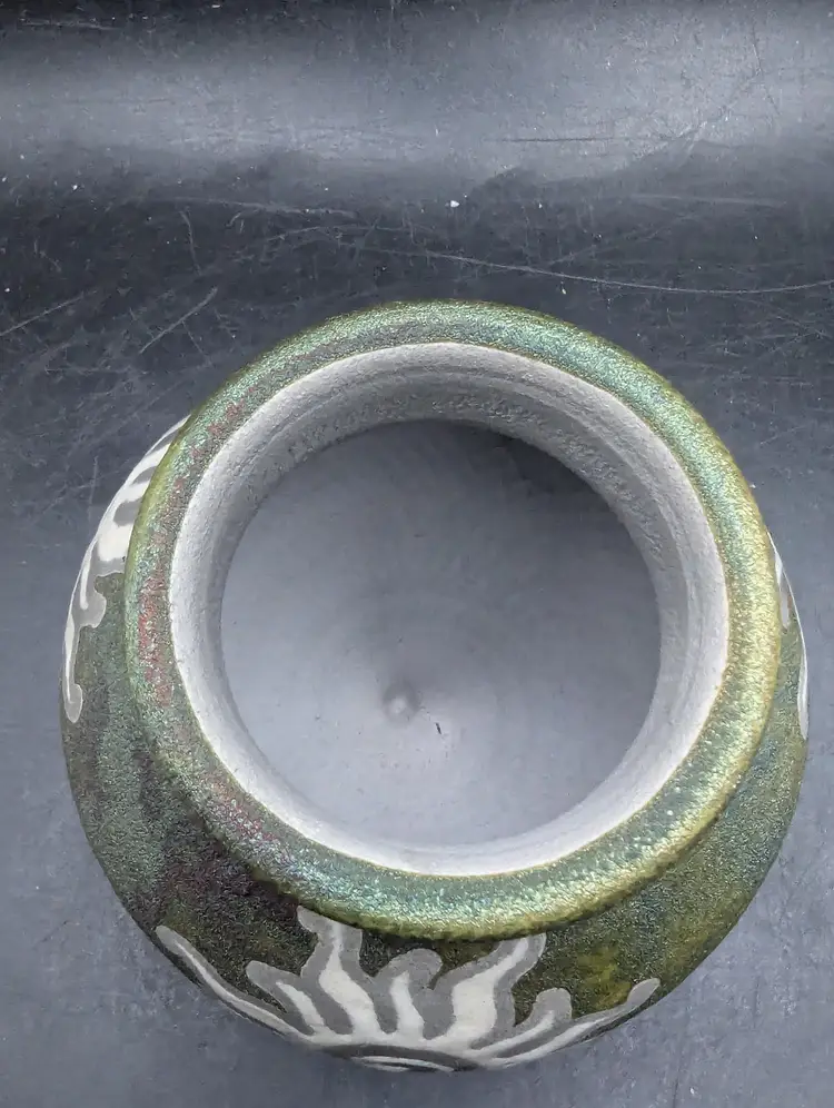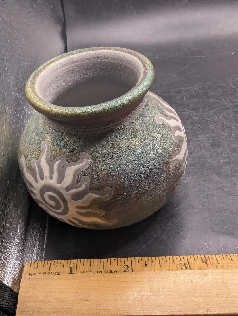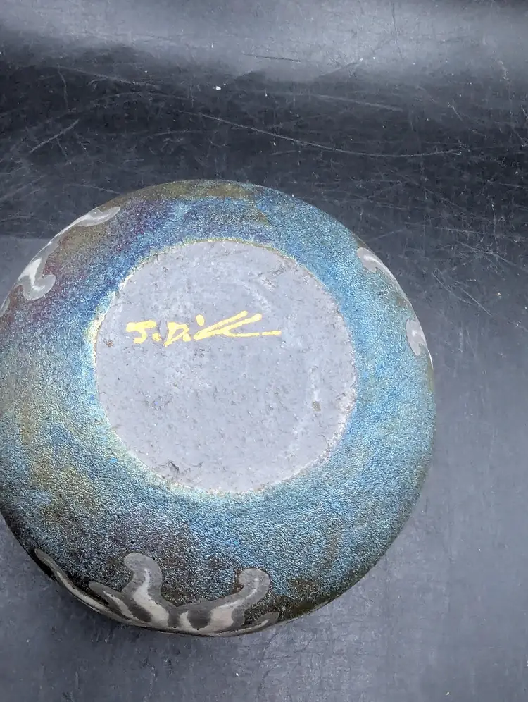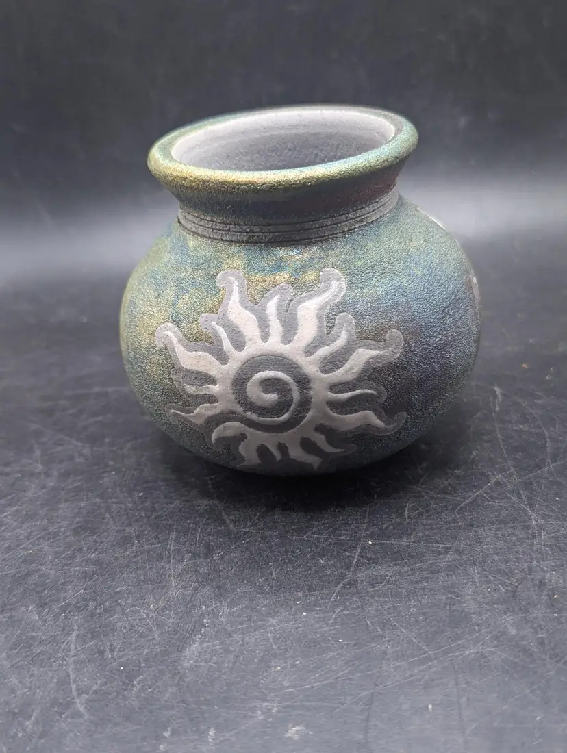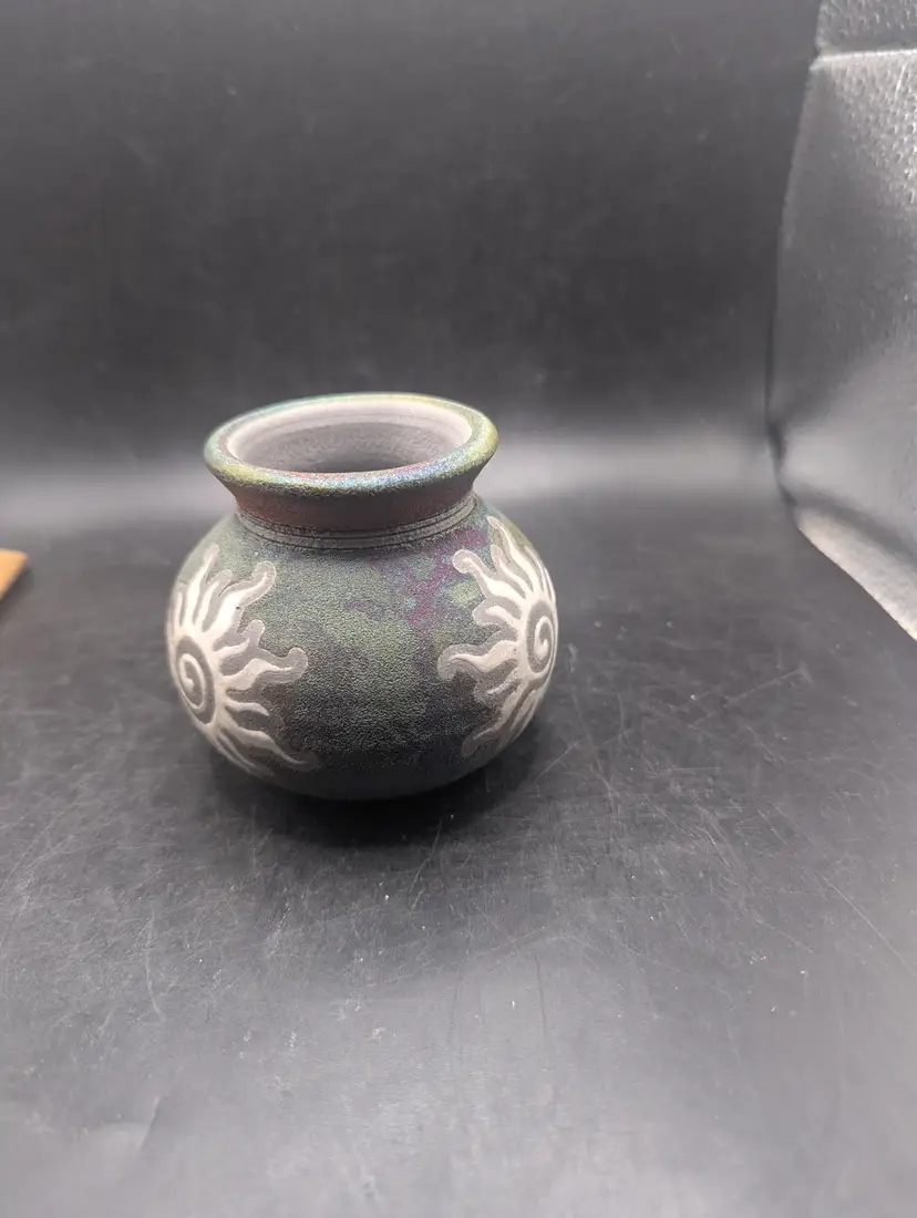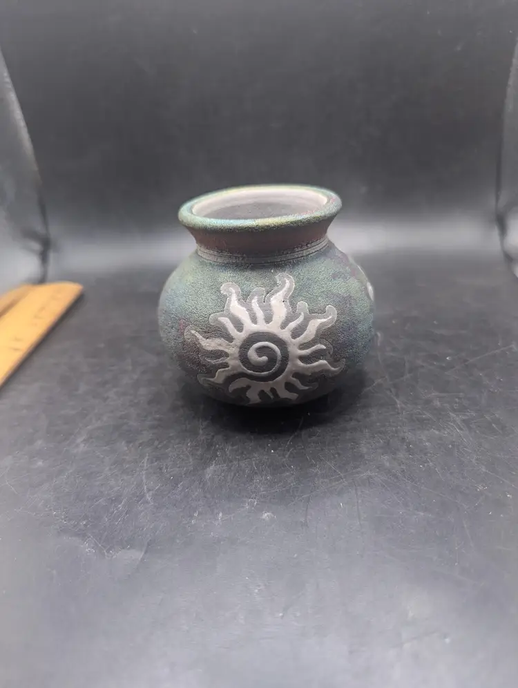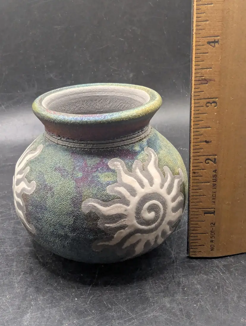 This is a lovely RAKU Studio Art Pottery Iridescent Silhouette Vase Jeremy Diller Southwest Sun. It has a fantastic rustic glaze with a variety of color mixture. It measures 3 inches in diameter and stands about 3 inches tall. No chips or cracks. Please see all pictures for condition.