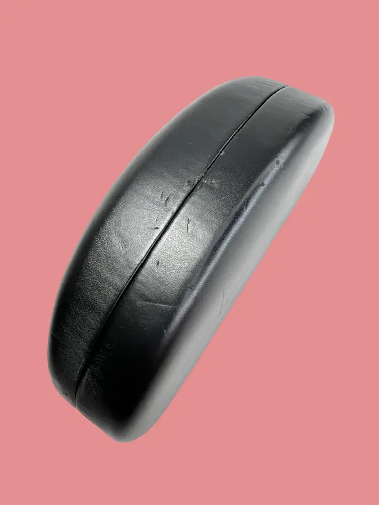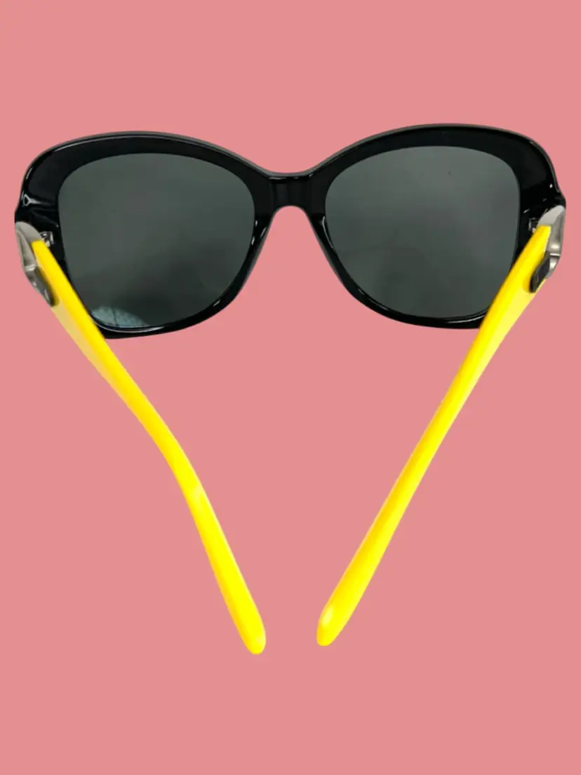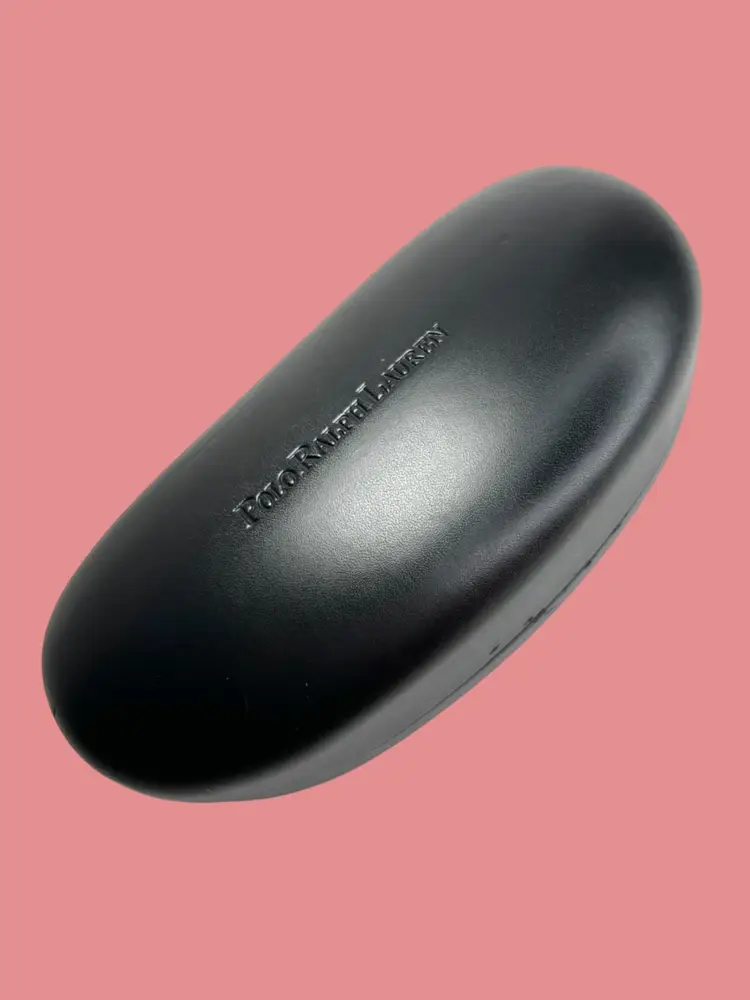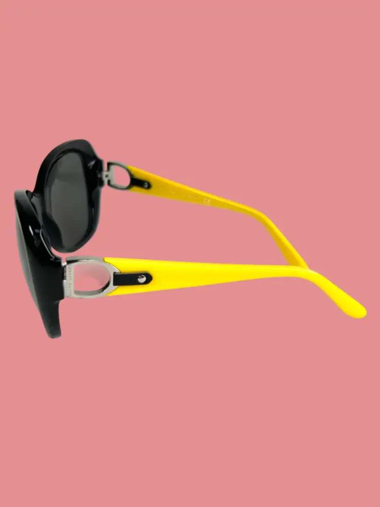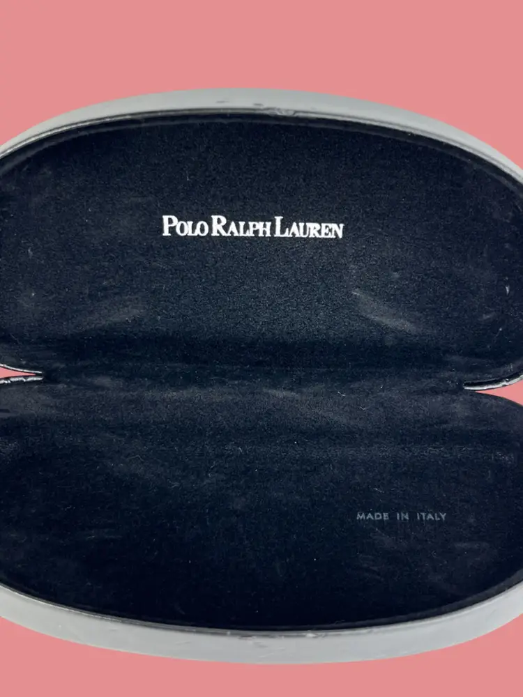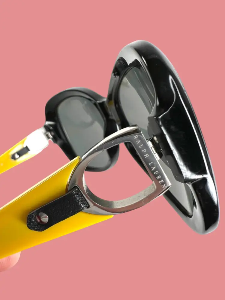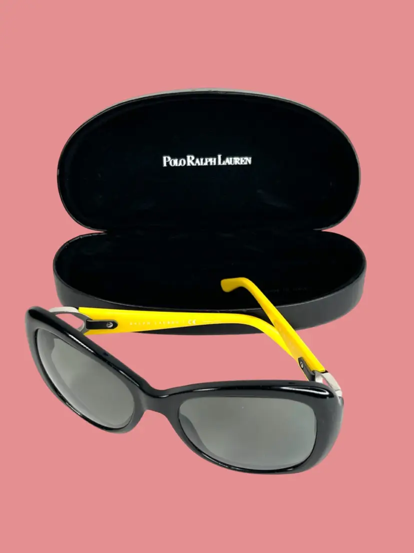 Beautifully Styled Ralph Lauren Over-size Sunglasses Black Leather Protective Case with Black Velvet Interior Meets authenticity hallmarks Plastic Yellow & Black Frames Leather strapping on hinges