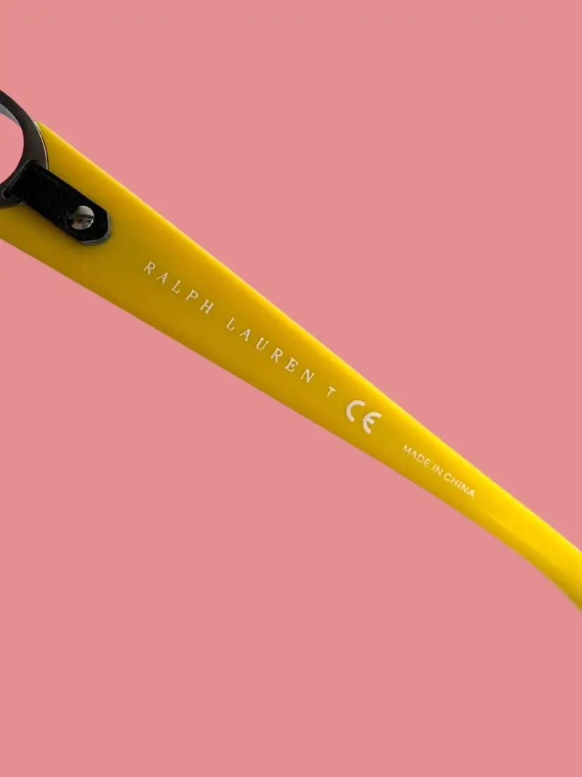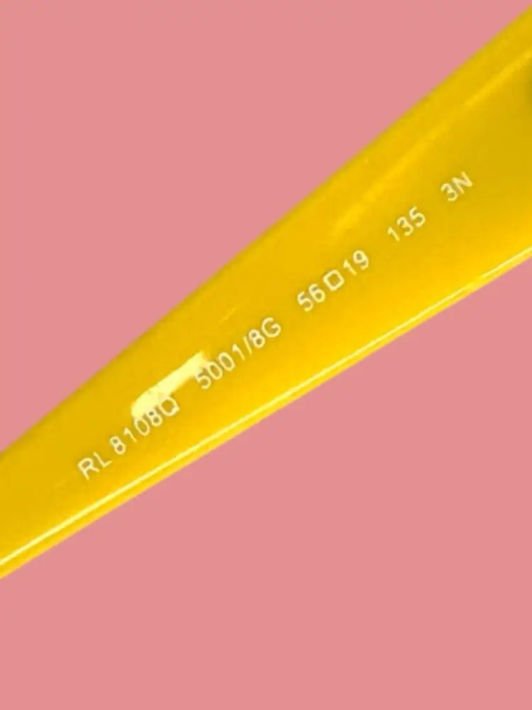 Interior of arms engraved with details: RL 8108Q = Ralph Lauren model # 5001/8G = Black/Yellow Frame with Gray Gradient Lenses 56-19-135 = _56mm lens diameter _19mm DBL (distance between lenses or bridge length) _135mm Temple/Arm Length 3N= UV protection; non-polarized Ralph Lauren Made in China (yes, they have manufacturing there)