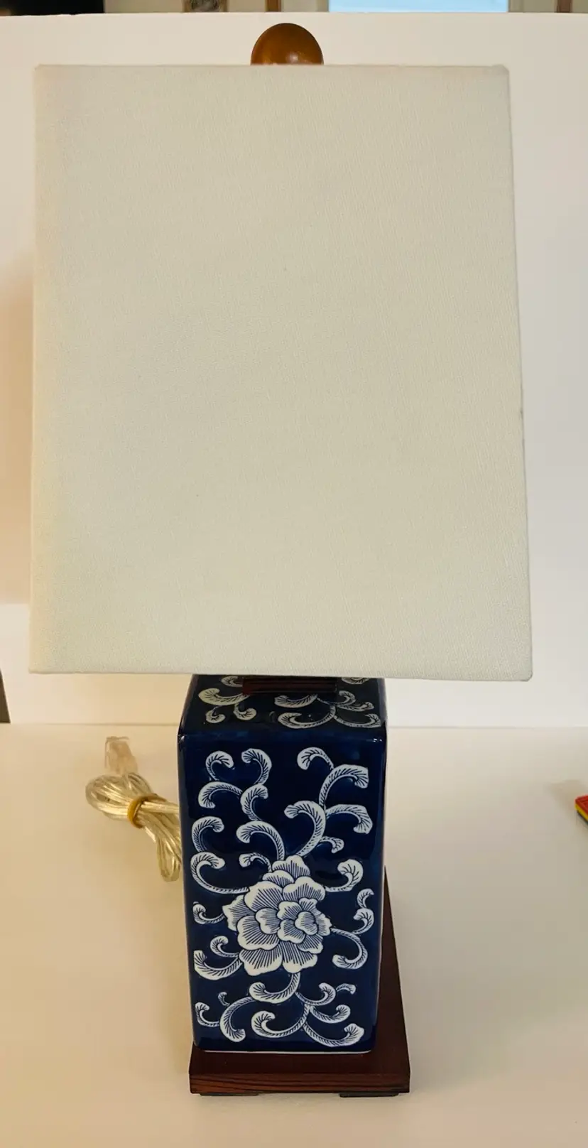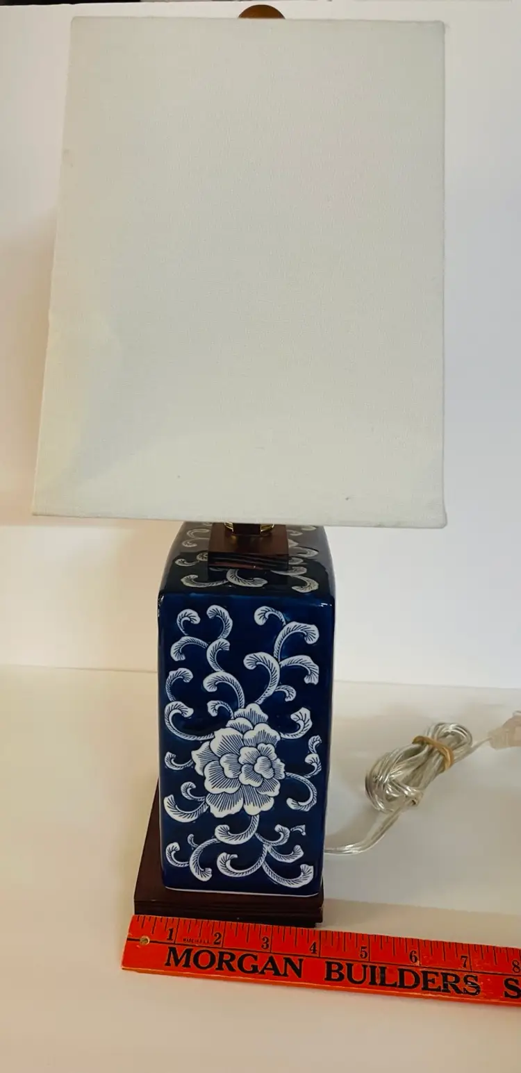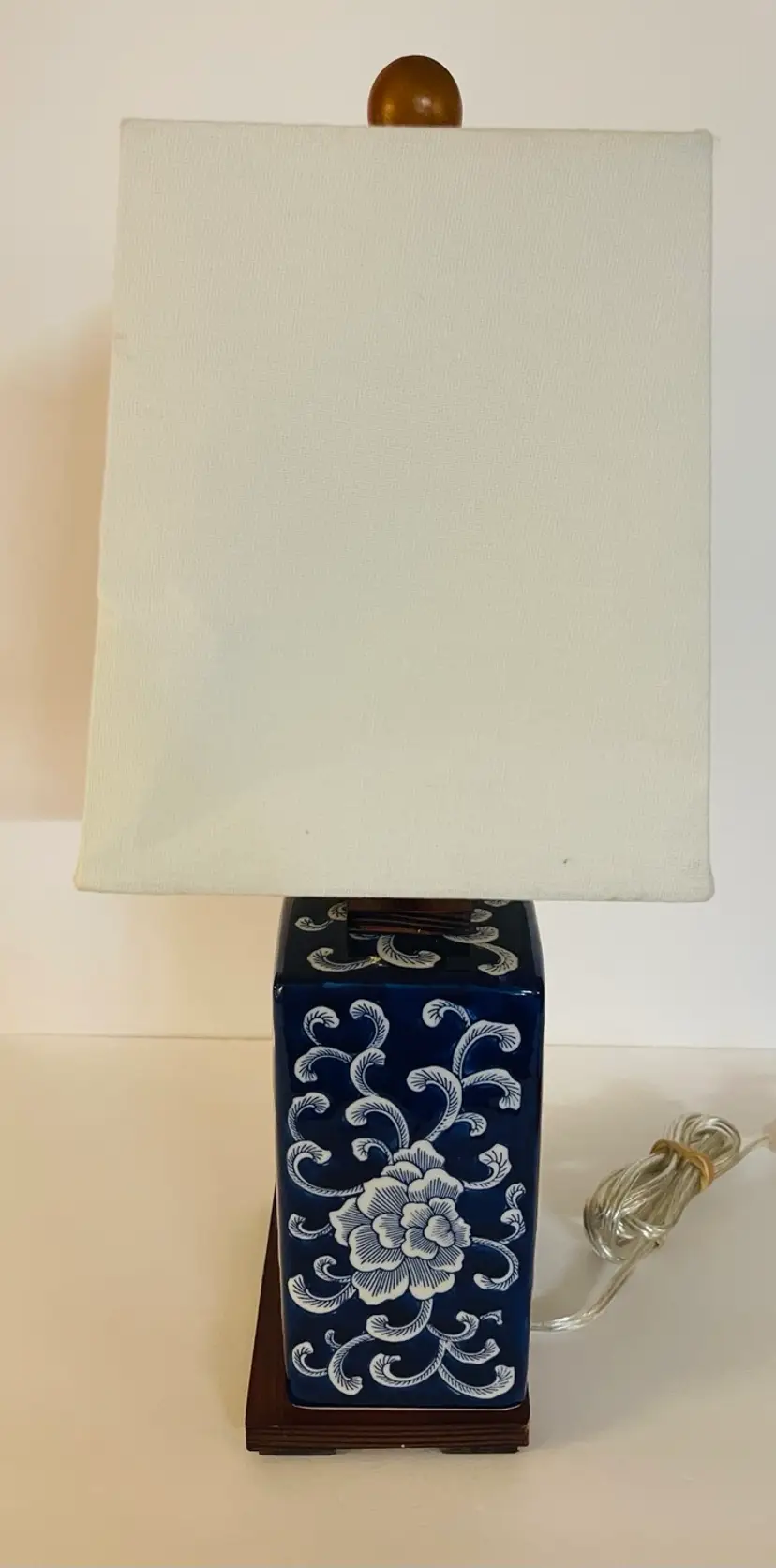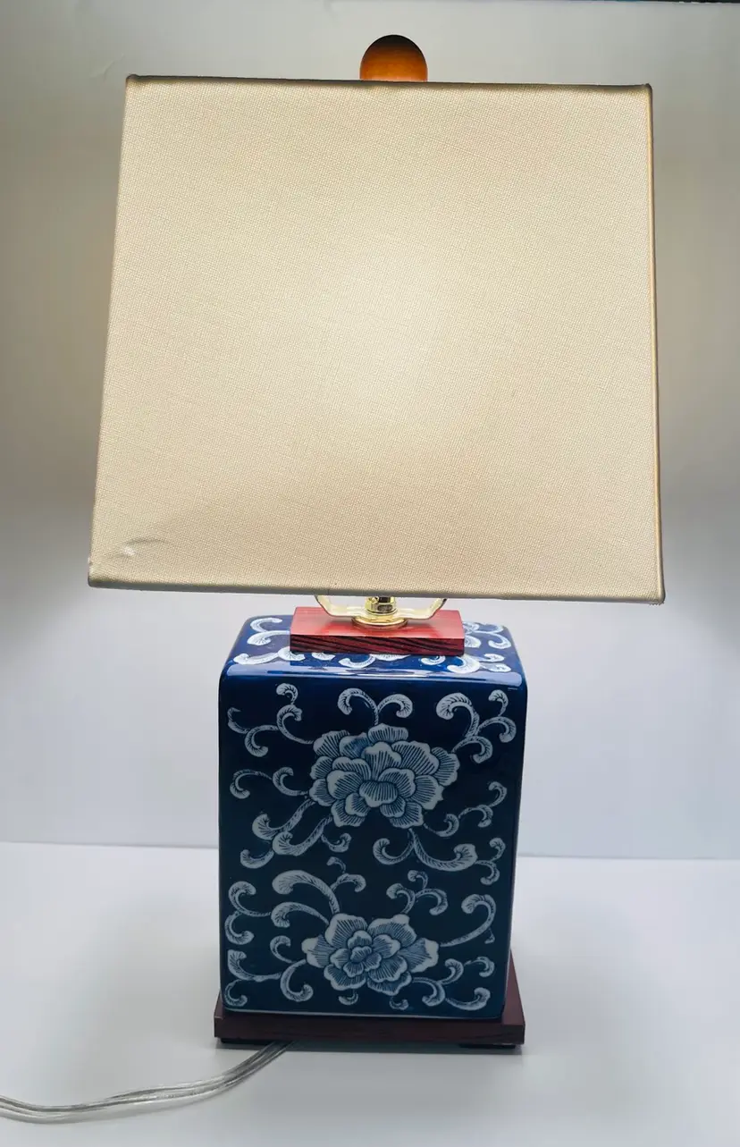 Add a touch of elegance to any room with this beautiful Ralph Lauren Blue White Lotus Flower Floral Square Accent Table Lamp. Designed with a Chinoiserie-inspired pattern, this stunning lamp features delicate porcelain flowers . The lamp is perfect for study rooms, entryways, bedrooms, or living room .The lamp cord is white, adding a subtle contrast to the blue and white color scheme.