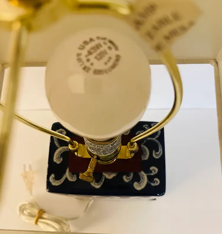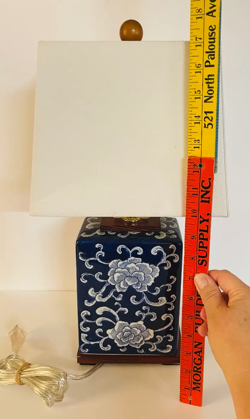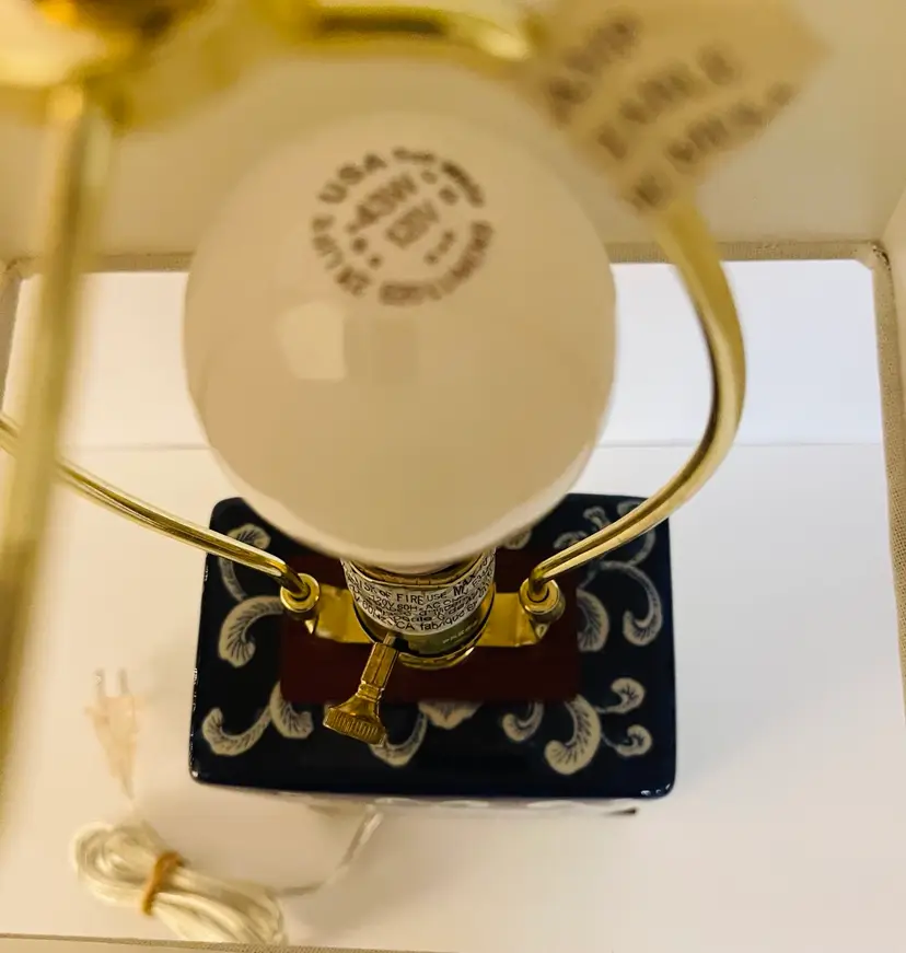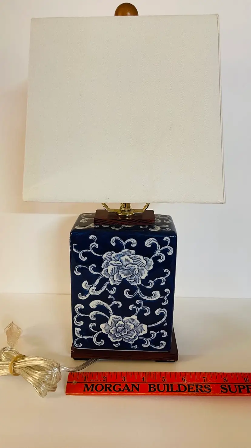 Add a touch of elegance to any room with this beautiful Ralph Lauren Blue White Lotus Flower Floral Square Accent Table Lamp. Designed with a Chinoiserie-inspired pattern, this stunning lamp features delicate porcelain flowers . The lamp is perfect for study rooms, entryways, bedrooms, or living room .The lamp cord is white, adding a subtle contrast to the blue and white color scheme.