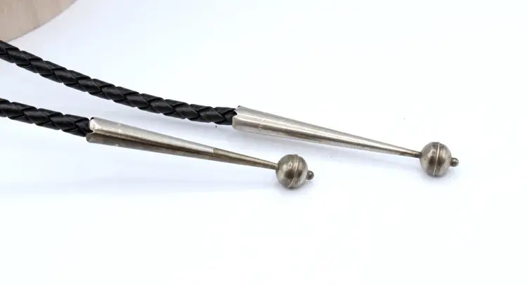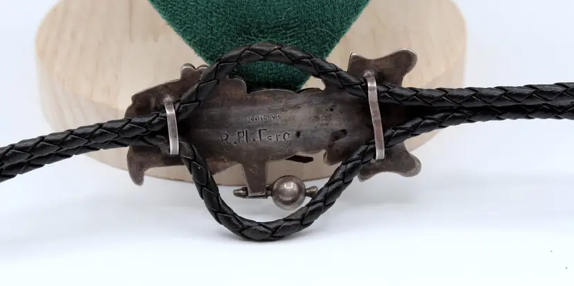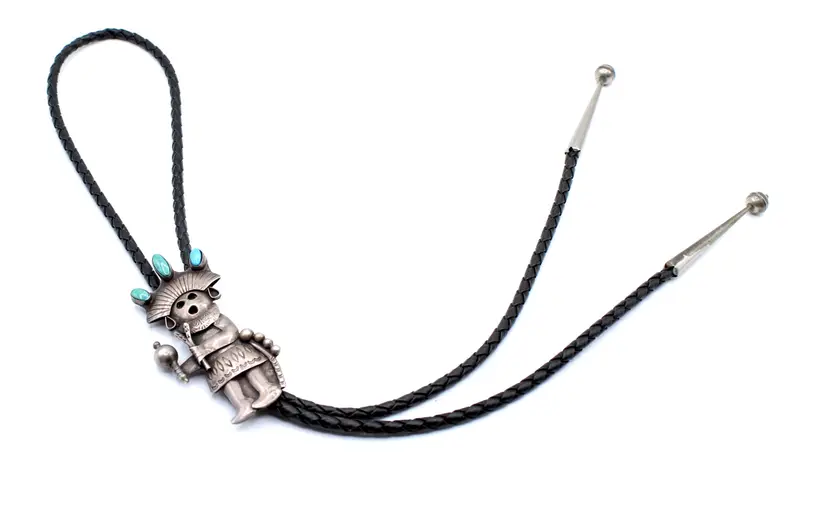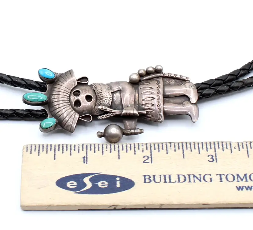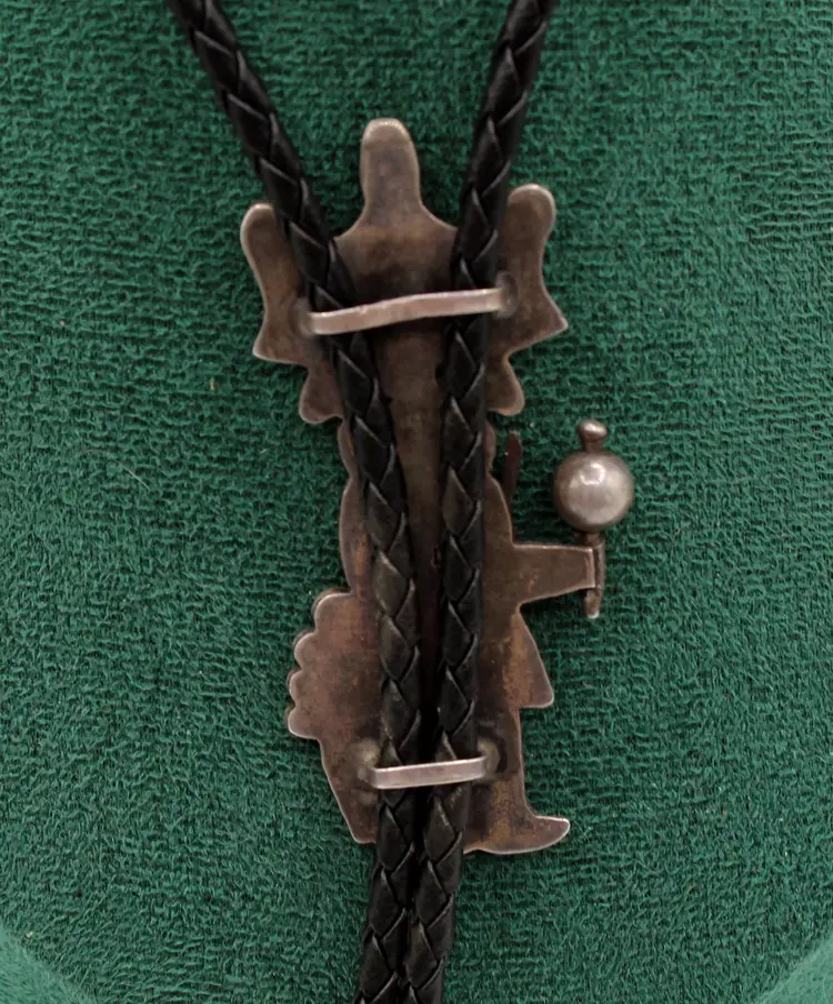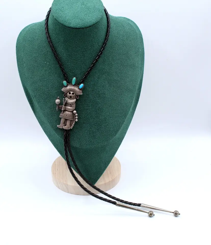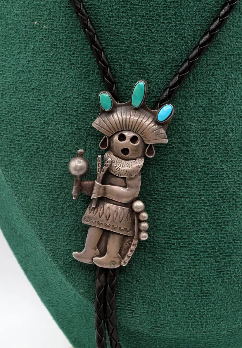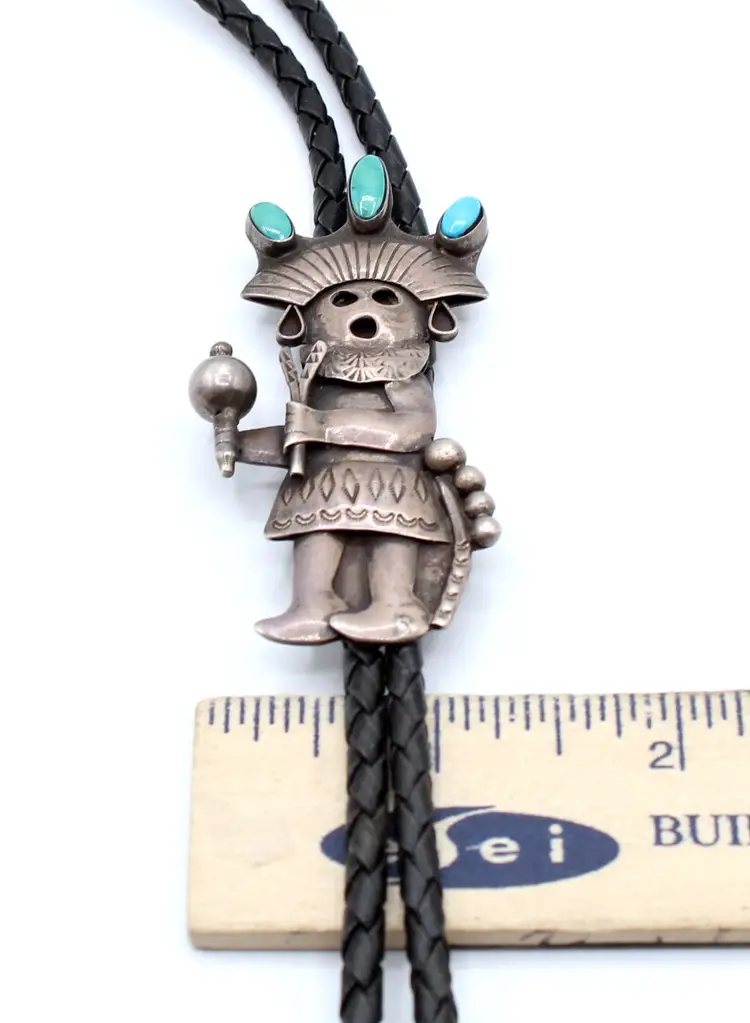 Ceremonial dance maiden kachina bolo. Signed R Platero handmade. She is all decked out with headdress with the turquoise turning green, Hand stamped with musical instruments and ready to party. Leather tie 32", kachina 3" x 1" finished with sterling tips, leather is soft and in good condition.