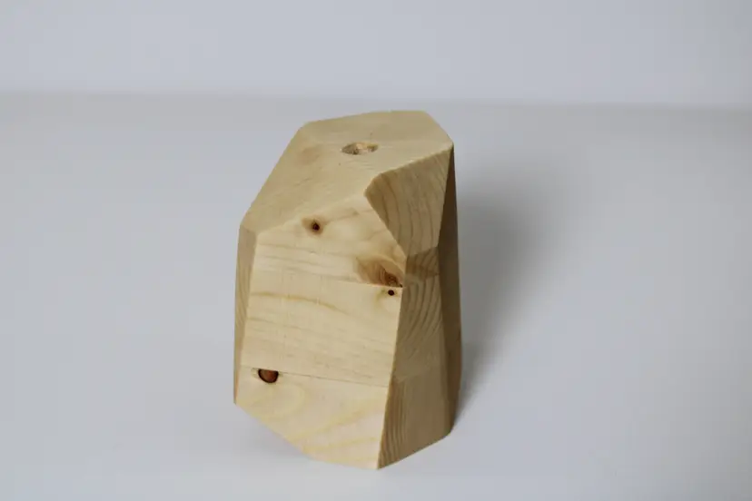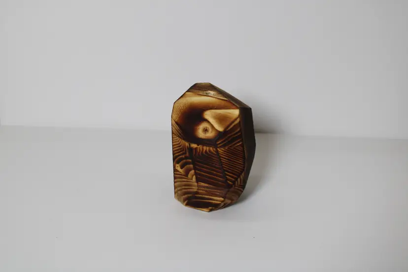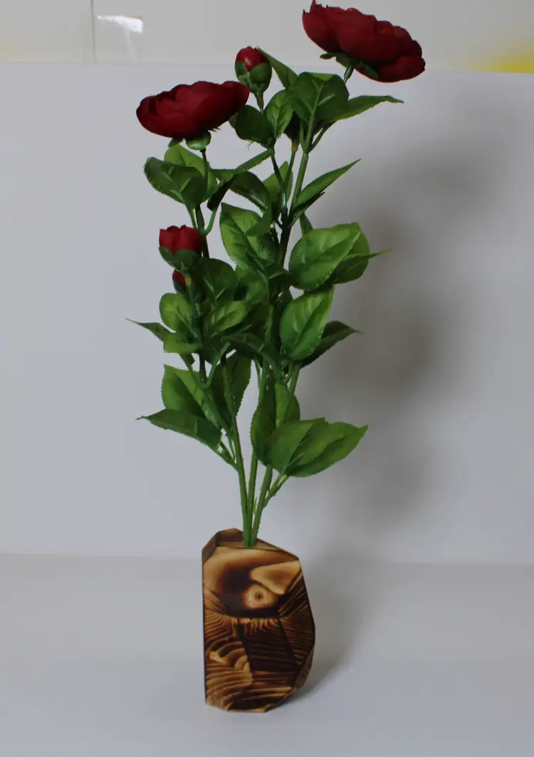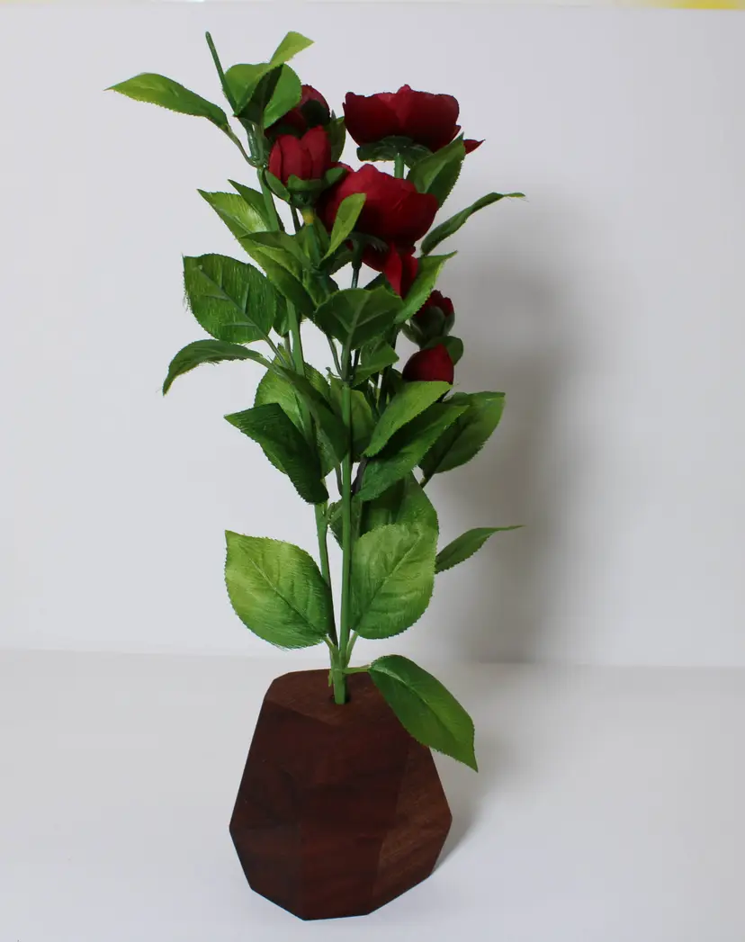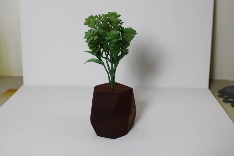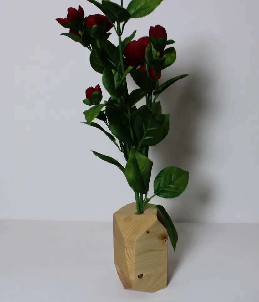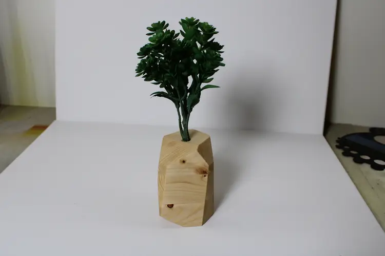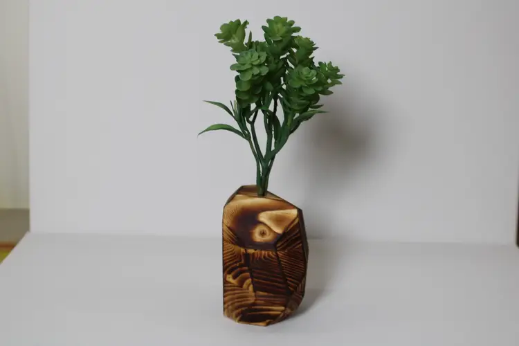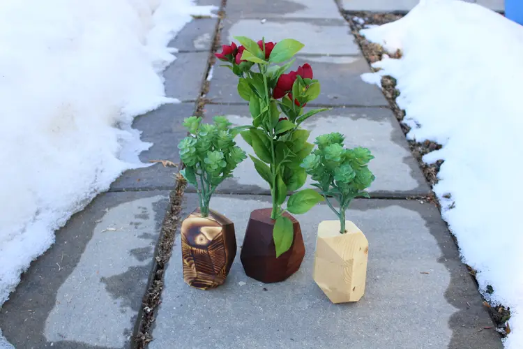 Each wooden vase is made from a glued block of the selected wood type, then cut at random angles to produce an interesting and appealing visual difference between the wood faces. The vases are then sanded until smooth, finished with Tung Oil to bring out the wood grain, and have a hole drilled to accepted an arrangement of fake plants.