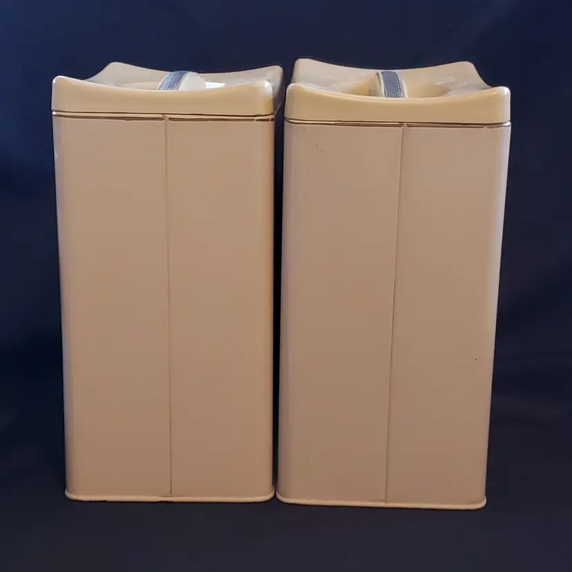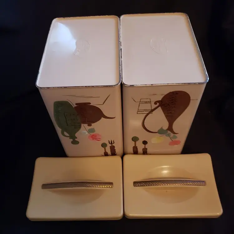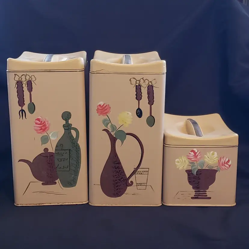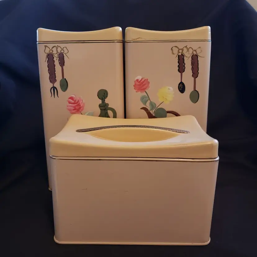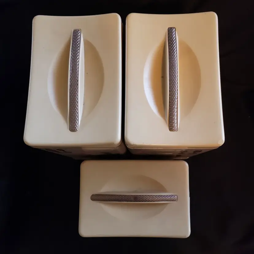 Number of Items in Set: 3 Antique: No Shape: Rectangle Color: Beige Material: Metal, Plastic Item Length: 2 Sizes Vintage: Yes Brand: Ransburg Type: Canister Set Original/Licensed Reproduction: Original Item Height: 2 Sizes Number in Pack: 3 Style: Vintage/Retro Item Width: 2 Sizes