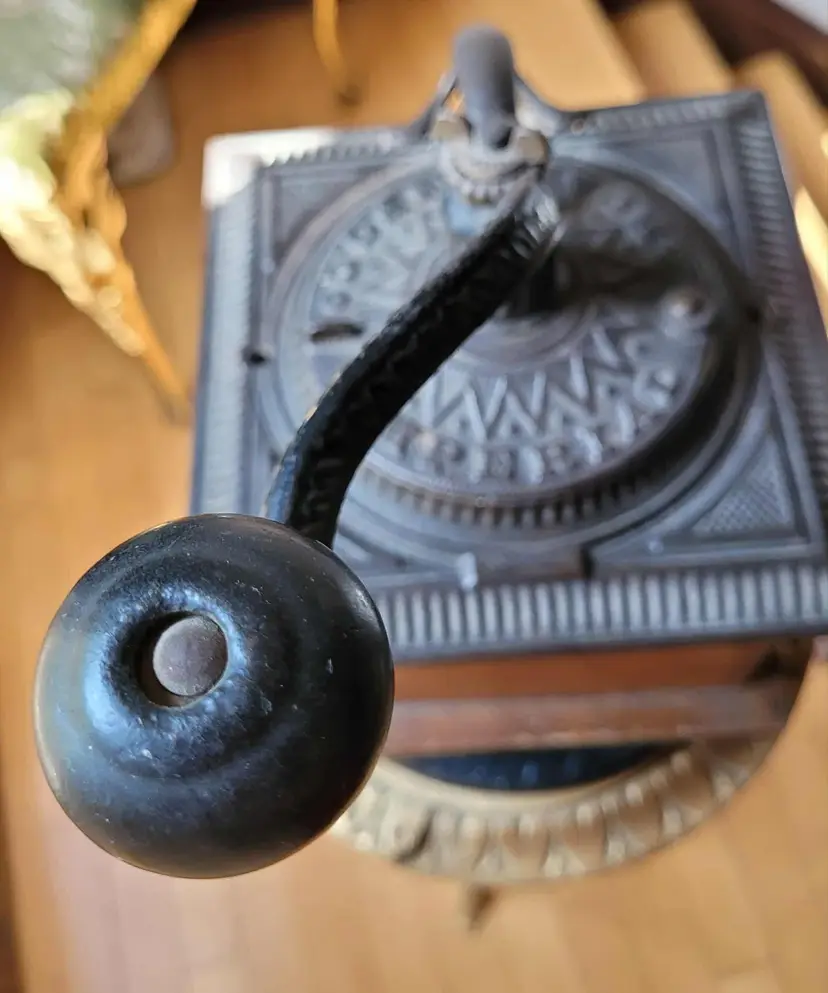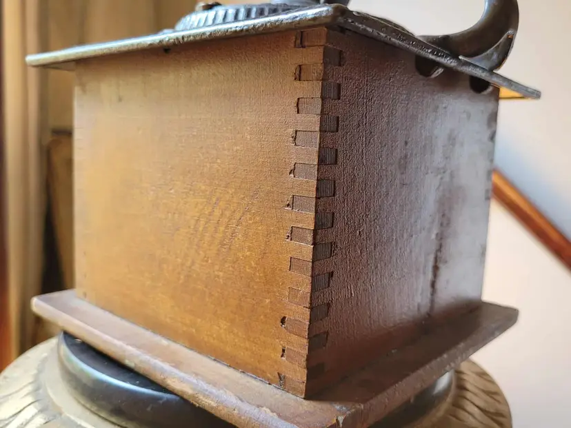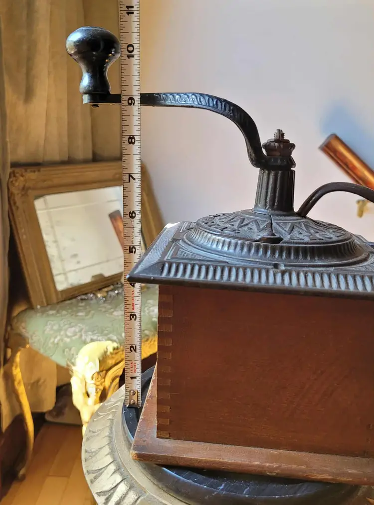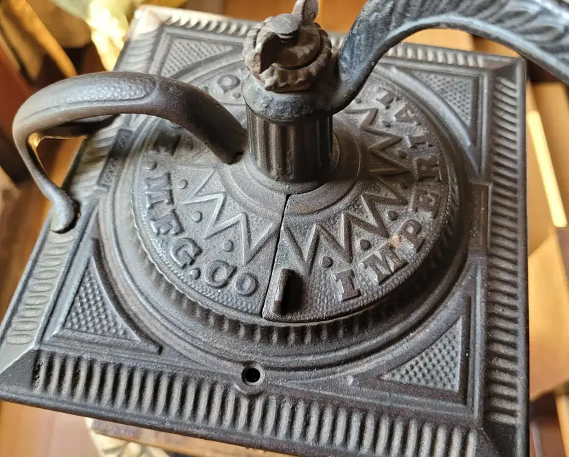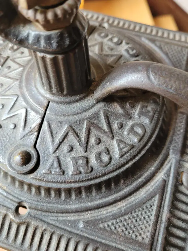 Fantastic rare Victorian Arcade Imperial tabletop coffee grinder, with a dovetailed wooden base and full cast iron top. It is in good condition considering its age and utilitarian use; there are signs of wear particularly on the wood so please see pictures for details and measurements.