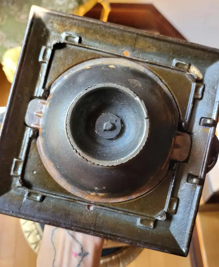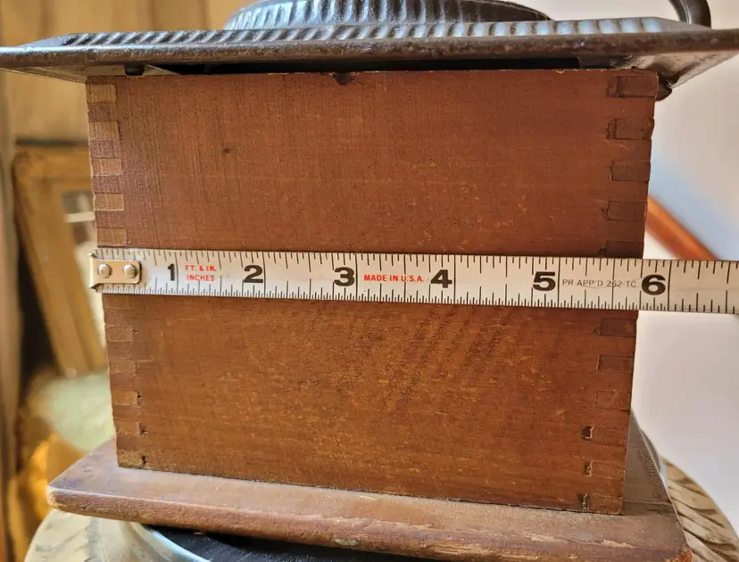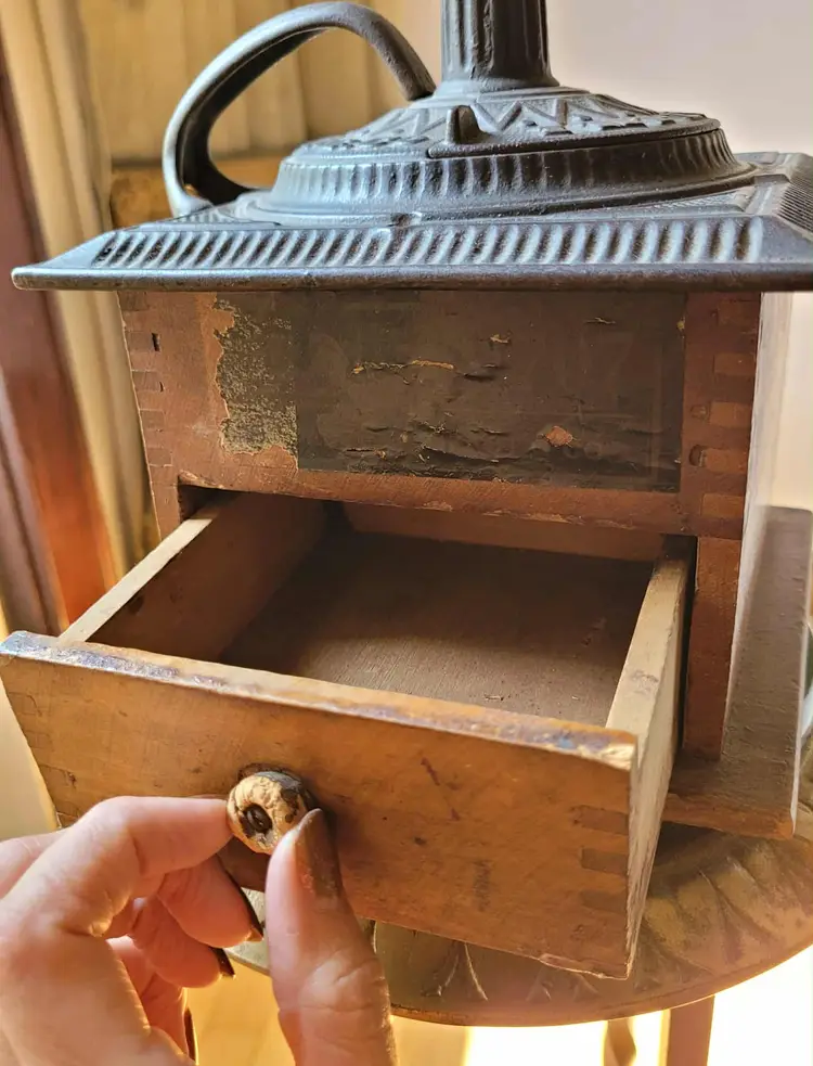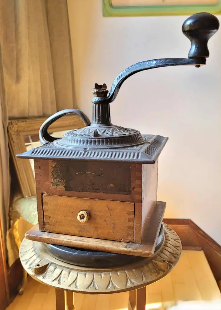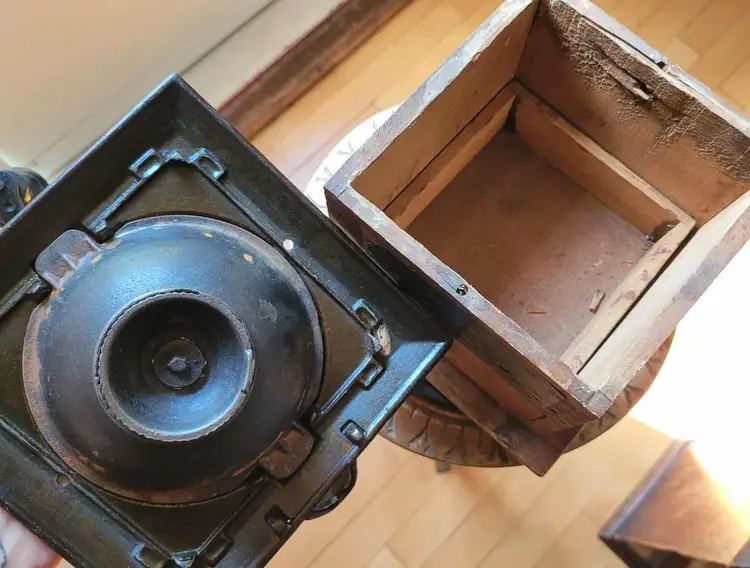 Fantastic rare Victorian Arcade Imperial tabletop coffee grinder, with a dovetailed wooden base and full cast iron top. It is in good condition considering its age and utilitarian use; there are signs of wear particularly on the wood so please see pictures for details and measurements.