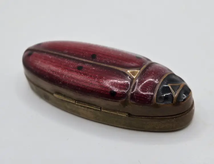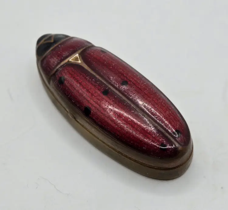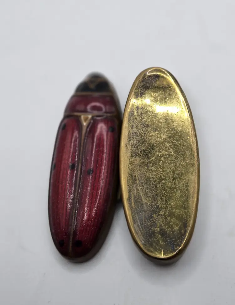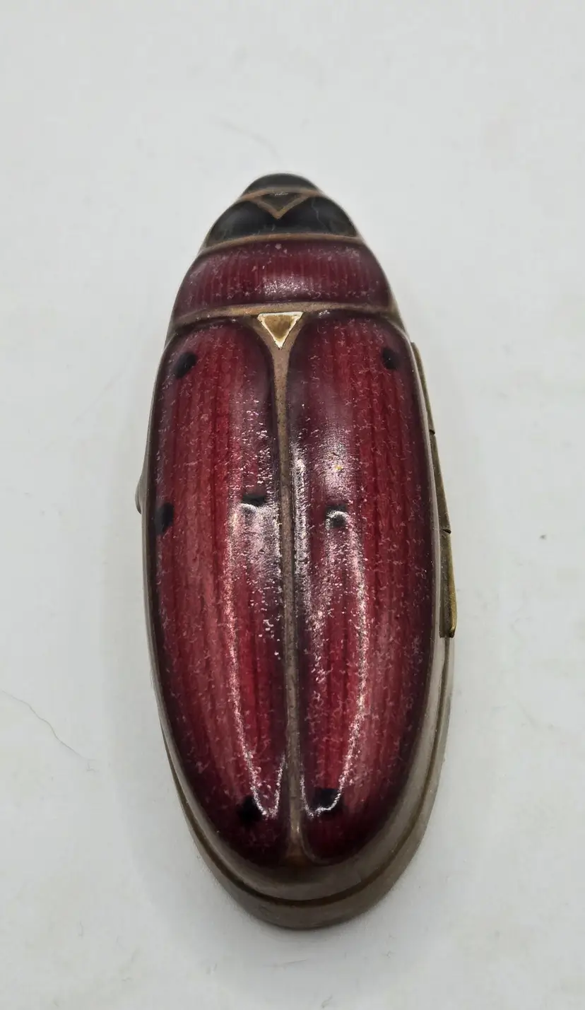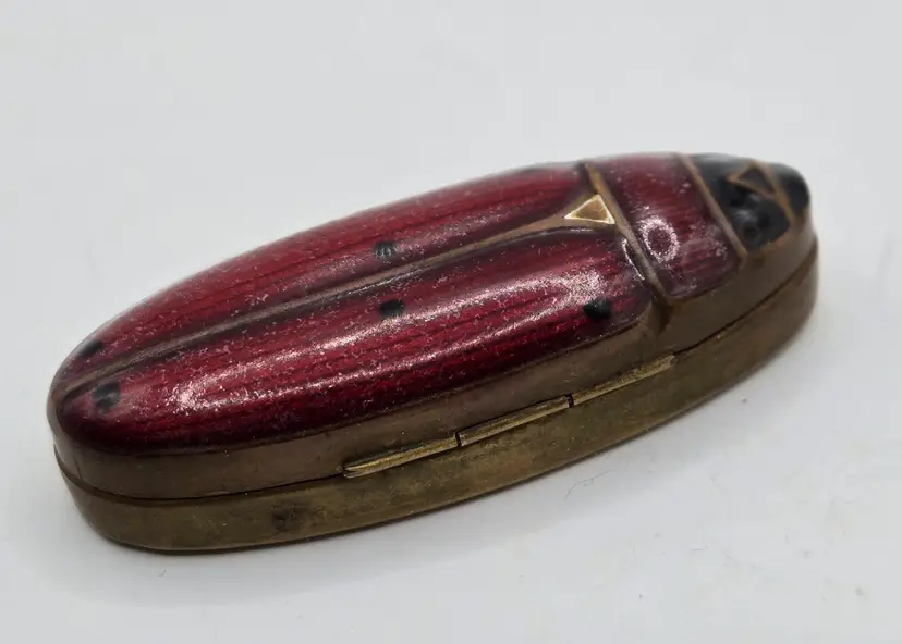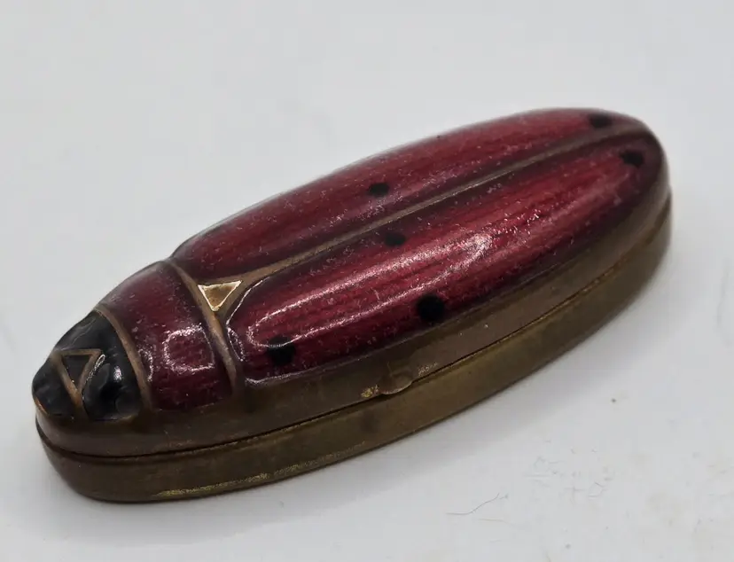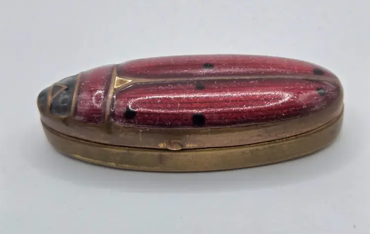 Rare 1920s-1930s Antique Brass Enamel Ladybug Trinket Box Curiosity. 2 3/4" x 1 1/8" Beautiful enameled, hinged brass trinket box from early 20th century. Lots of patina on brass. No damage. Such an unusual item. In vintage untouched condition. I have not cleaned patina off of the brass as it adds character and shows the age of item. Please check photos as they are part of the description. Item will be well wrapped before shipping. Items from my listings can be combined for shipping if safe to do so.
