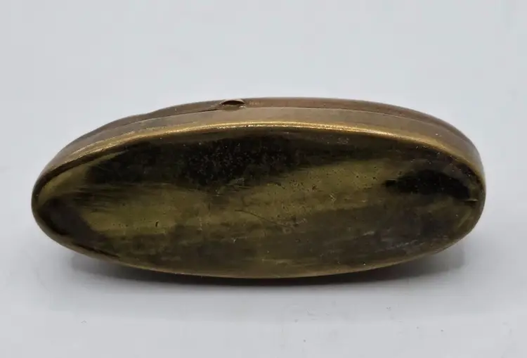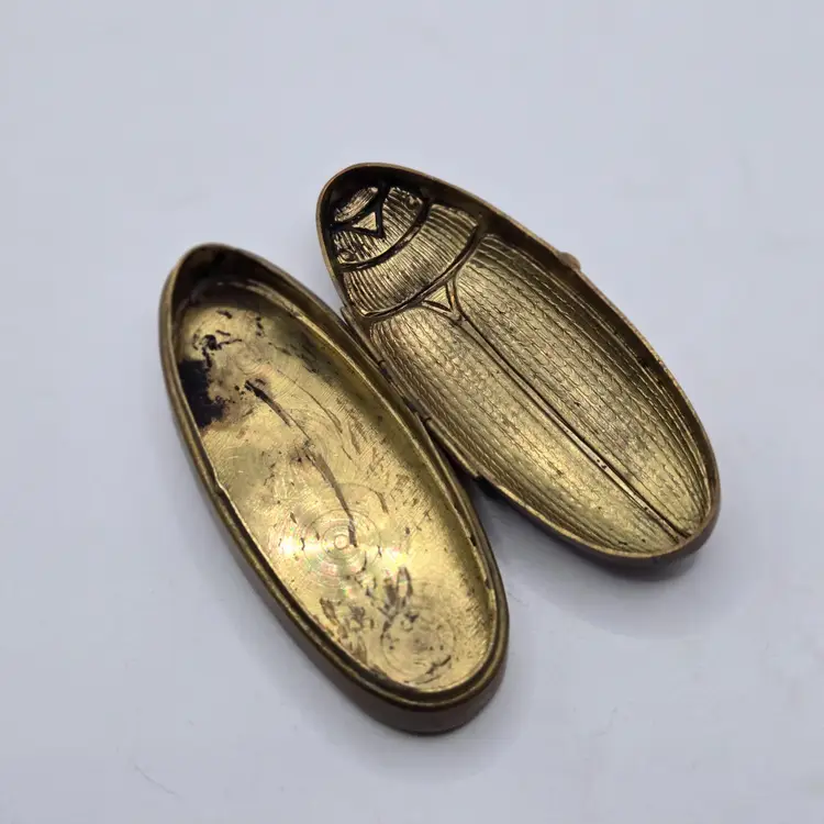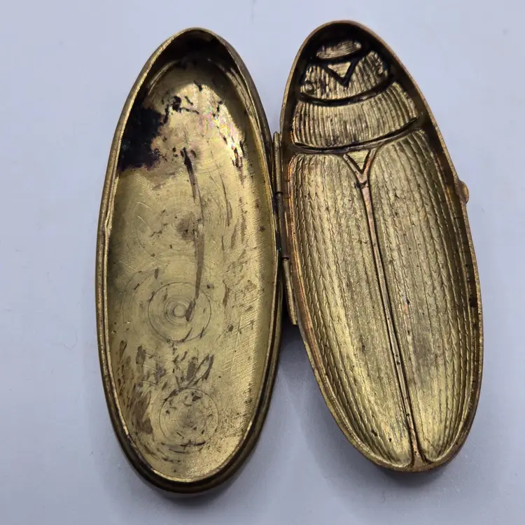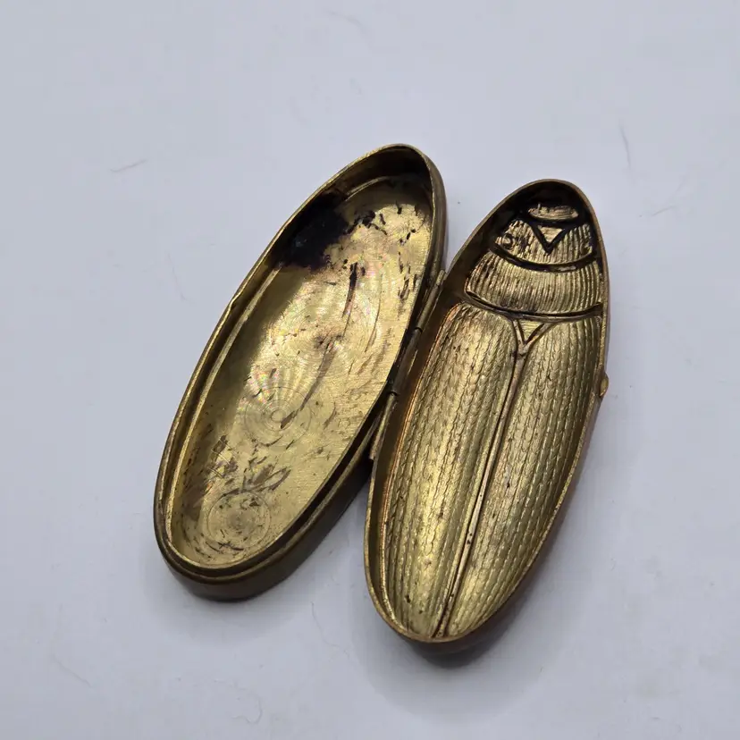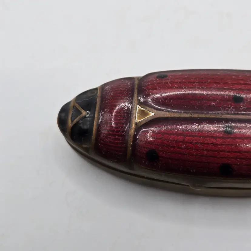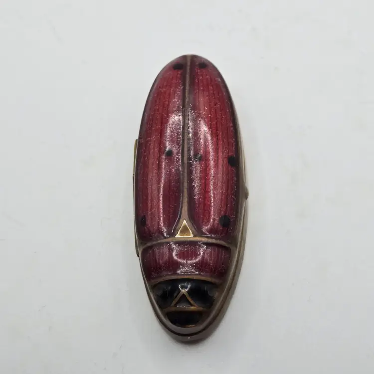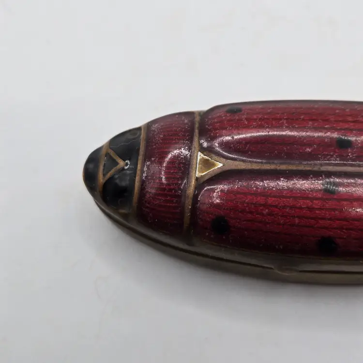 Rare 1920s-1930s Antique Brass Enamel Ladybug Trinket Box Curiosity. 2 3/4" x 1 1/8" Beautiful enameled, hinged brass trinket box from early 20th century. Lots of patina on brass. No damage. Such an unusual item. In vintage untouched condition. I have not cleaned patina off of the brass as it adds character and shows the age of item. Please check photos as they are part of the description. Item will be well wrapped before shipping. Items from my listings can be combined for shipping if safe to do so.
