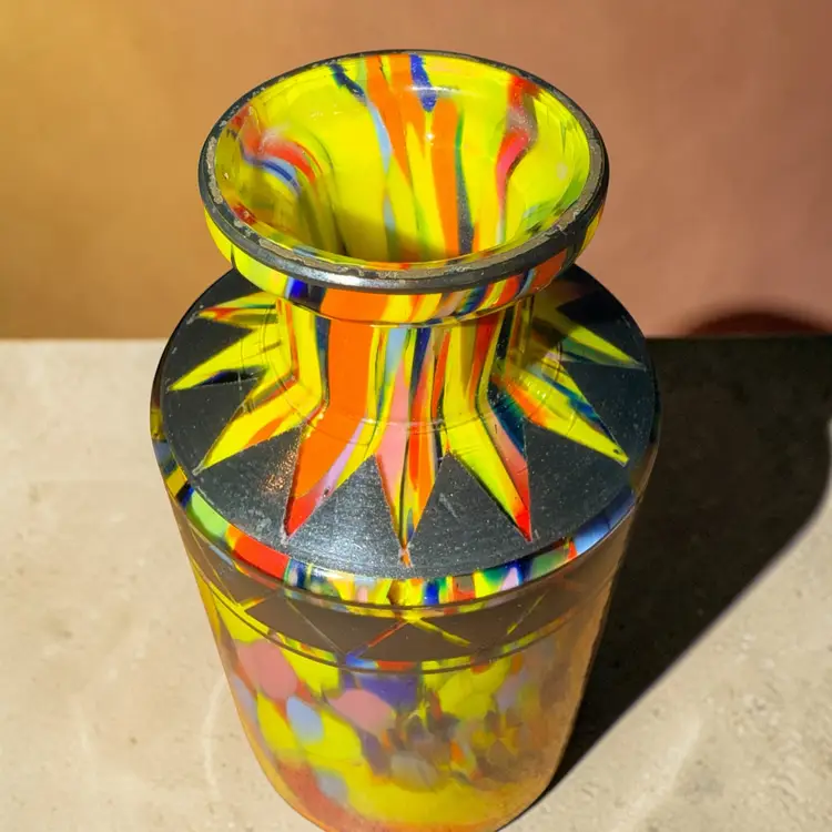 This vibrant piece features a dramatic multicolor spatter glass body with bright yellow ground and colorful confetti tones of red, blue, orange, and green. Around the shoulder is a bold black geometric Art Deco design, a decorative style strongly associated with Bohemian glass from the early 20th century.