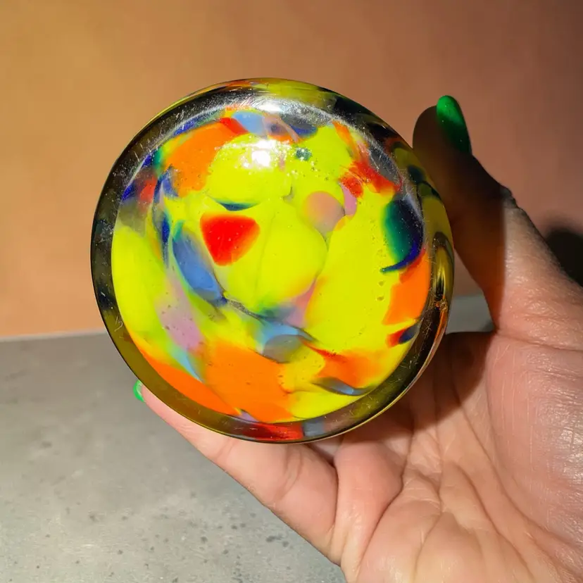 A beautiful and colorful example of Bohemian Art Deco glass, perfect for collectors of antique vanity items, Czech art glass, or Art Deco décor.