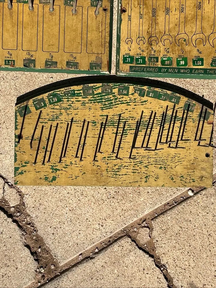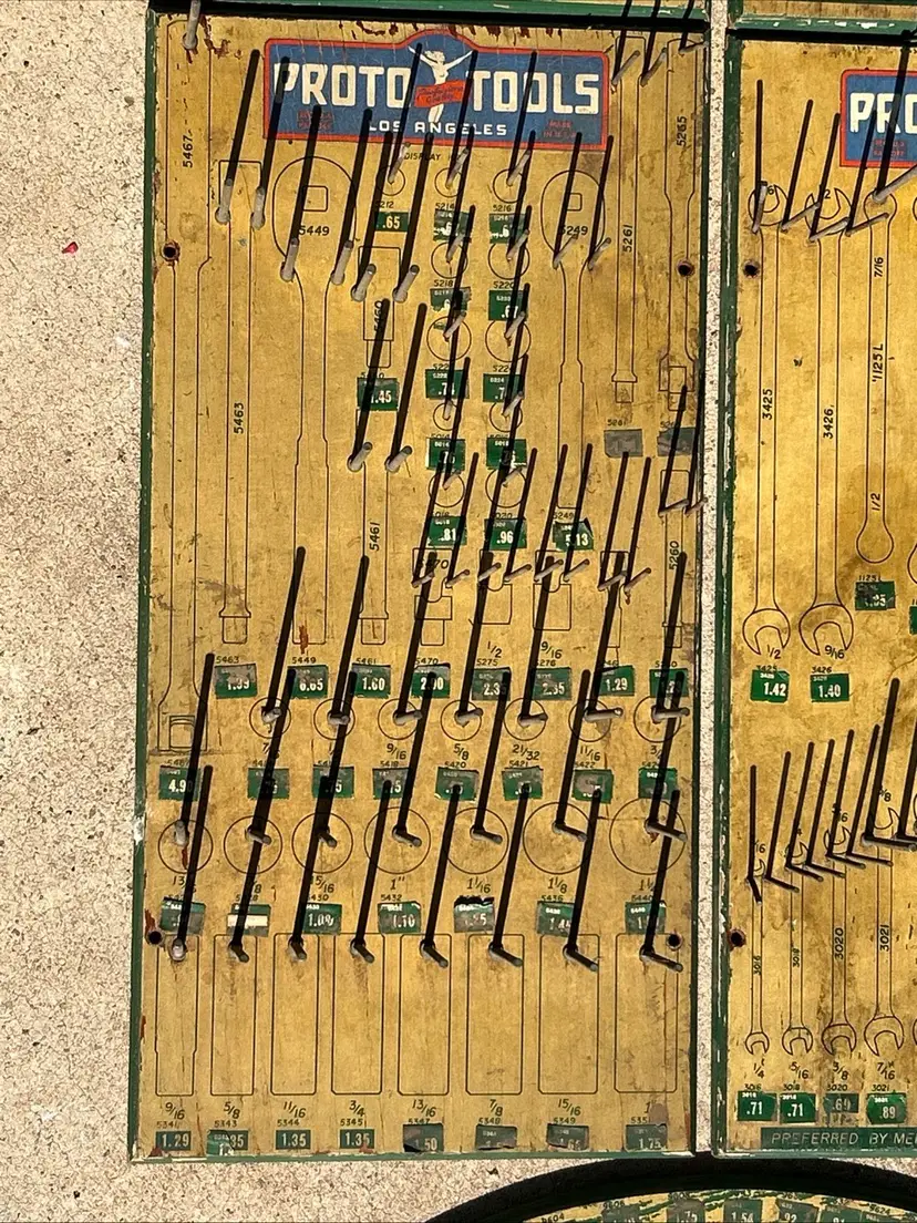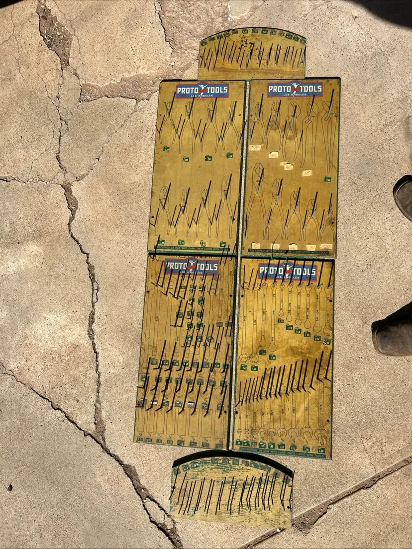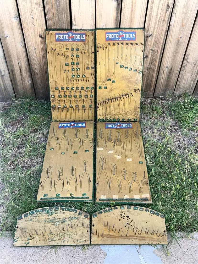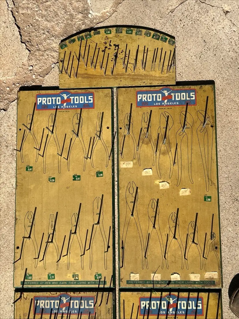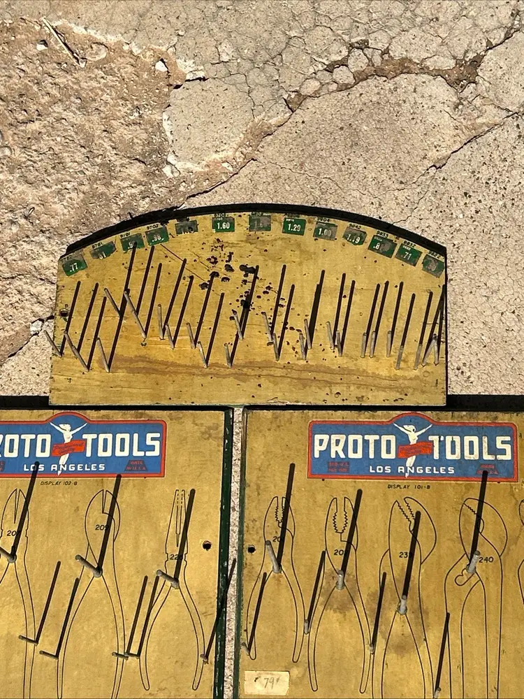 This product is a rare lot of 6 Plomb tools from the 1940s, featuring the iconic Proto Tools brand. These vintage display items are advertising pieces from the era, highlighting the history and craftsmanship of the Los Angeles dealer board. The multi-color signs serve as a unique collectible for enthusiasts of advertising memorabilia and store displays, showcasing a piece of American industrial history.