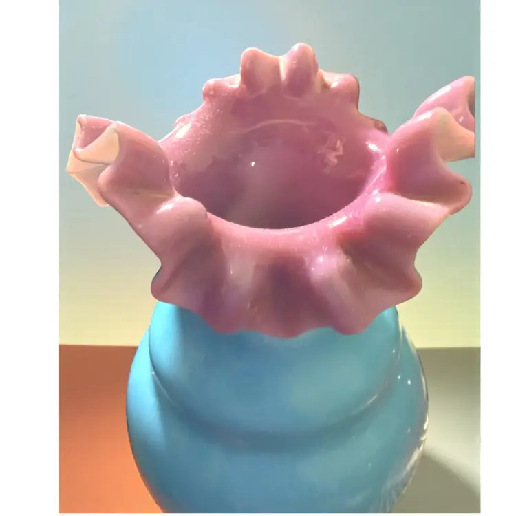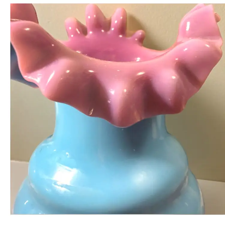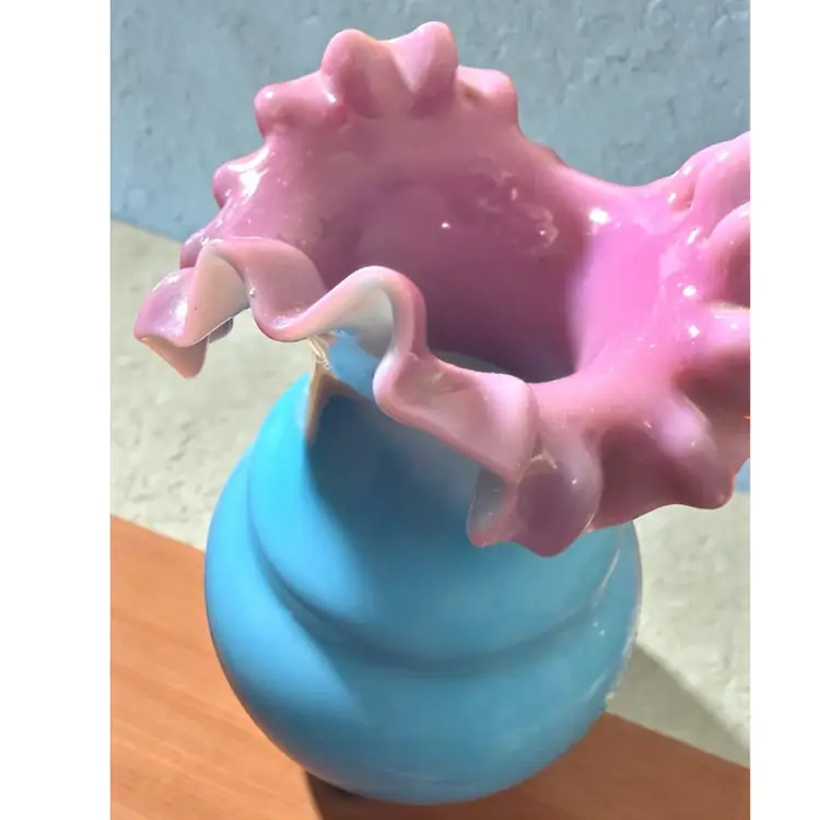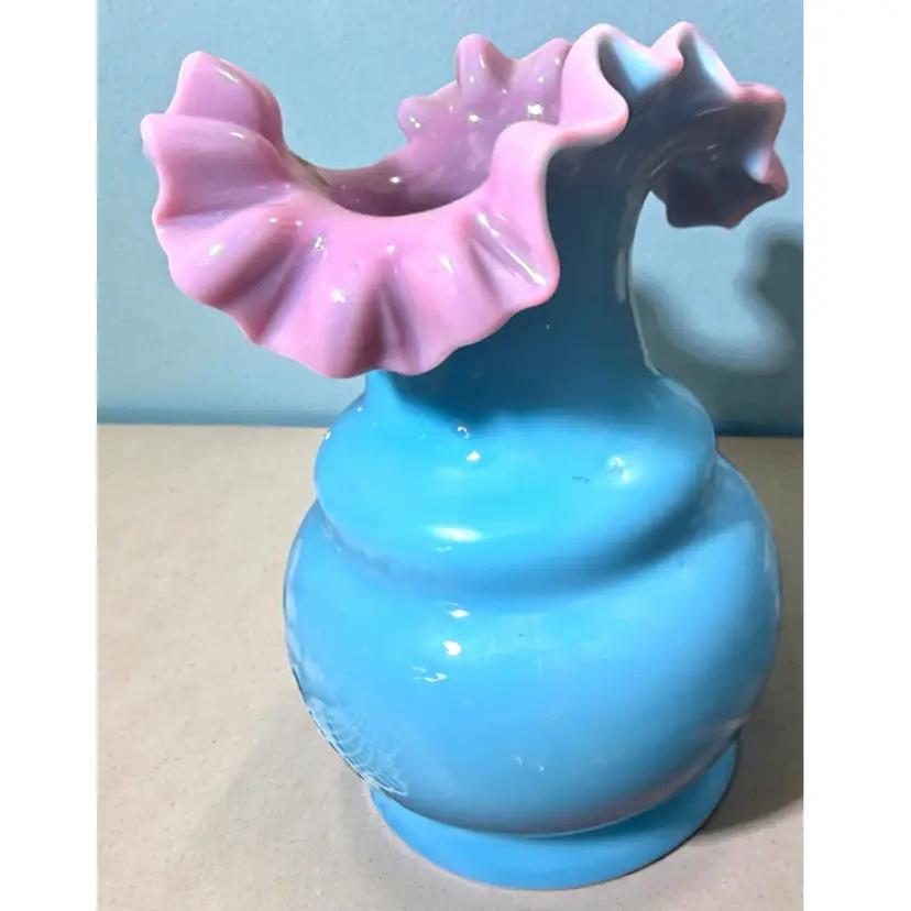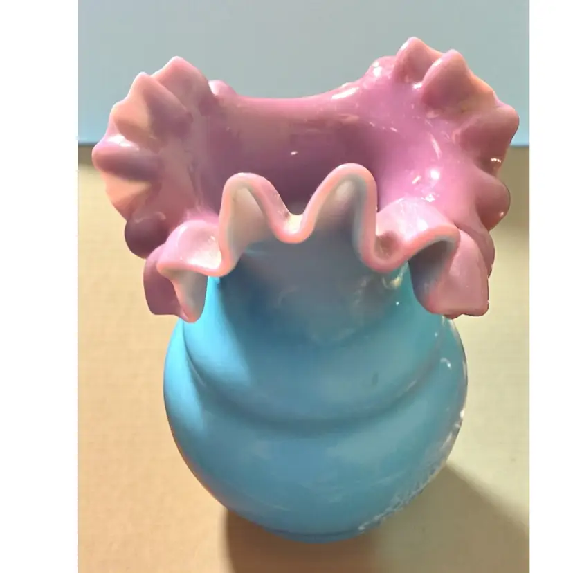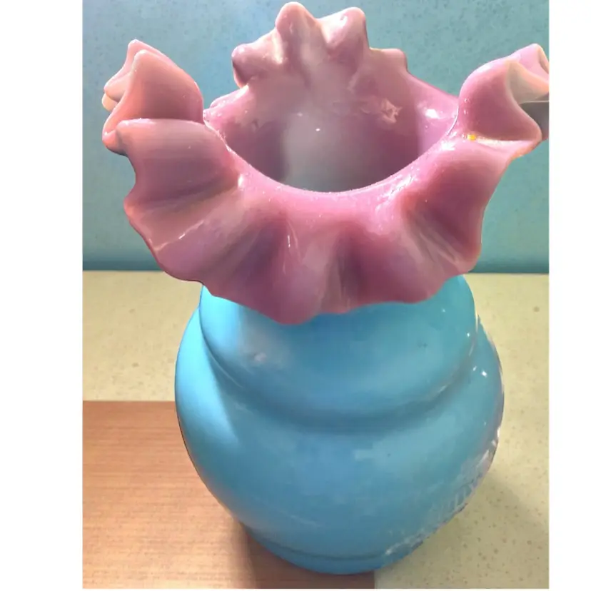 Researched to be probable Bohemian hand blown turquoise lilac cased ruffled milk glass. No cracks or chips - excellent vintage condition.