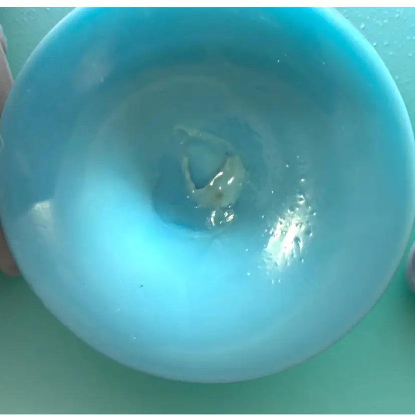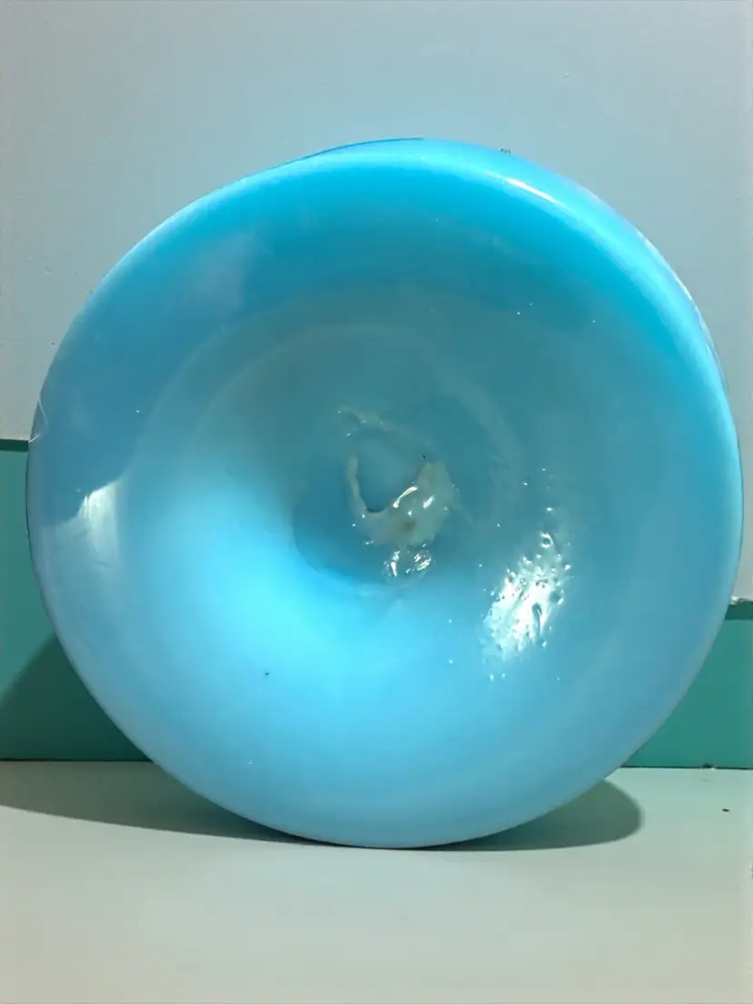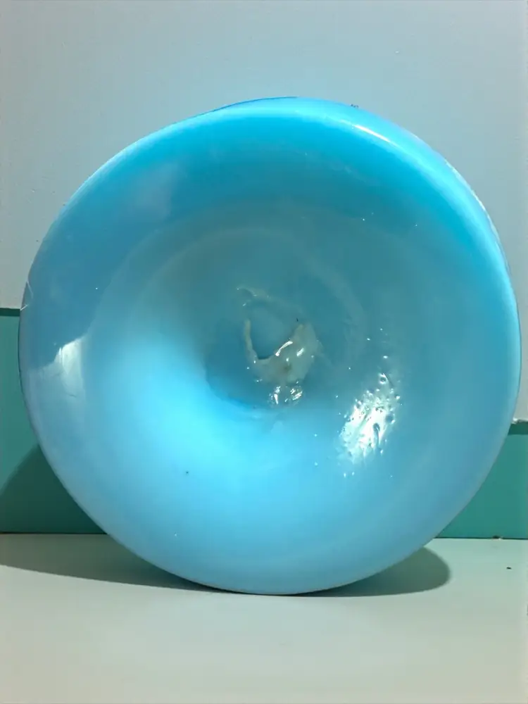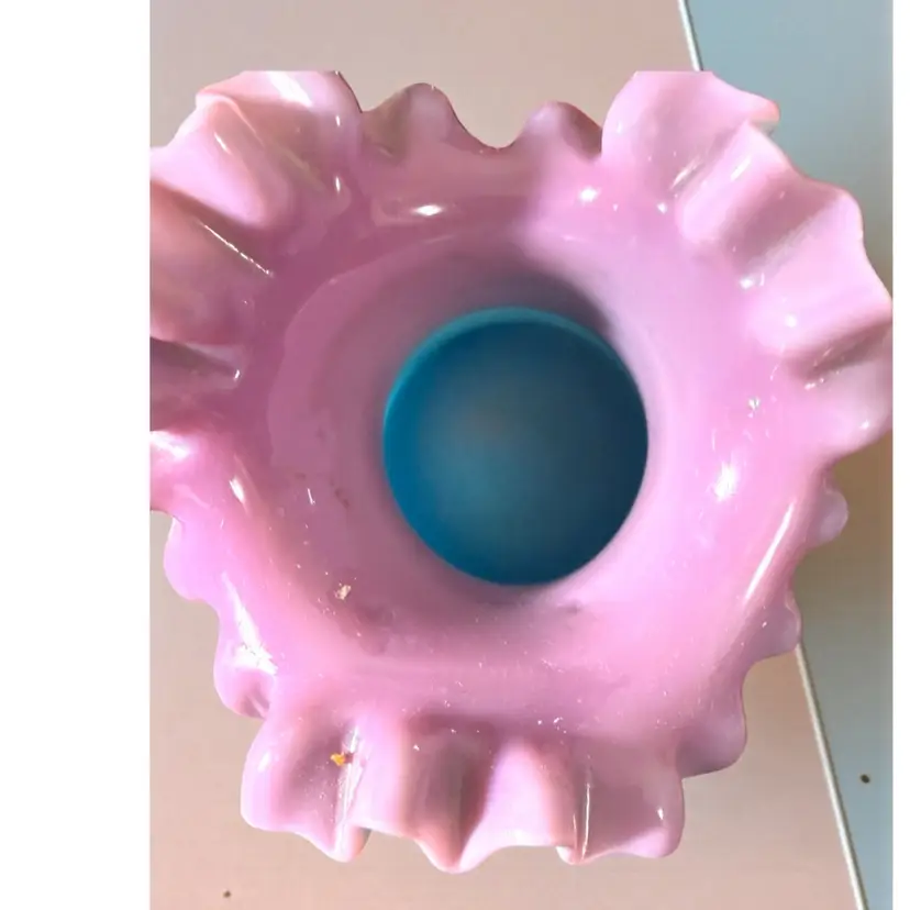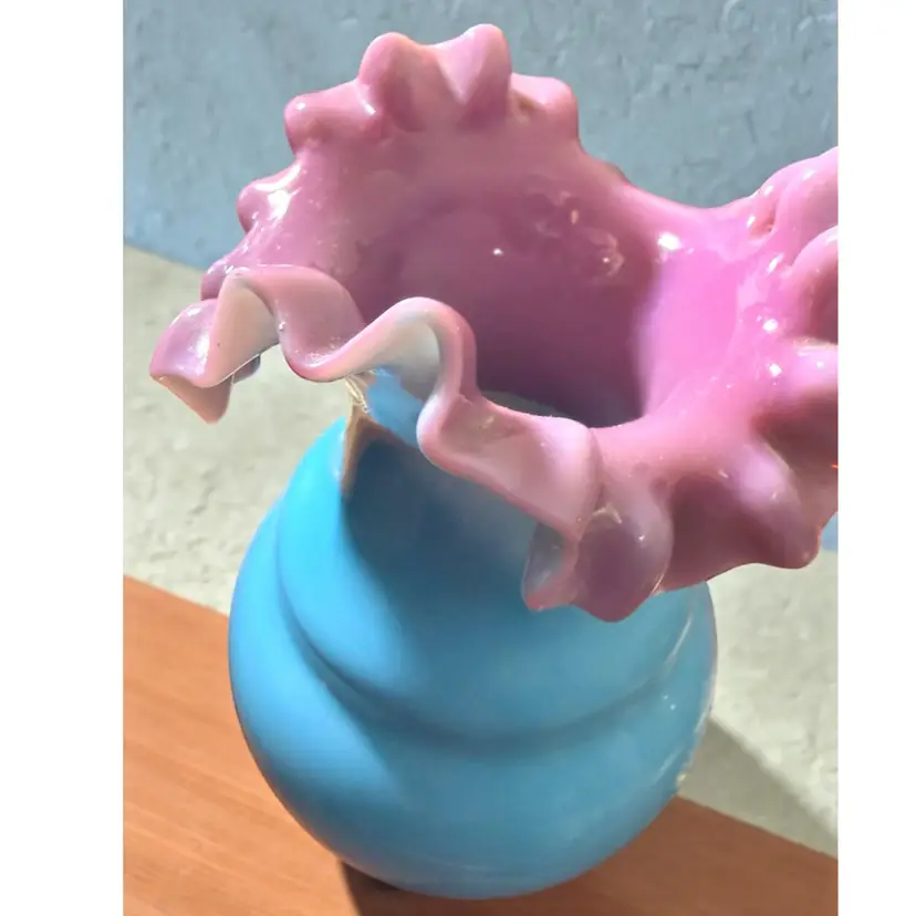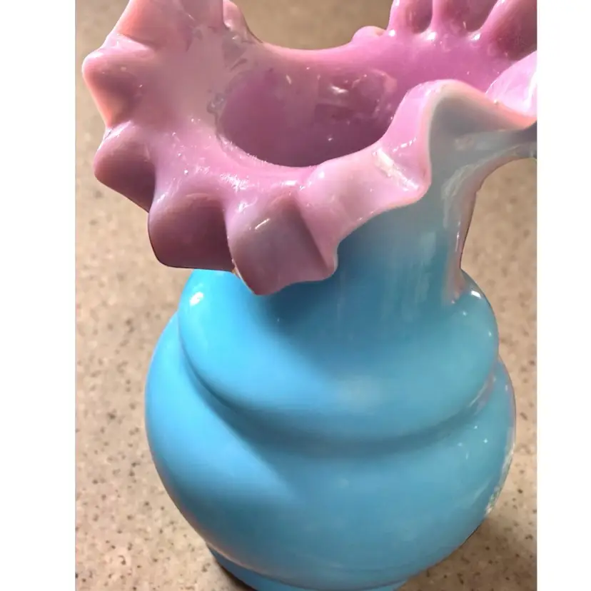 Researched to be probable Bohemian hand blown turquoise lilac cased ruffled milk glass. No cracks or chips - excellent vintage condition.
