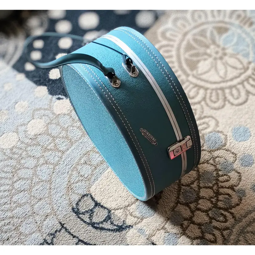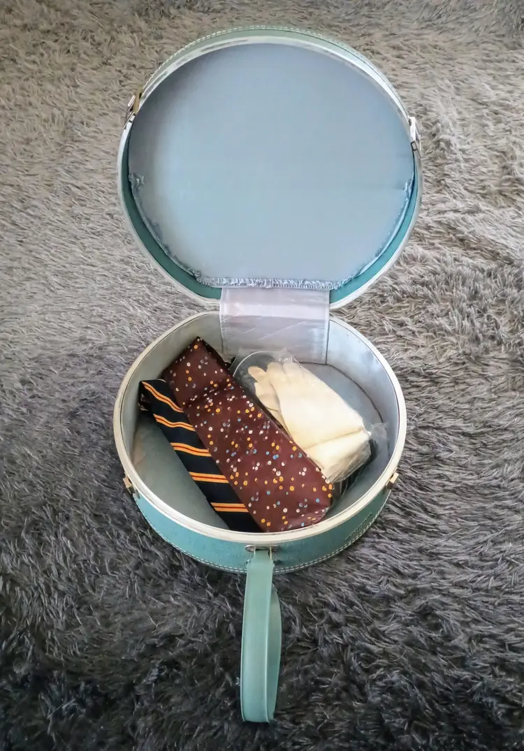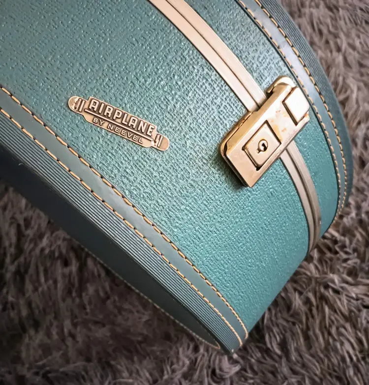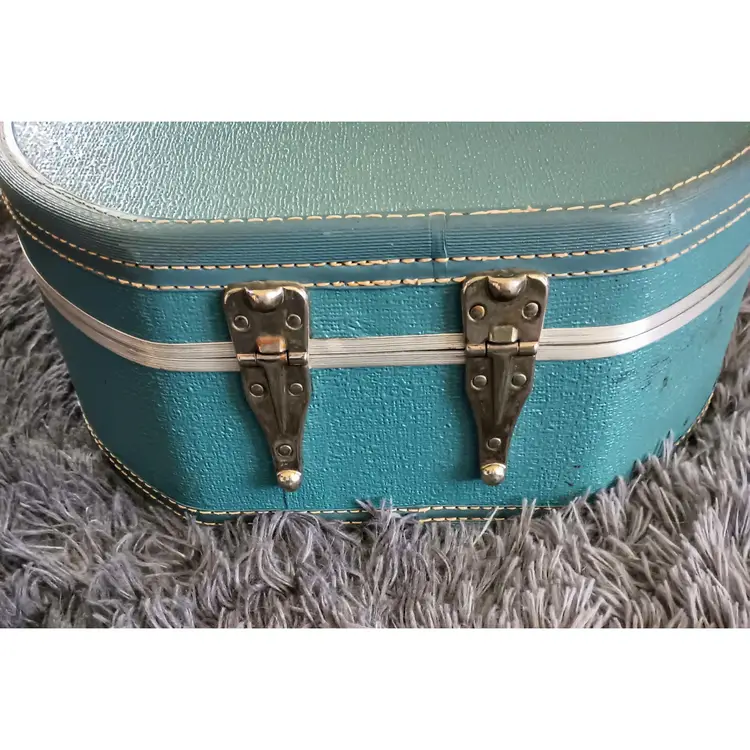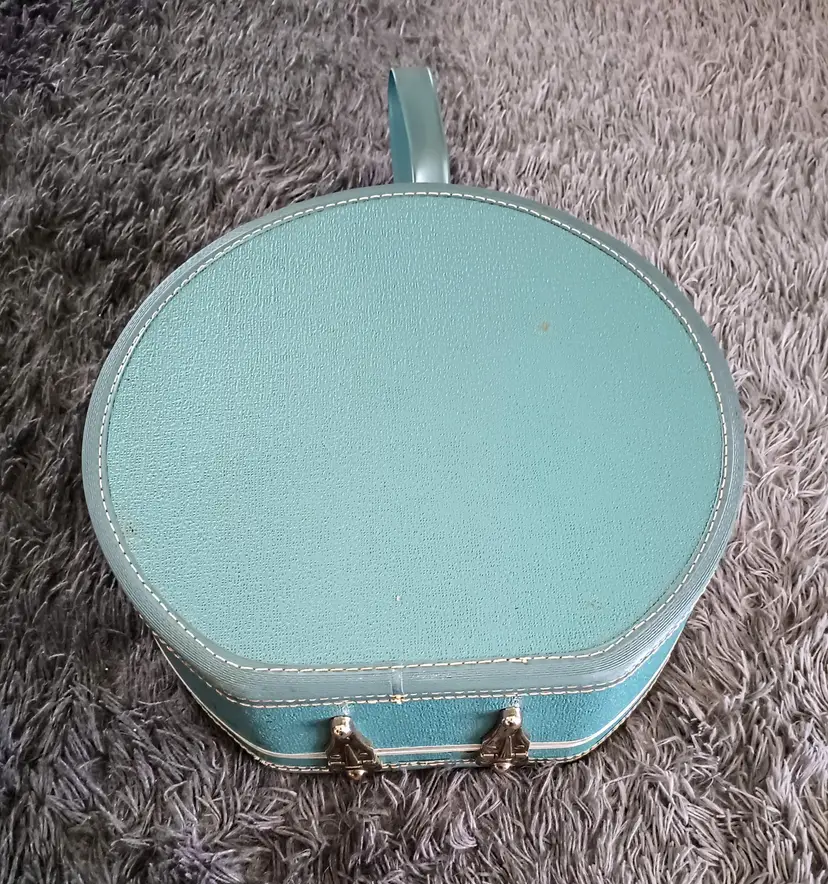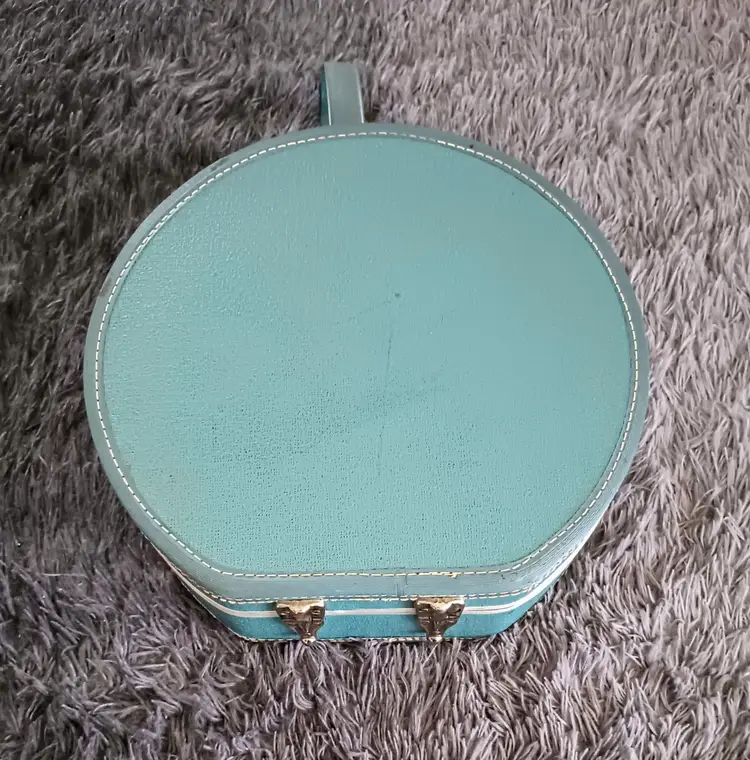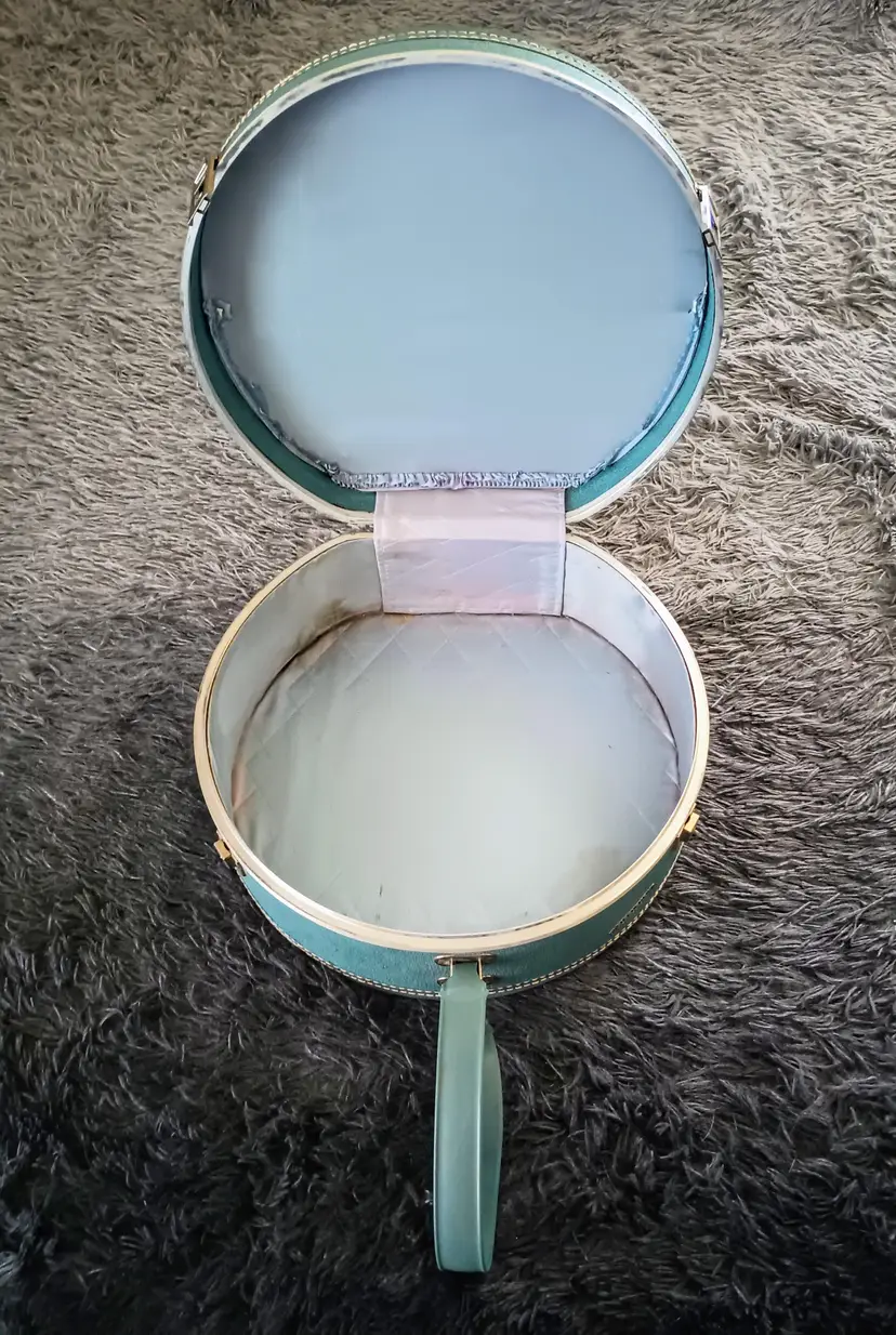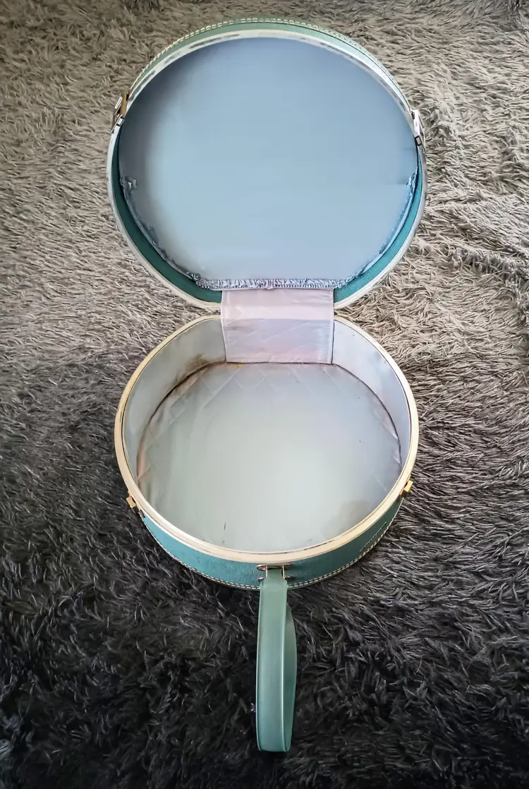 Dating back to the '60's or earlier, round hardshell travel case from 'Airplane by Neevel' ~ This was a U.S.A. company based in Missouri, with its beginning in the 1930's and extinction in the 1970s. Measures roughly 15 1/2" x 14 1/2". Has minor outside scuffing, but very minimal. The inside does have some issues, with some minor/major staining (depending how you feel about it) on the bottom of the case. There is no odor, and it looks to me like maybe some old makeup stains, as these were used as cosmetic cases as well as travel cases. Overall, the case is a unique find, totally functional for use, or super cool as a display piece ... Please see pictures and as always, thanks for stopping by!