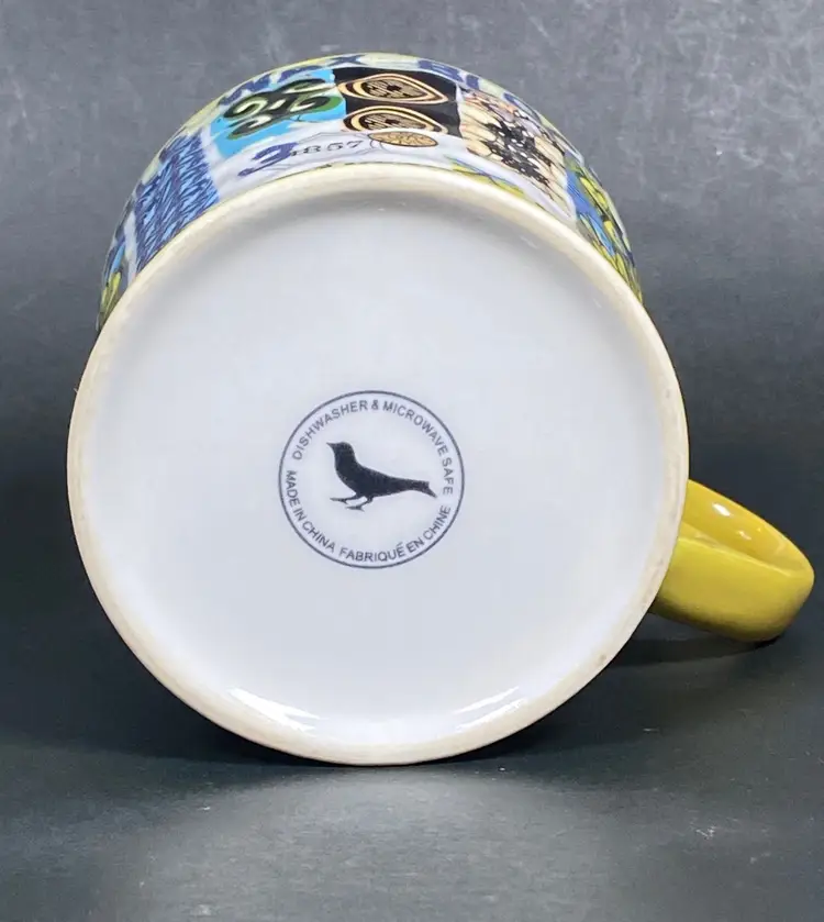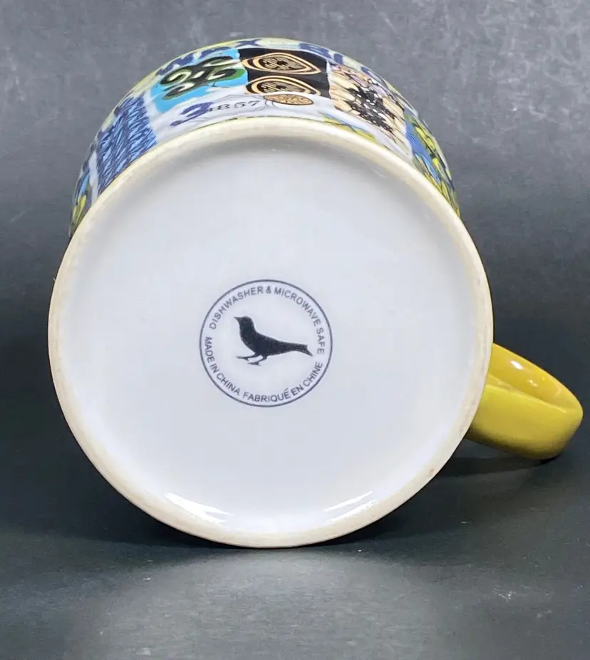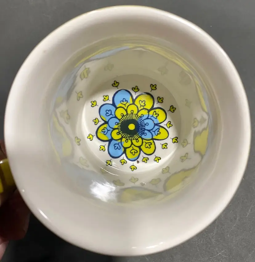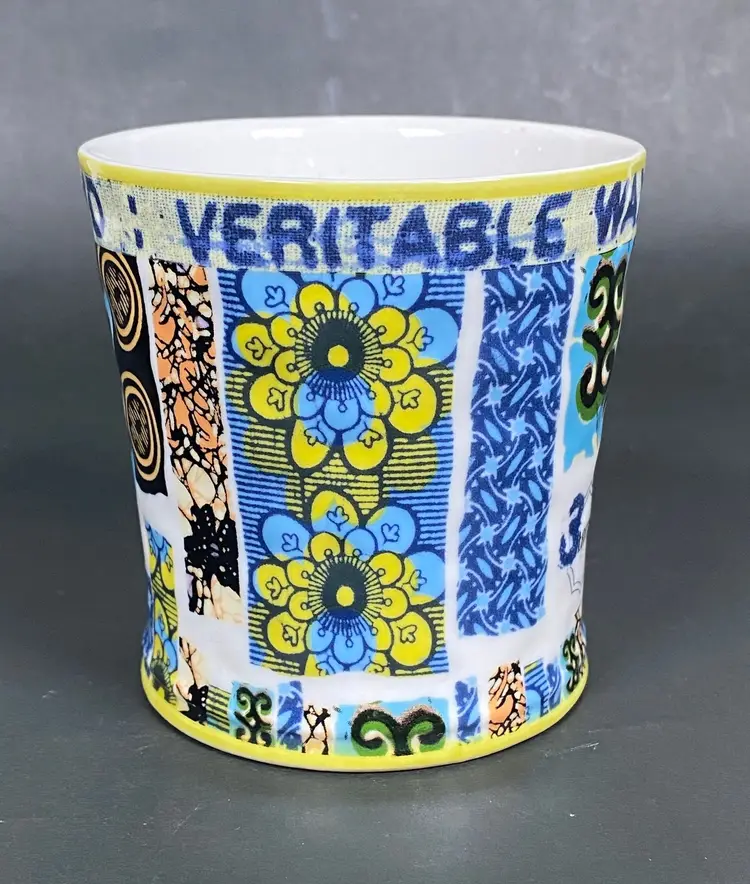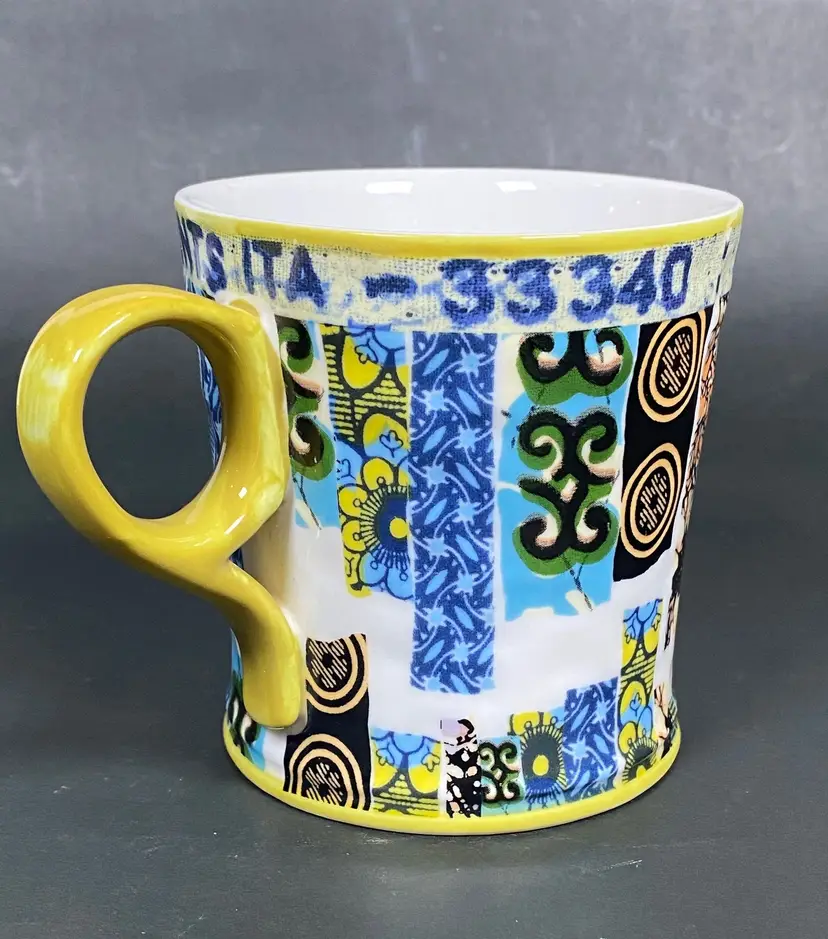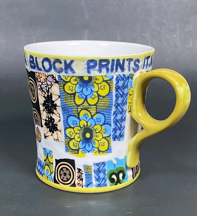 Rare Anthropologie coffee/tea mug with a floral pattern exterior and beautiful pattern inside. Embellished design text reads "Veritable Wax Block Prints ITA 33340". This item is new. In excellent condition. Height: 4 inches tall.