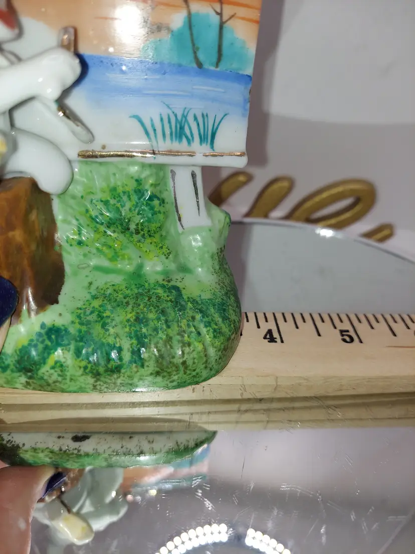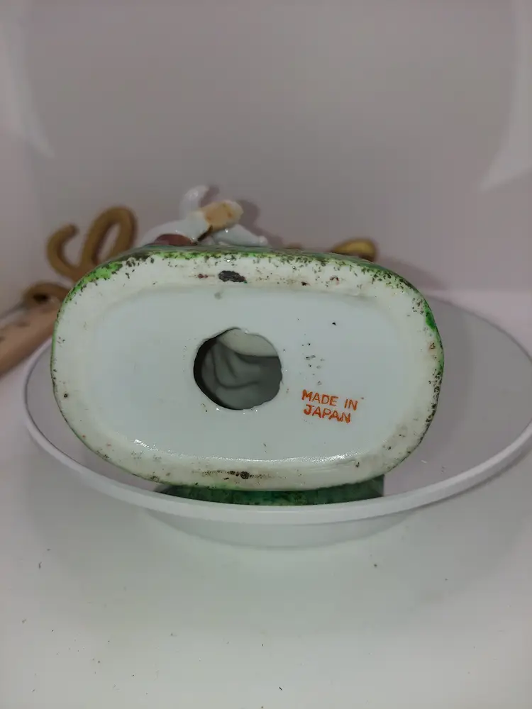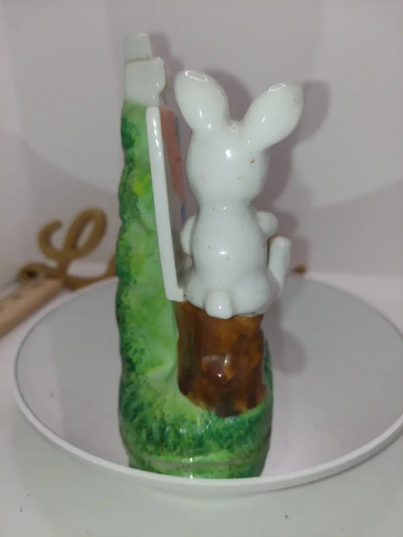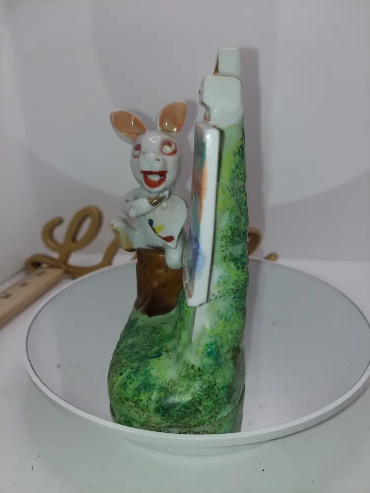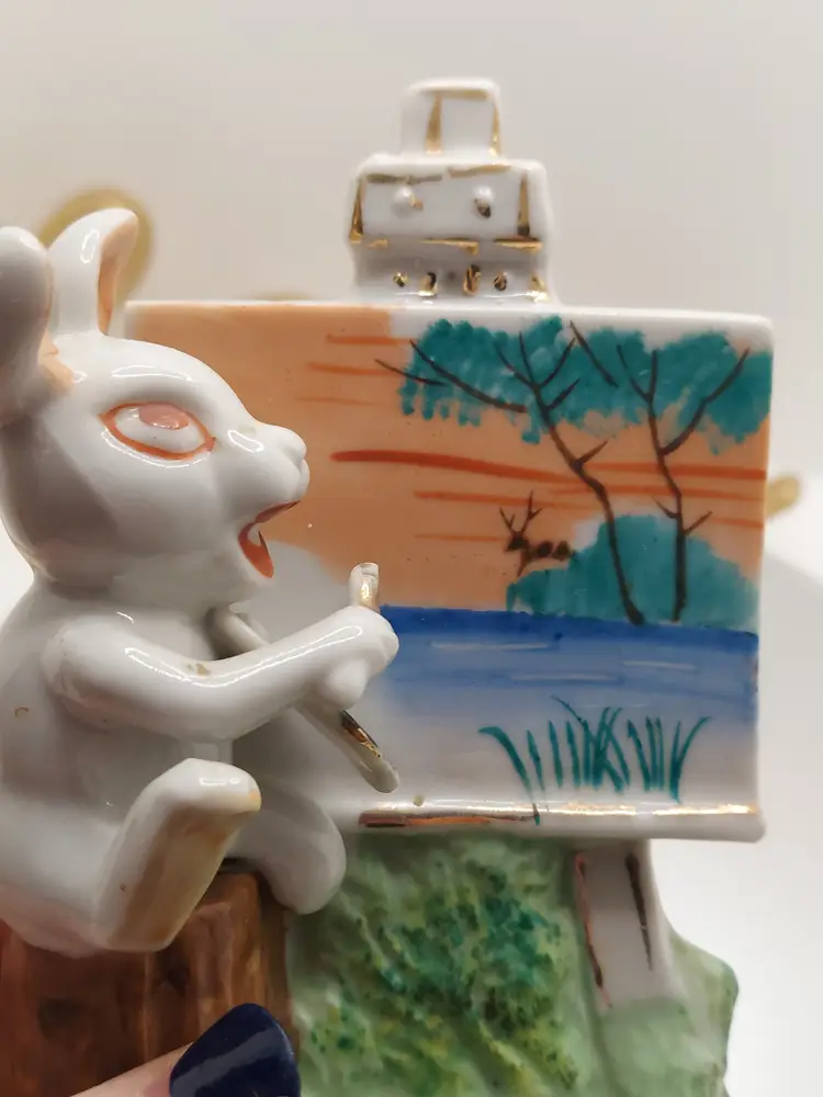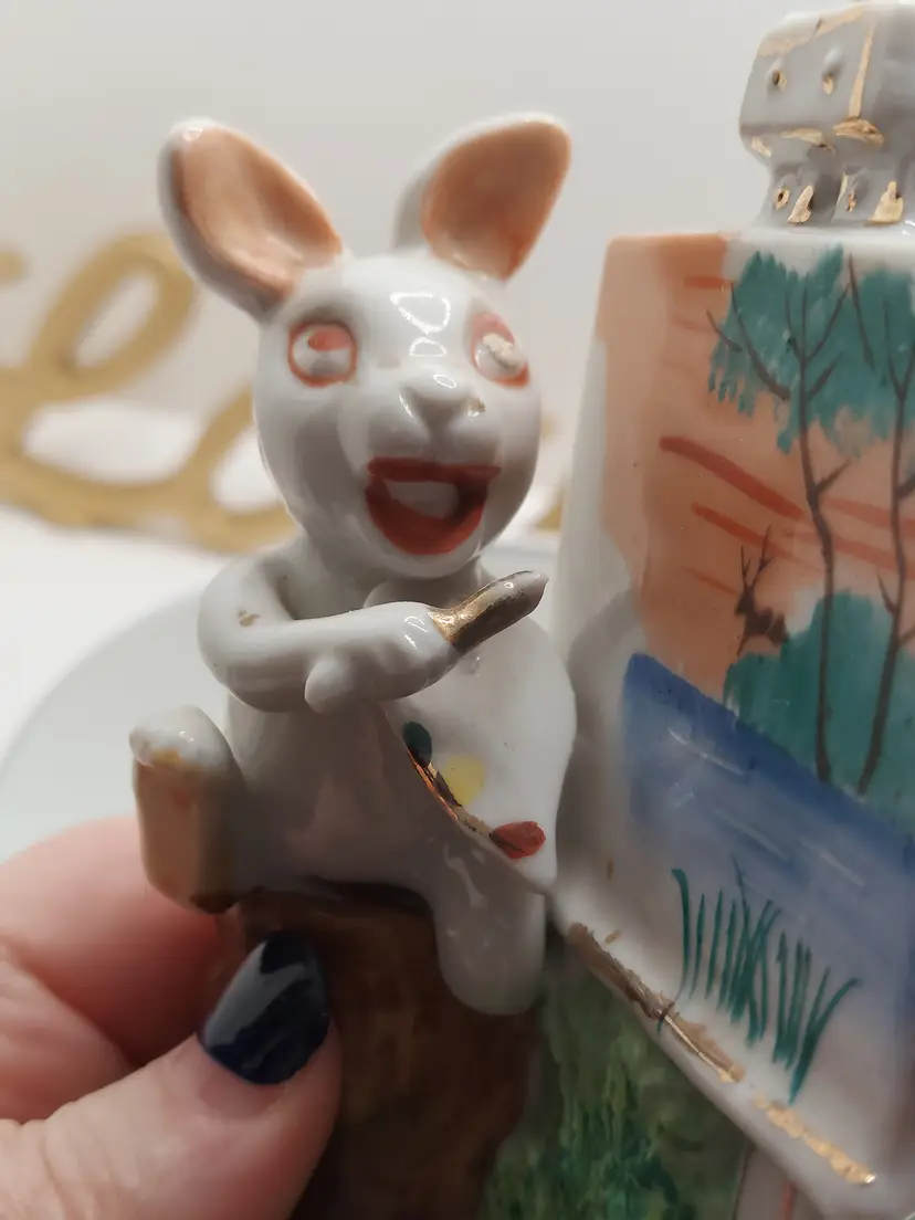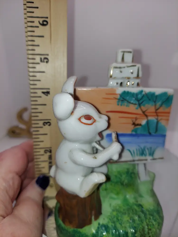 The figurine depicts a white rabbit holding a paint palette and brush. It is about 5 inches tall. It features hand-painted details including pink ears and facial features, that quit frankly are a little creepy!! I can guarantee you will NOT find another 1 of these Figurines that look like this!! If you LOVE the weirdo, bizarre kinda freaky looking things then this is the Bunny Figurine for you to decorate for Easter with, lol! The rabbit is seated next to a landscape painting on an easel. It is marked Made in Japan.