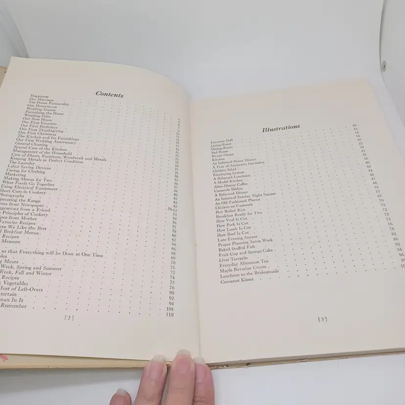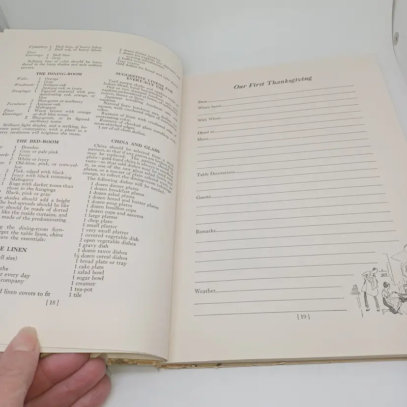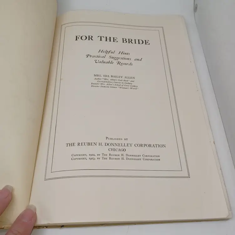 Wonderful antique ad/cookbook!! Rare 1922 hardcover edition of For The Bride Helpful Hints, Practical Suggestions and Valuable Records Book. In well loved condition, pages still intact and holding together well for being over 100 years old.