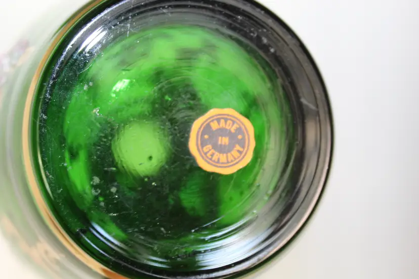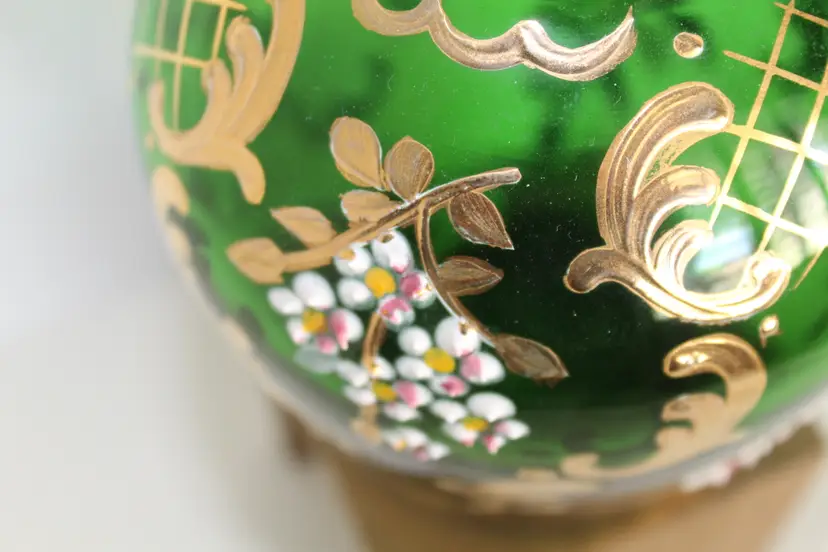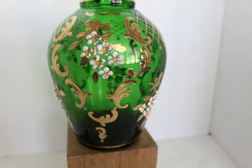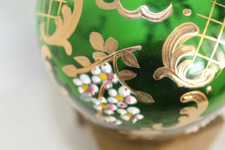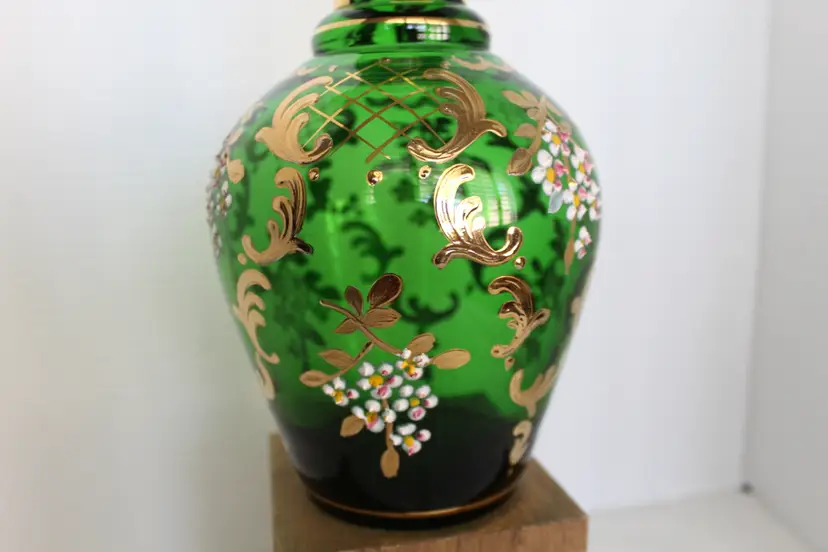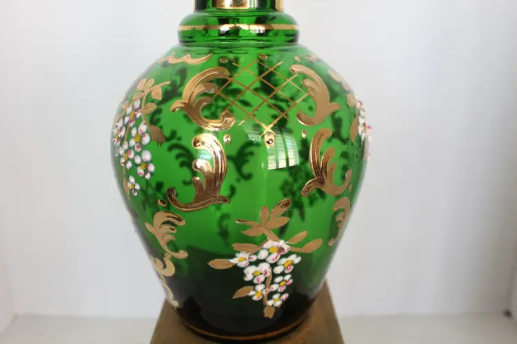 This rare antique German Bohemian bottle green glass decanter features intricate hand-painted gold trim and a beautiful floral pattern. Made in the Victorian style, this hand-blown art glass piece stands at 17 inches tall and weighs 3 pounds and 1.4 ounces. The glossy finish adds a touch of elegance to this unique and collectible item from Germany. Perfect for adding a touch of vintage charm to any home bar or collection.