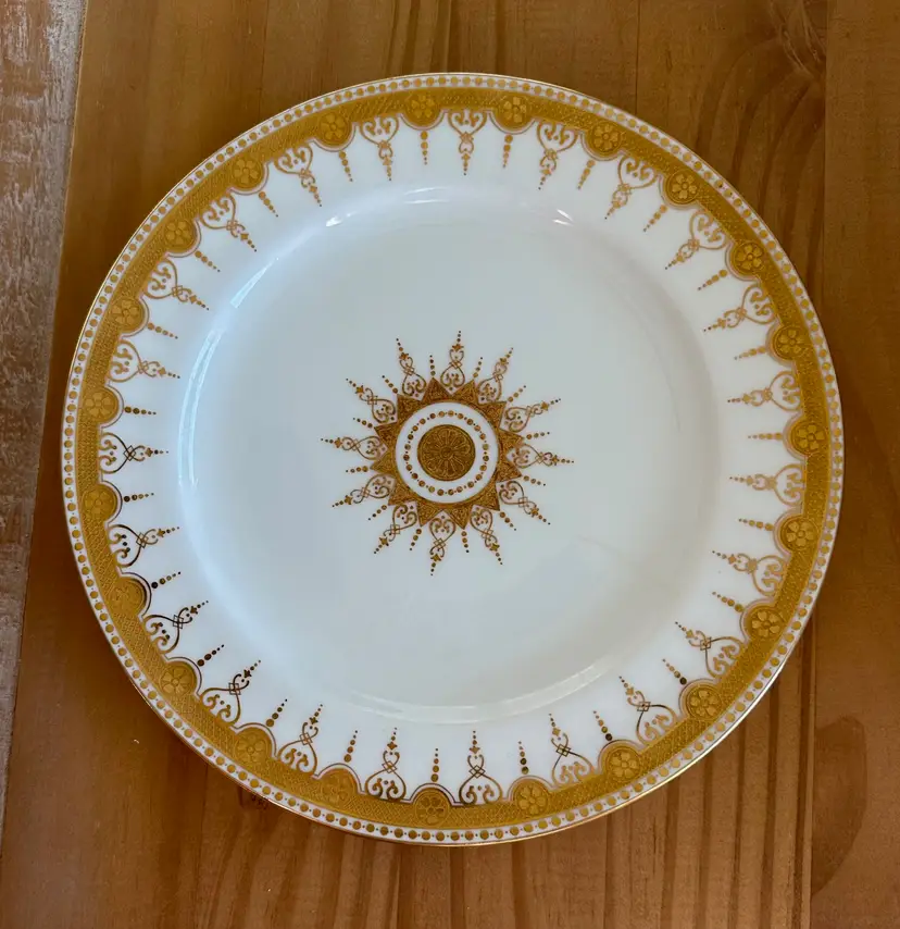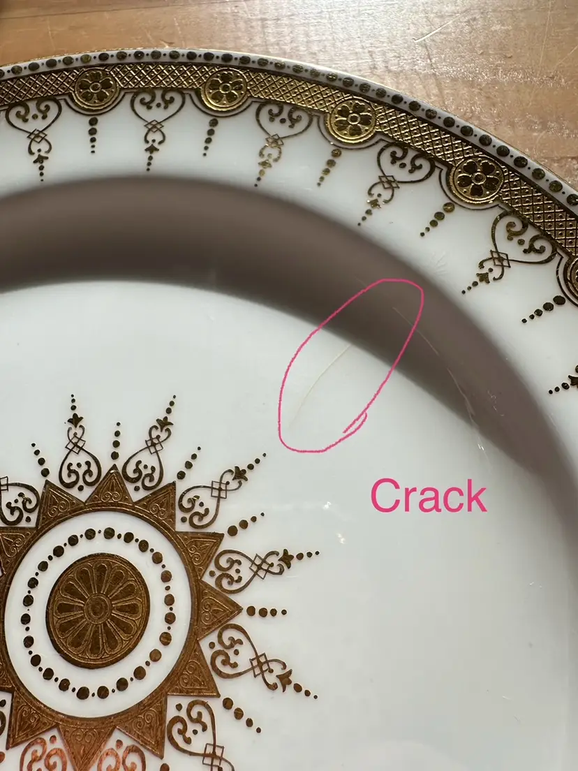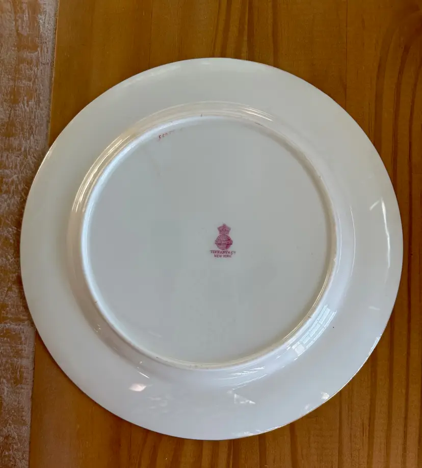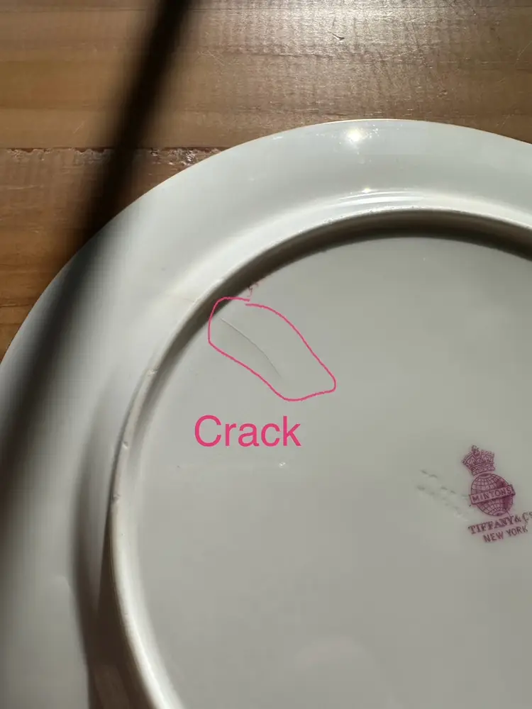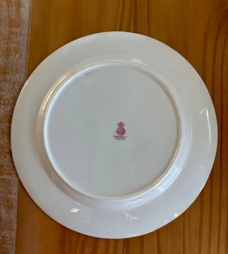 This rare antique Minton serving plate by Tiffany & Co. is a valuable collector's item with a vintage charm. Made of porcelain, this round serving plate is an original piece that adds a touch of elegance to any table setting. Despite a crack on the back, this piece still retains its beauty and would make a unique addition to any dinnerware collection or display. Its all-occasion design and hand wash care instructions make it a practical and timeless piece for any kitchen or dining room.