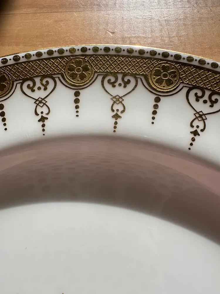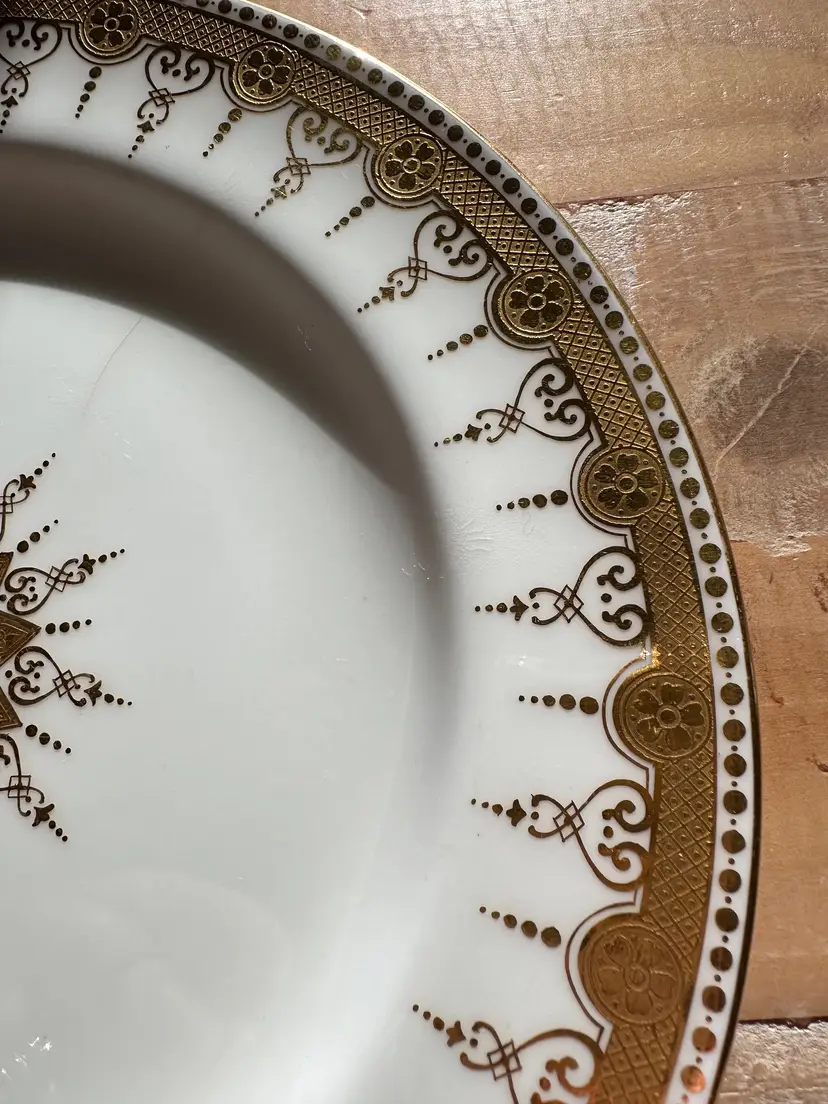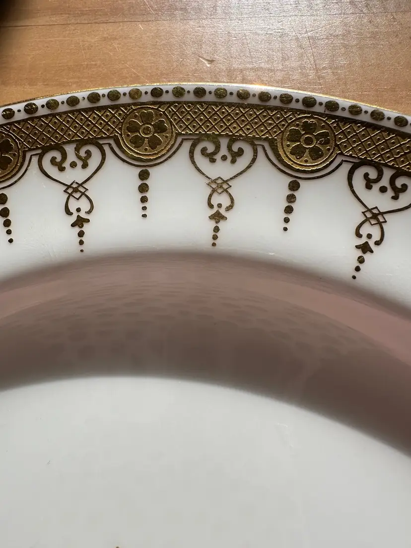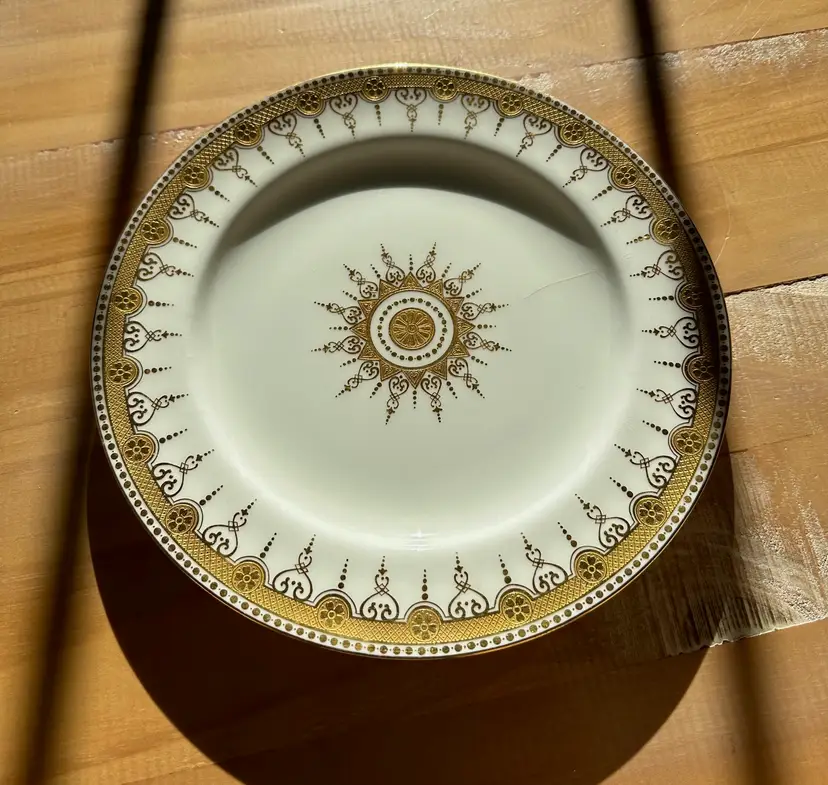 This rare antique Minton serving plate by Tiffany & Co. is a valuable collector's item with a vintage charm. Made of porcelain, this round serving plate is an original piece that adds a touch of elegance to any table setting. Despite a crack on the back, this piece still retains its beauty and would make a unique addition to any dinnerware collection or display. Its all-occasion design and hand wash care instructions make it a practical and timeless piece for any kitchen or dining room.