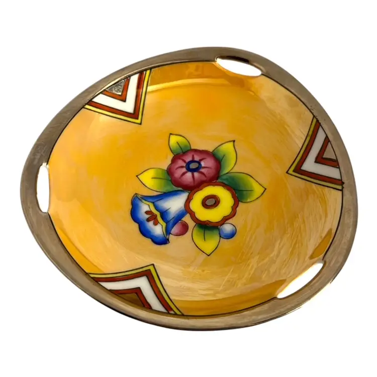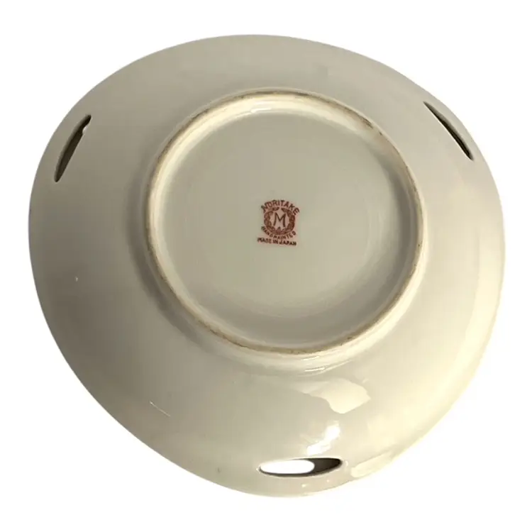 The metallic rim is designed with elegant cut-out handles, enhancing both functionality and aesthetic charm. The bowl's hand-painted floral motifs, gold trim, and cut-out handles are characteristic of Noritake's Art Deco designs from the 1920s and 1930s. The underside bears the Noritake M Hand Painted Made in Japan stamp, confirming its authenticity as a high-quality Noritake piece. A fantastic addition for collectors of vintage Japanese ceramics or those who appreciate fine craftsmanship.