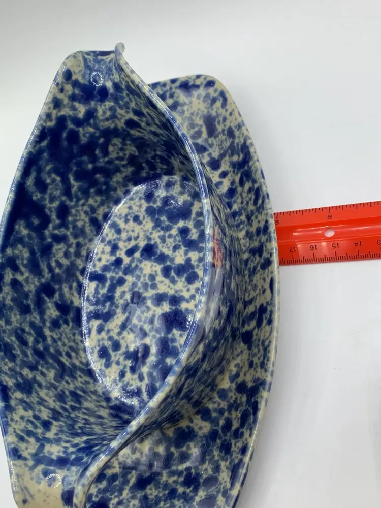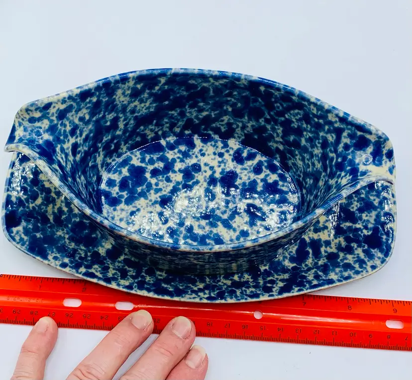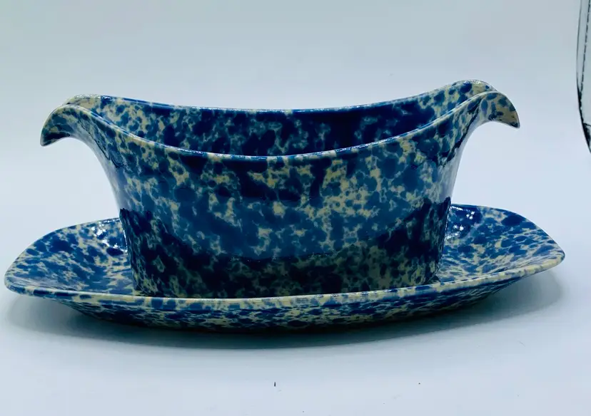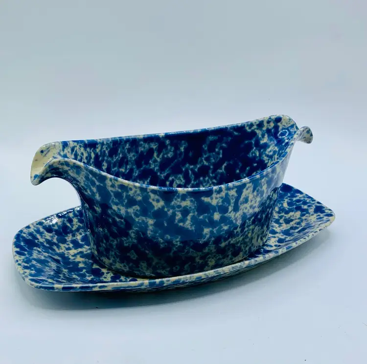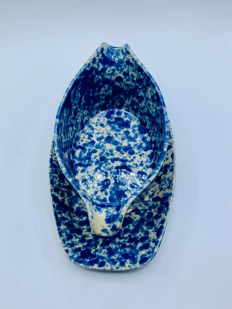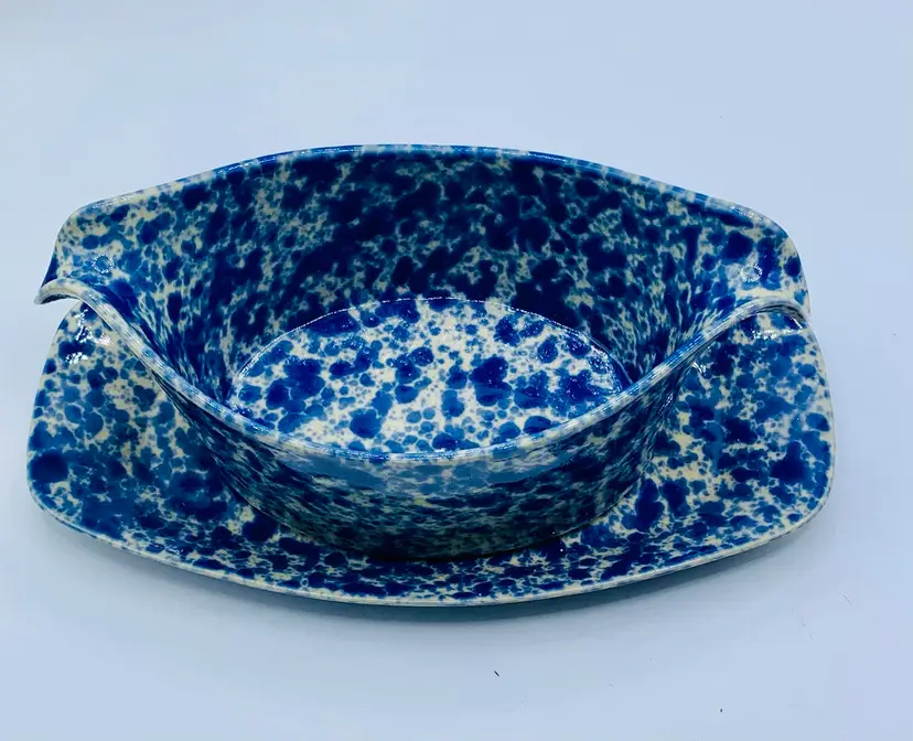 The RARE Bennington Potters 1681 Sauce/Gravy Boat is a vintage stoneware piece with a unique Agate pattern in Morning Glory Blue with White. This oval-shaped gravy boat stands at 9 inches tall and comes with an attached underplate, making it perfect for all occasions. Produced by Bennington Potters in Bennington, VT, this farm-style piece features a glossy finish and an impressed backstamp, adding to its charm and authenticity.