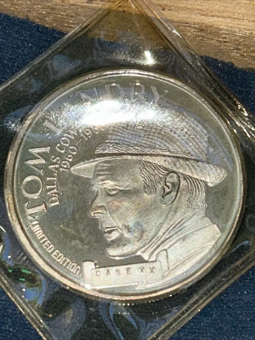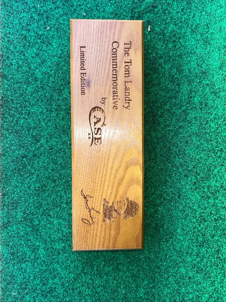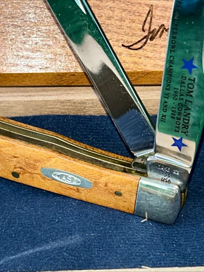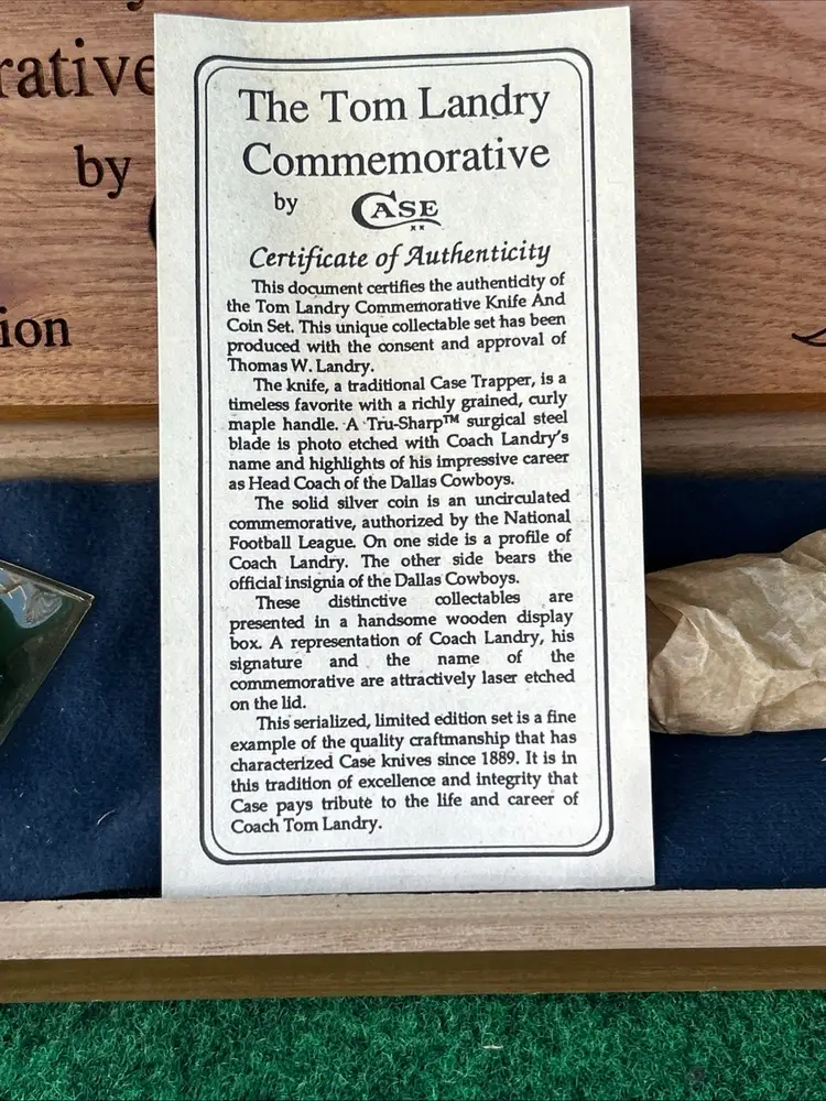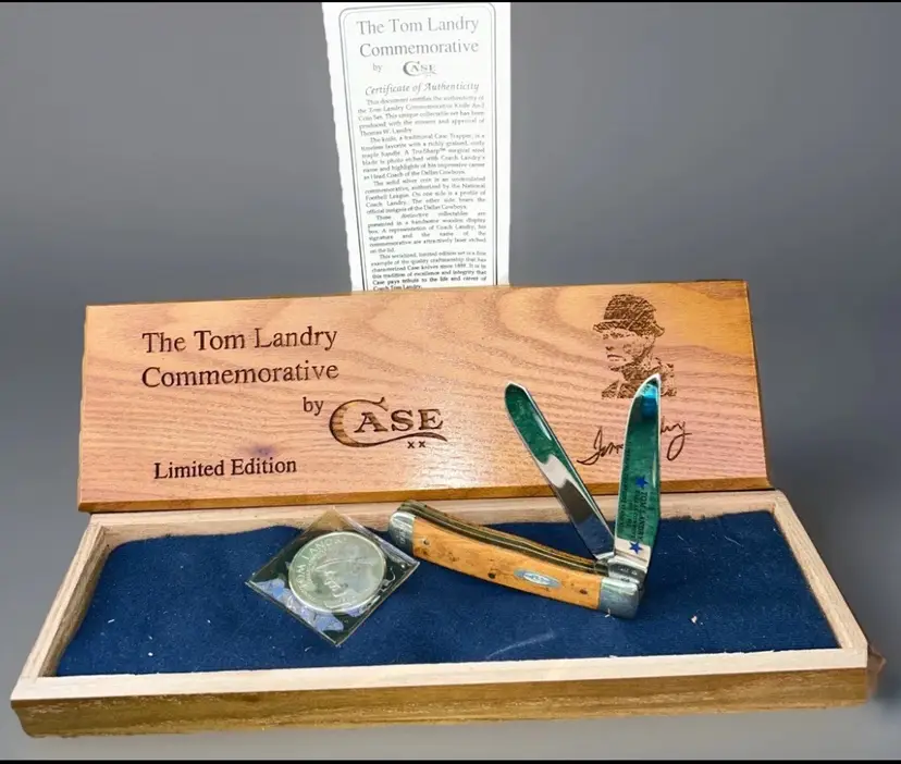 The Case Tom Landry Commemorative LTD Edition Pocket Knife is a high-quality, ambidextrous pocketknife with a 2.76 - 4 inch stainless steel blade featuring a clip point and spey point. The brown handle is made of wood and the knife has a manual opening mechanism with a slipjoint lock type. This limited edition knife, part of the Case XX product line, is a unique and original collectible for knife enthusiasts. It includes a challenge coin and is made in the United States. Excellent shape!