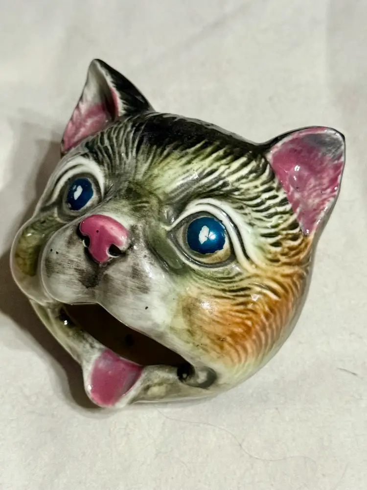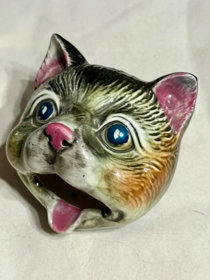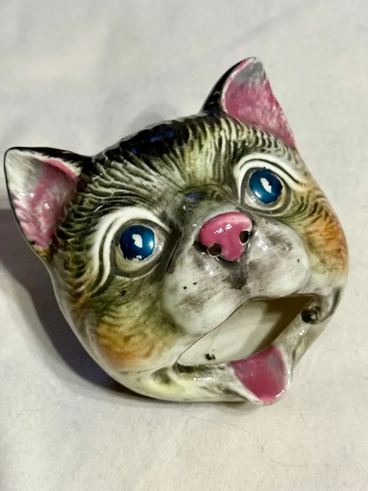 This vintage Enesco ceramic cat head incense burner/ashtray is a rare and quirky collectible. Beautifully hand-painted with vibrant details — including striking blue eyes, pink ears, and tongue — this whimsical figural cat head is designed so that smoke flows through the nostrils when incense is burned, creating a fun and eye-catching effect.