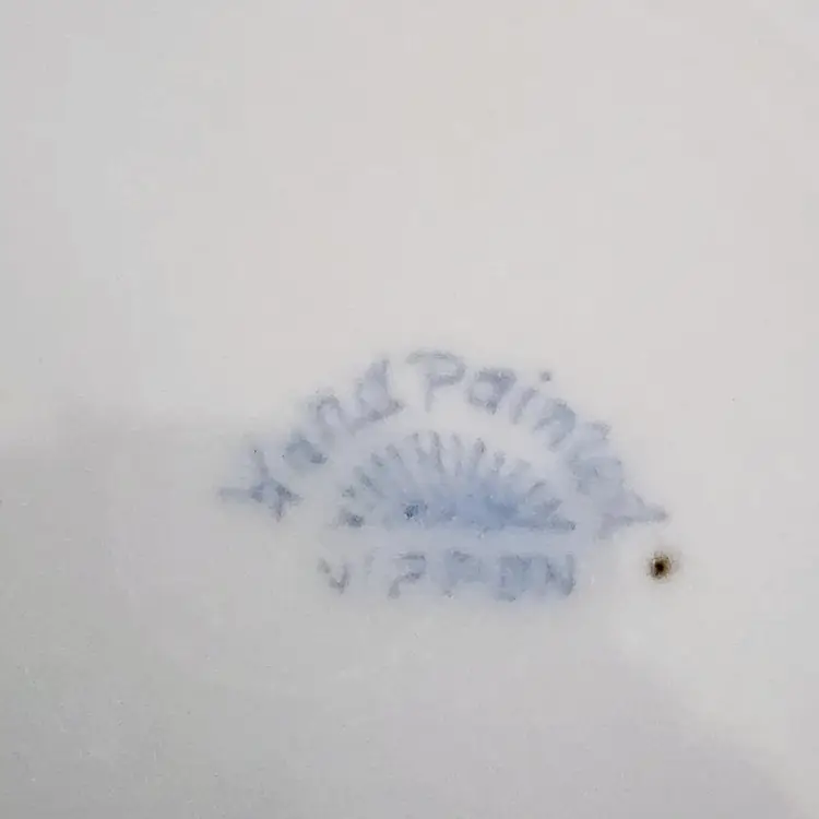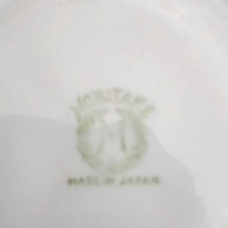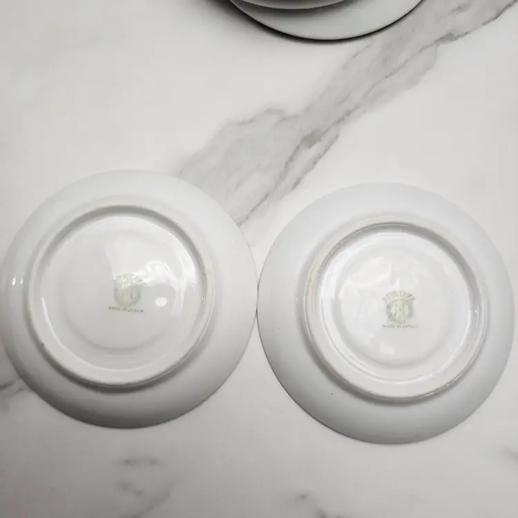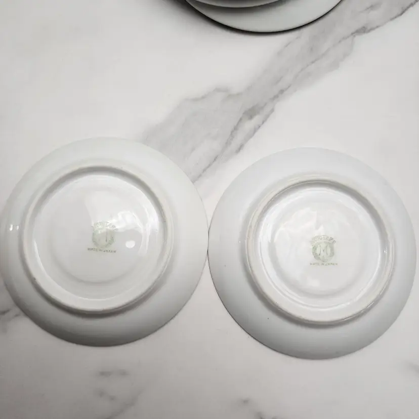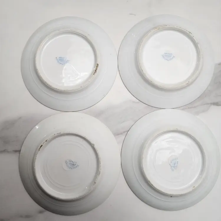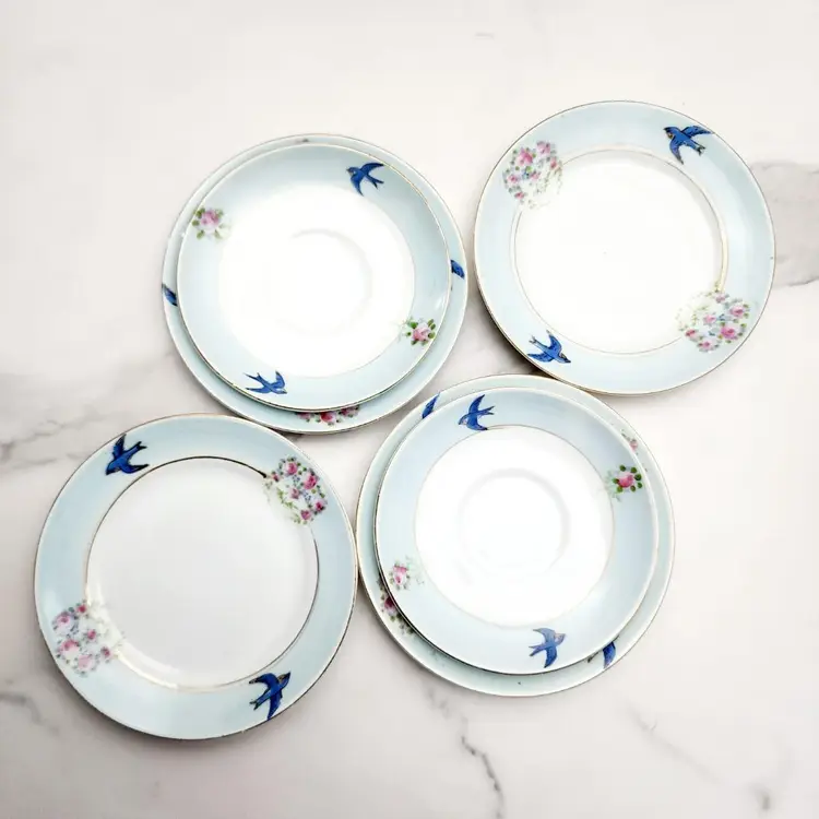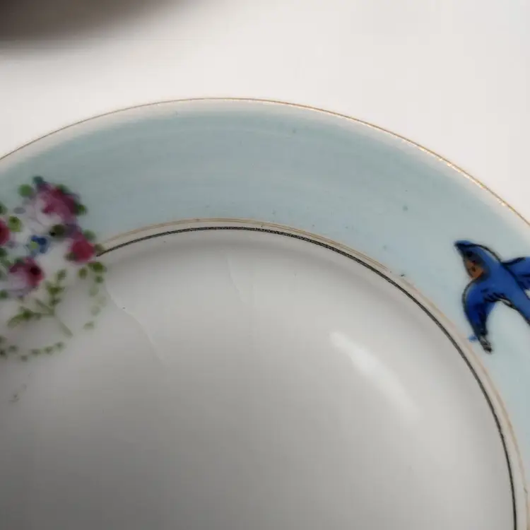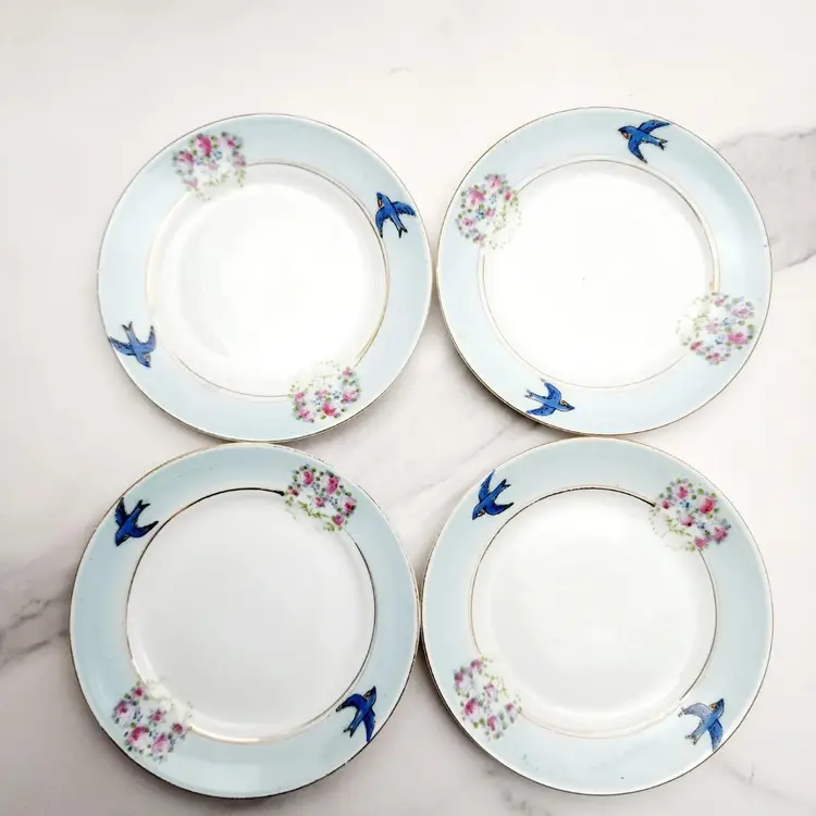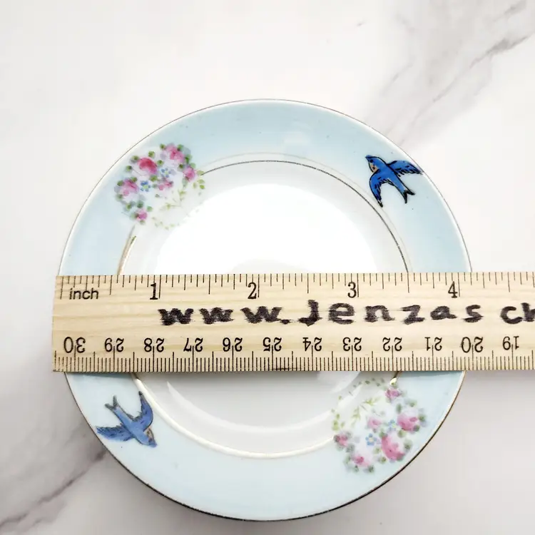 Cute Mismatch set of vintage Nippon & Noritake. The 4 Butter Pats (or coasters) are mark Nippon Handpainted while the 2 saucers are marked Noritake. The plates are approx 4in wide the saucers 3 3/4 ins. All are trimmed with Gold (fading) and delicate baby blue band around edges. Decorated with flying bluejays and pink roses.
