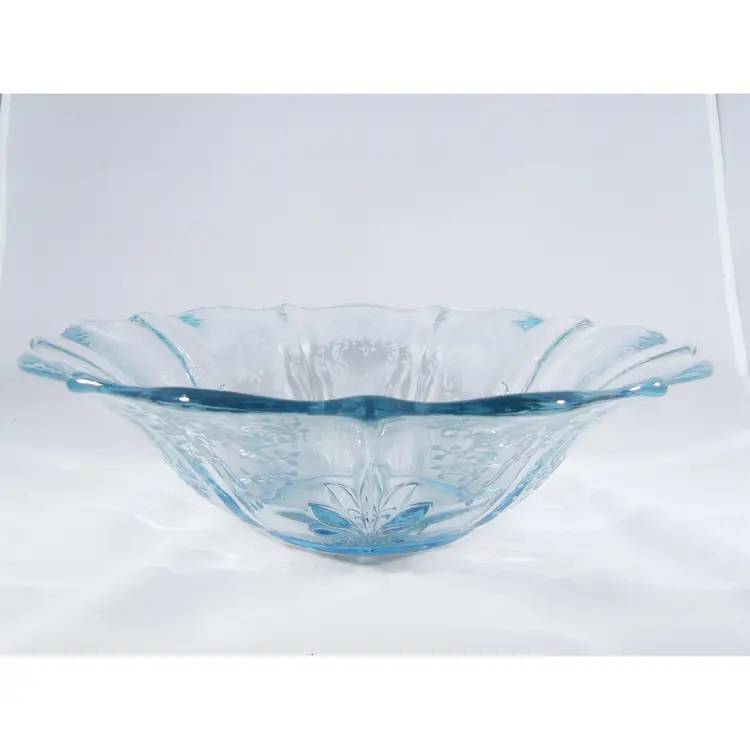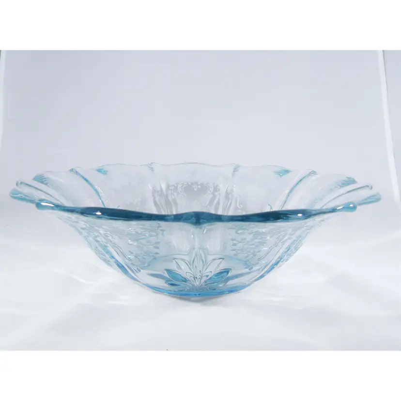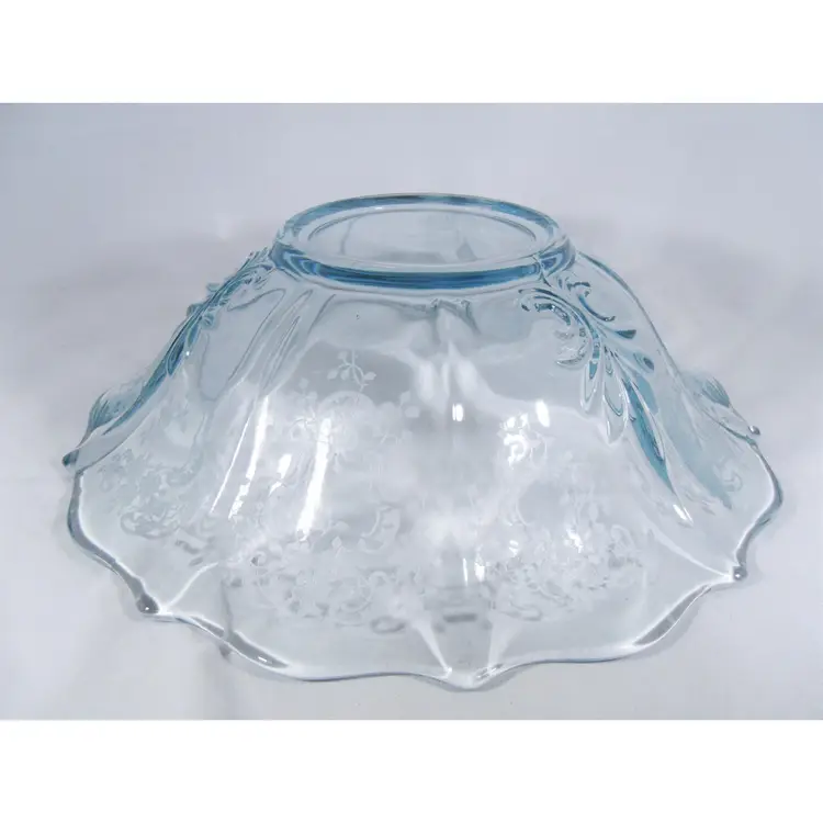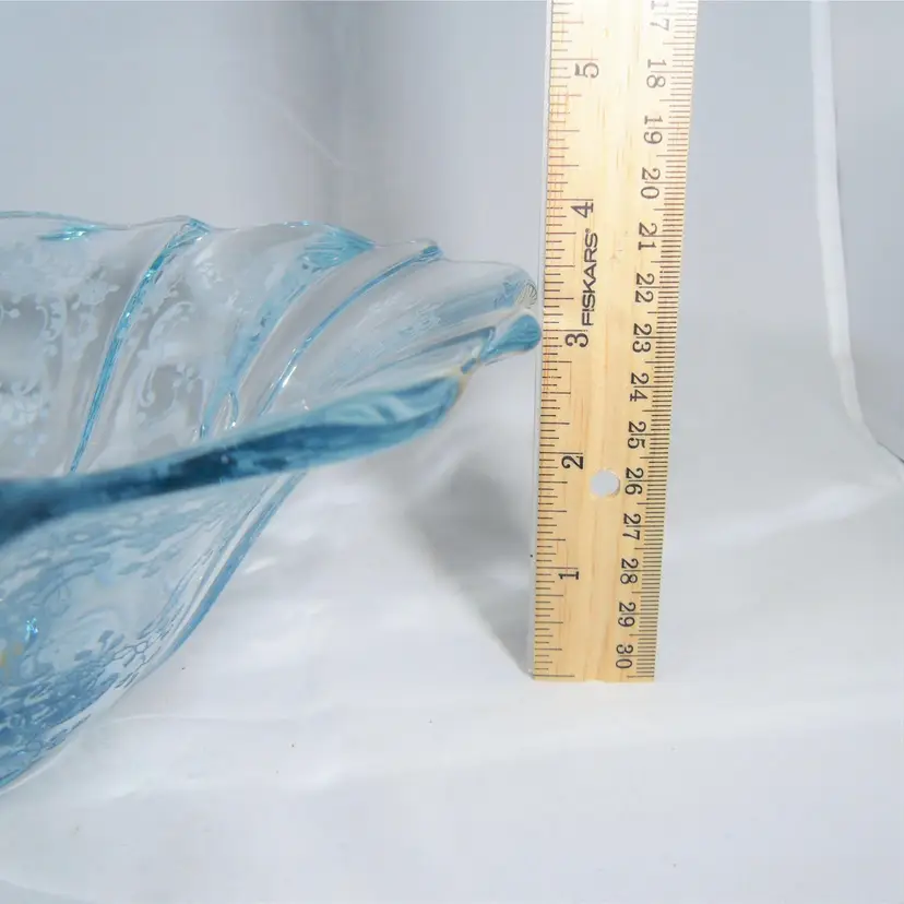 You are looking at a gorgeous piece of Fostoria. This is a console or serving bowl in the Meadow Rose pattern. The clear is more easily found but the blue is what makes this a rare piece. There is a small chip on the outside on one of the raised glass details. See photos for details on measurements and condition. I am an experienced glass shipper and will pack and ship this item with care. Thank you.