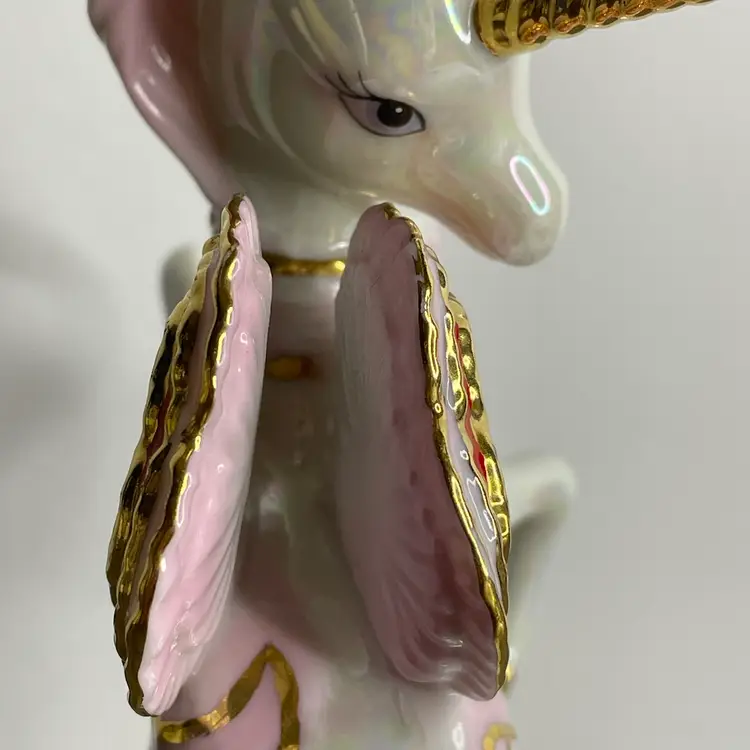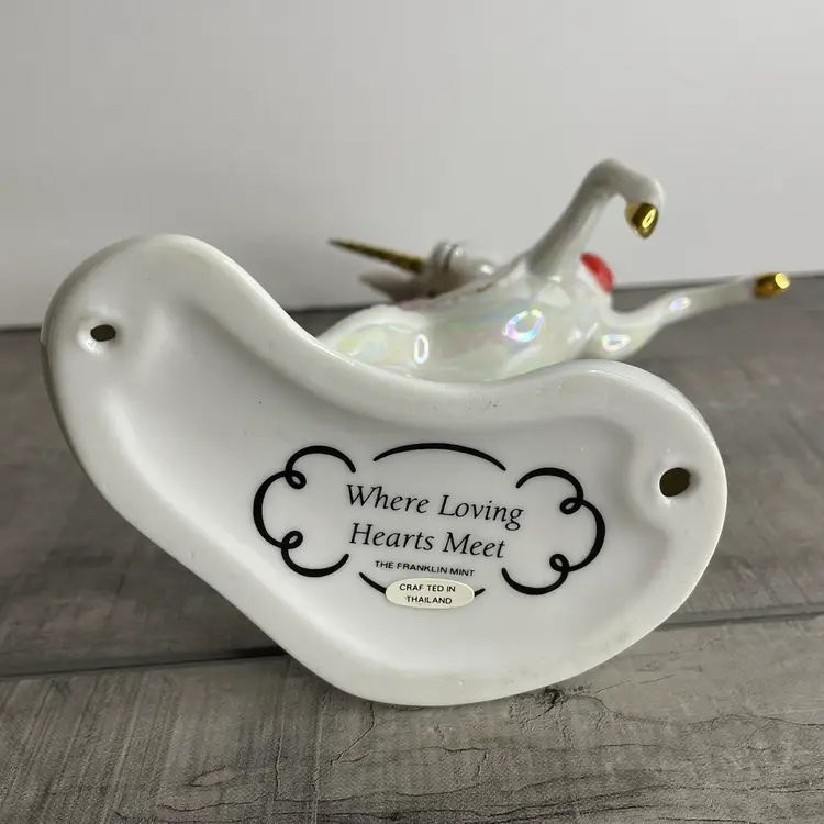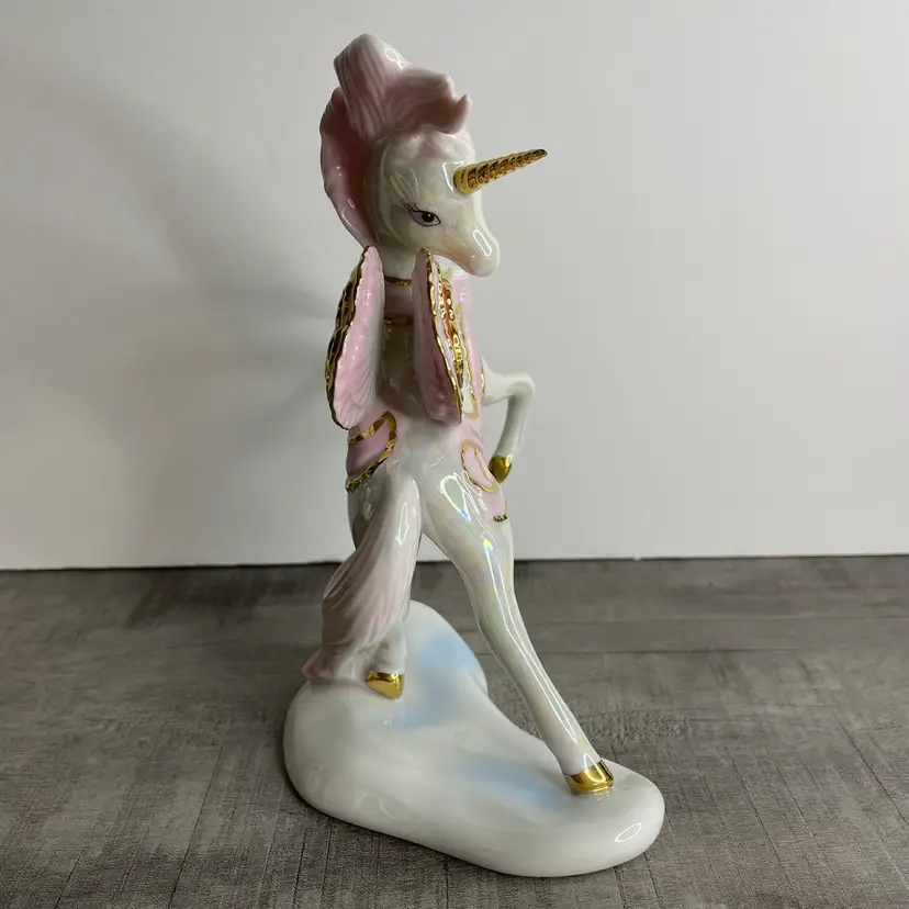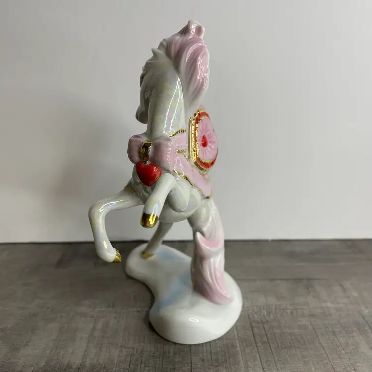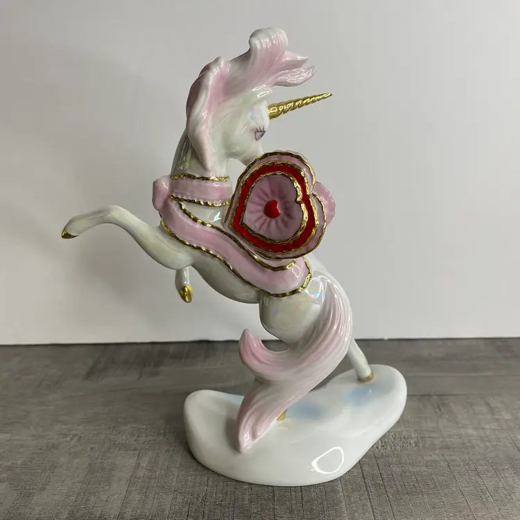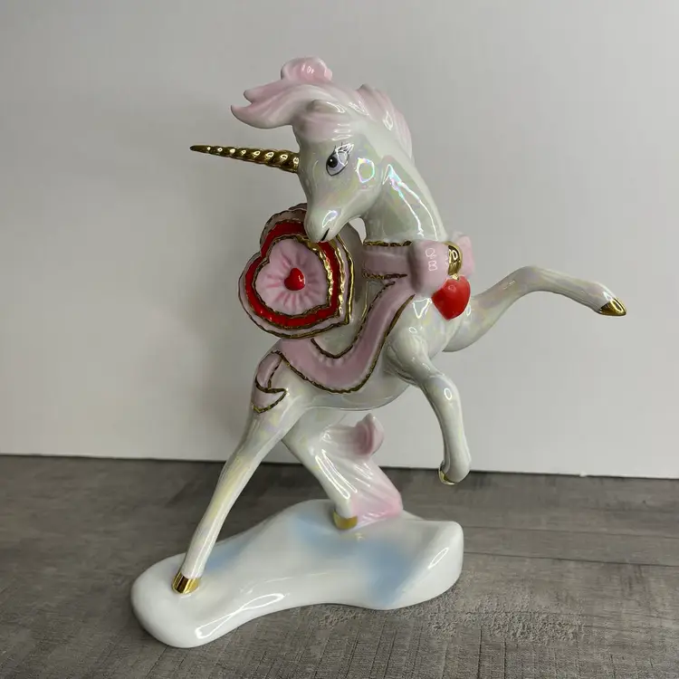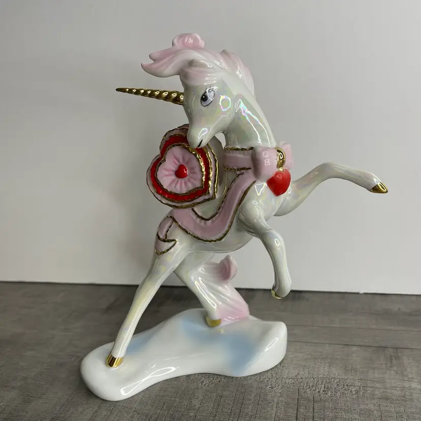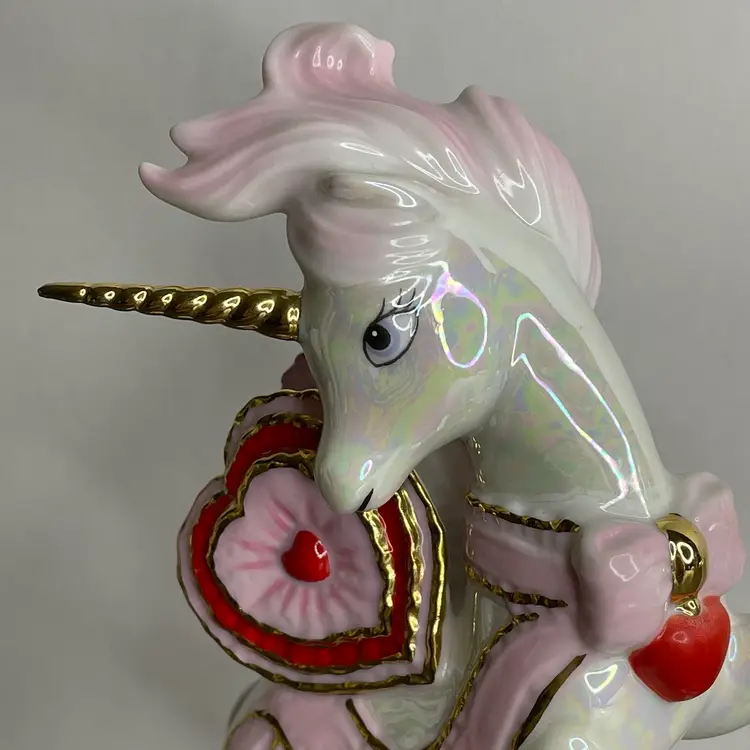 Rare FRANKLIN MINT Collectible Unicorn Figurine “Where Loving Hearts Meet” featuring a beautiful Iridescent glaze with Pink Hearts. Stands approximately 6 inches high and the base is 4 inches wide. No original box or paperwork.