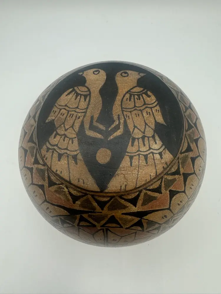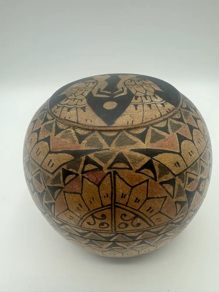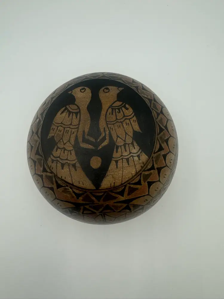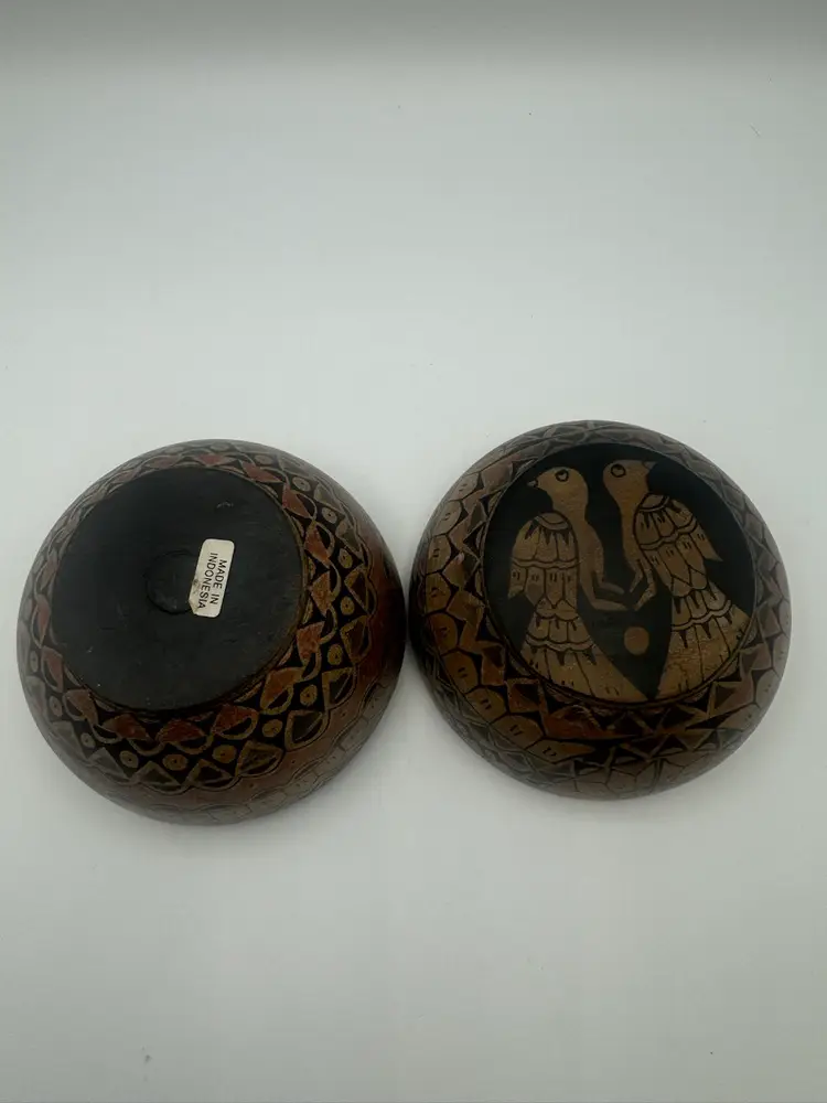 This exquisite hand-made wood box is a rare find, crafted in Indonesia with intricate hand-painted details. The round shape and medium size make it a perfect addition to any room, while the multicolor design and bird subject add a touch of whimsy. The box is an original piece and features a painted finish, making it a unique and collectible item. Beautiful vintage condition. No chips or cracks. Measures 4 1/4” X 5”