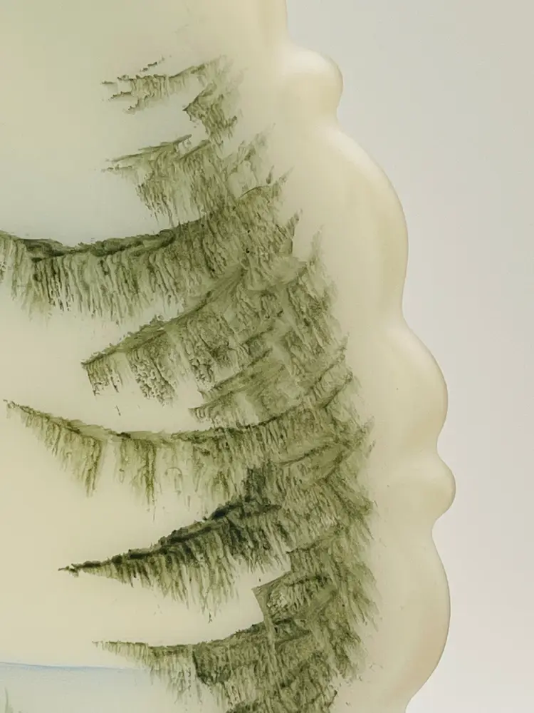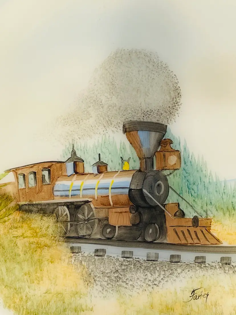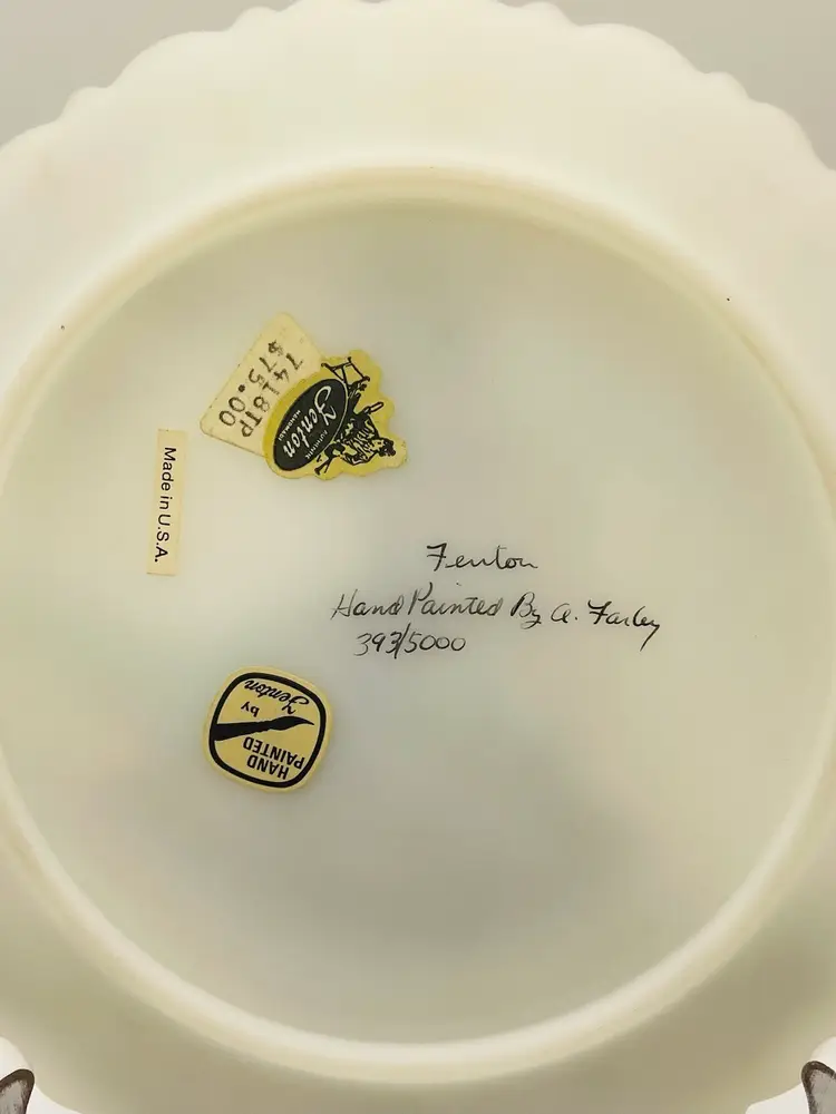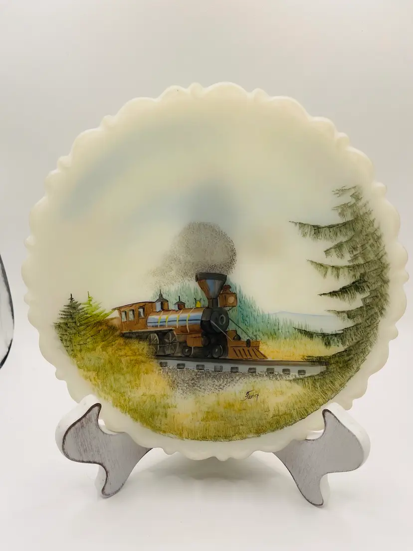 Rare, hand painted, artist signed, satin glass, Fenton train plate. This beautiful piece features a scalloped edge, and had a hand painted steam engine making it’s way down the tracks through the woods. This is signed A. Farley (Fenton Artist Alice Farley) and is numbered 393/5000 made. It measures 8 inches across, and all of its original stickers are intact (this has the Hand Painted by Fenton sticker, the original Fenton sticker with the product number and original price tag, and the Made in USA stickers). There are no chips or cracks. Don’t miss out on this piece for your collection!